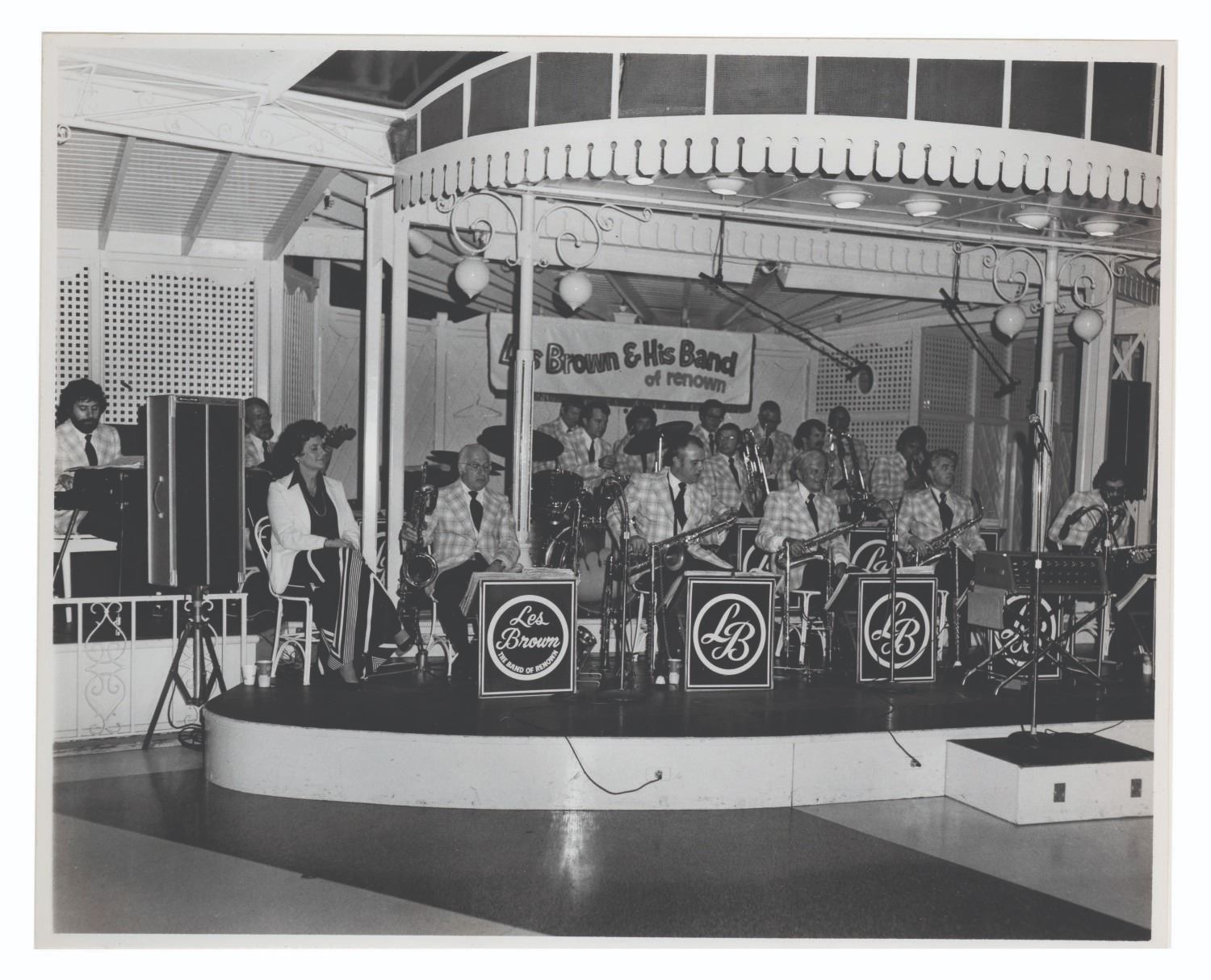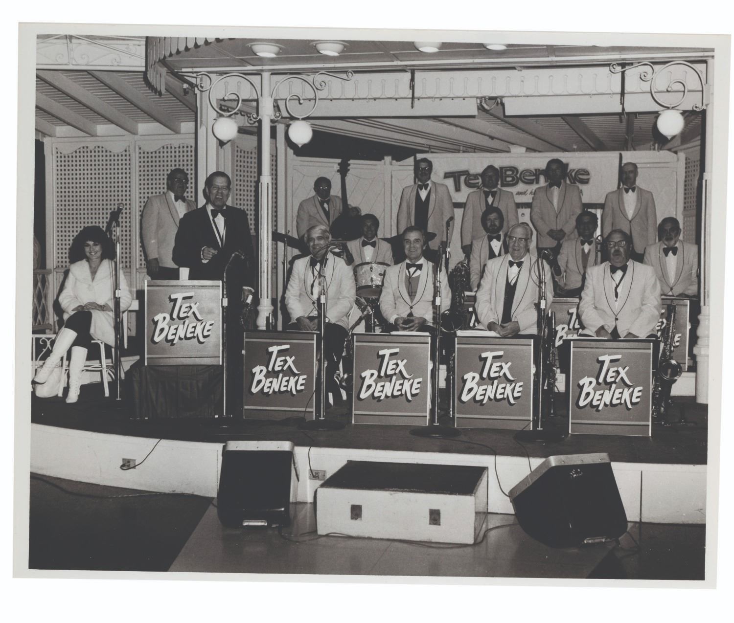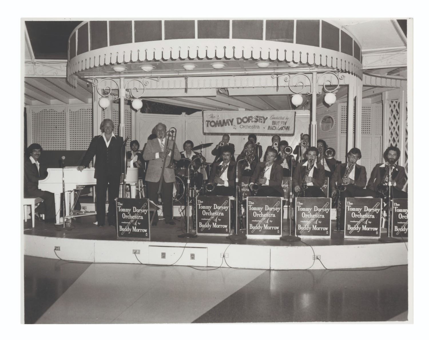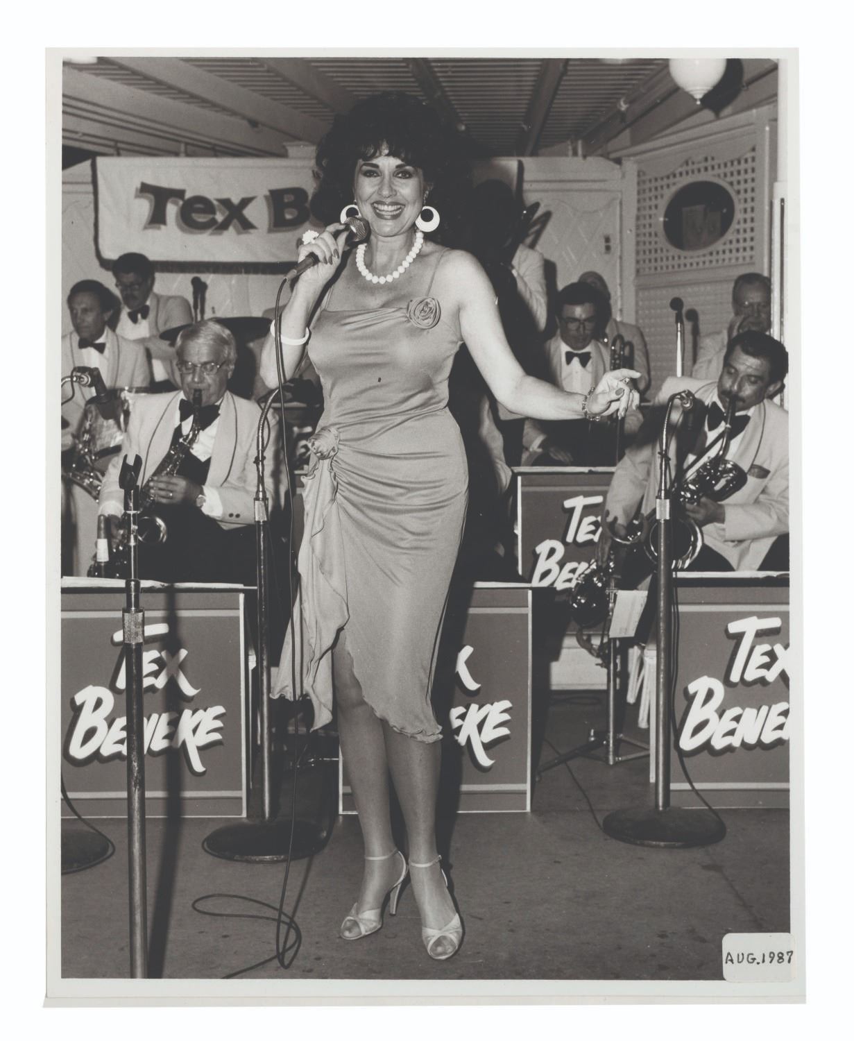 (Disneyland, 1970s-80s) A large collection of 55 press photos promoting the entertainment at Carnation Plaza Gardens in Disneyland. Included are headshots and Disneyland images of jazz musicians and Big Band leaders Count Basie, Lionel Hampton, Tex Beneke, Bob Crosby, Les Brown, and more. The collection is presented within a 10.5"x11.75"x2" three-ring binder. Measuring 8"x9.75" to 7.75"x10", each photo print is in good-to-very good condition exhibiting light wear from handling and age.