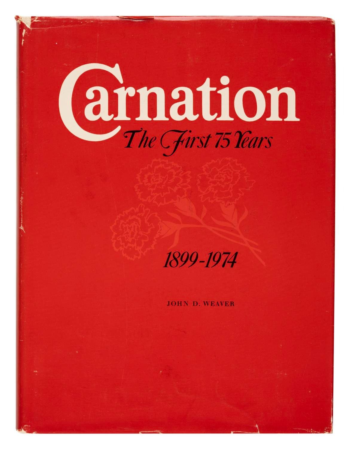 (Carnation, 1974) A Carnation: The First 75 Years book, chronicling the company from 1899-1974. Measuring 8.75” x 11.25”, the 253-page hardcover book displays in good condition with creases, scratches, and wear.