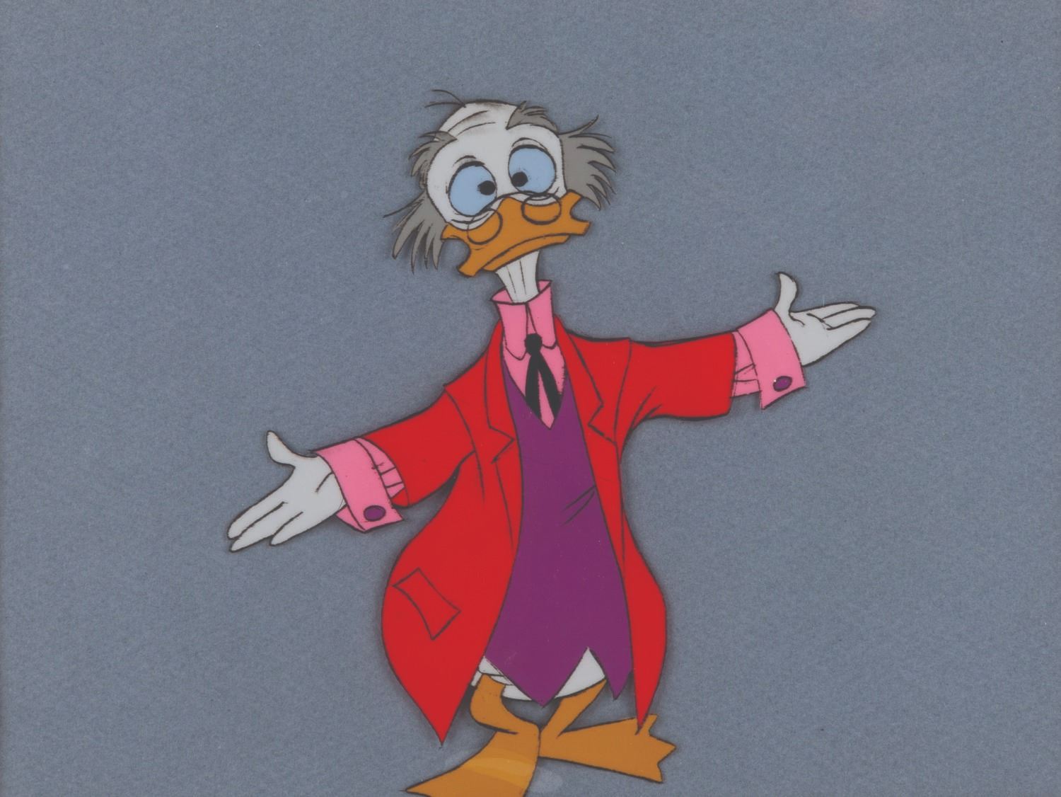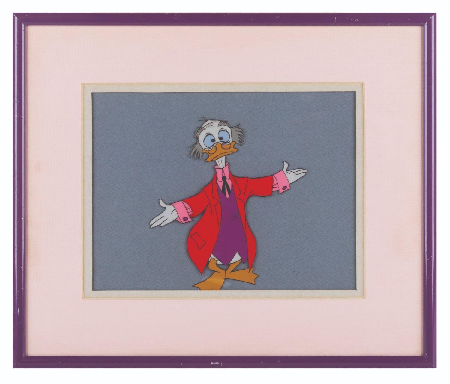 (Disney, 1962) An original production cel of Ludwig Von Drake from the "Walt Disney’s Wonderful World of Color” episode "Carnival Time.” Ludwig has an image size of 5.5” x 5.25” on a 6” x 8.5” visible cel. The entire matted piece measures 11.25” x 13.25”. The piece is in very good condition with light warping from age and a light scuff to the frame.