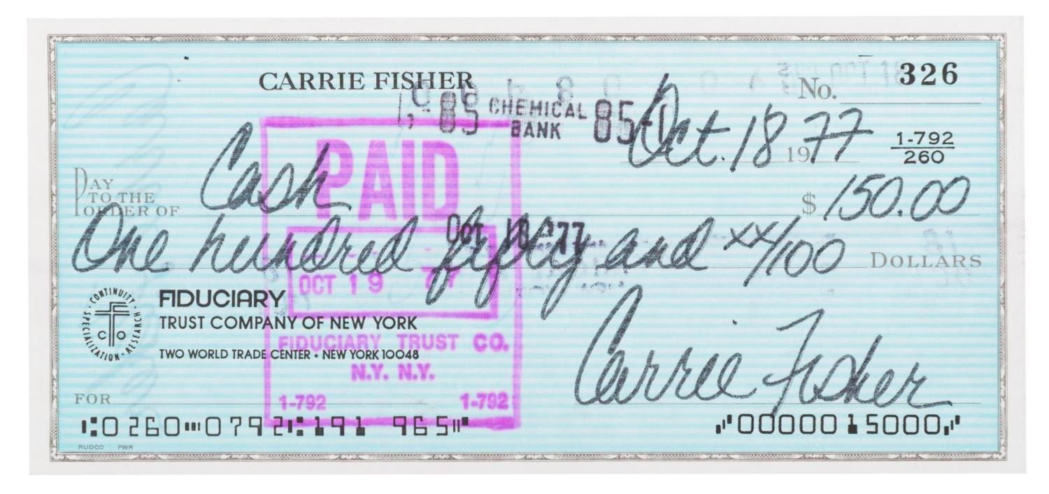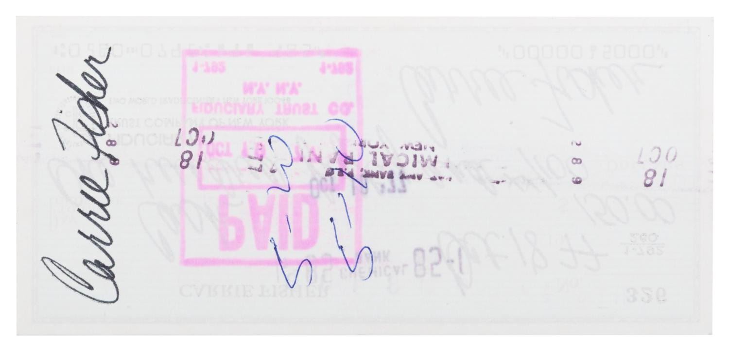 (Fisher, 1977) A personal check boldly signed on front and back by actress Carrie Fisher. Dated October 18th, 1977, the check is just over five months after the first "Star Wars " film opened and introduced the world to Princess Leia. Measuring 2.75 " x 6 ", the signed check is in fine condition.