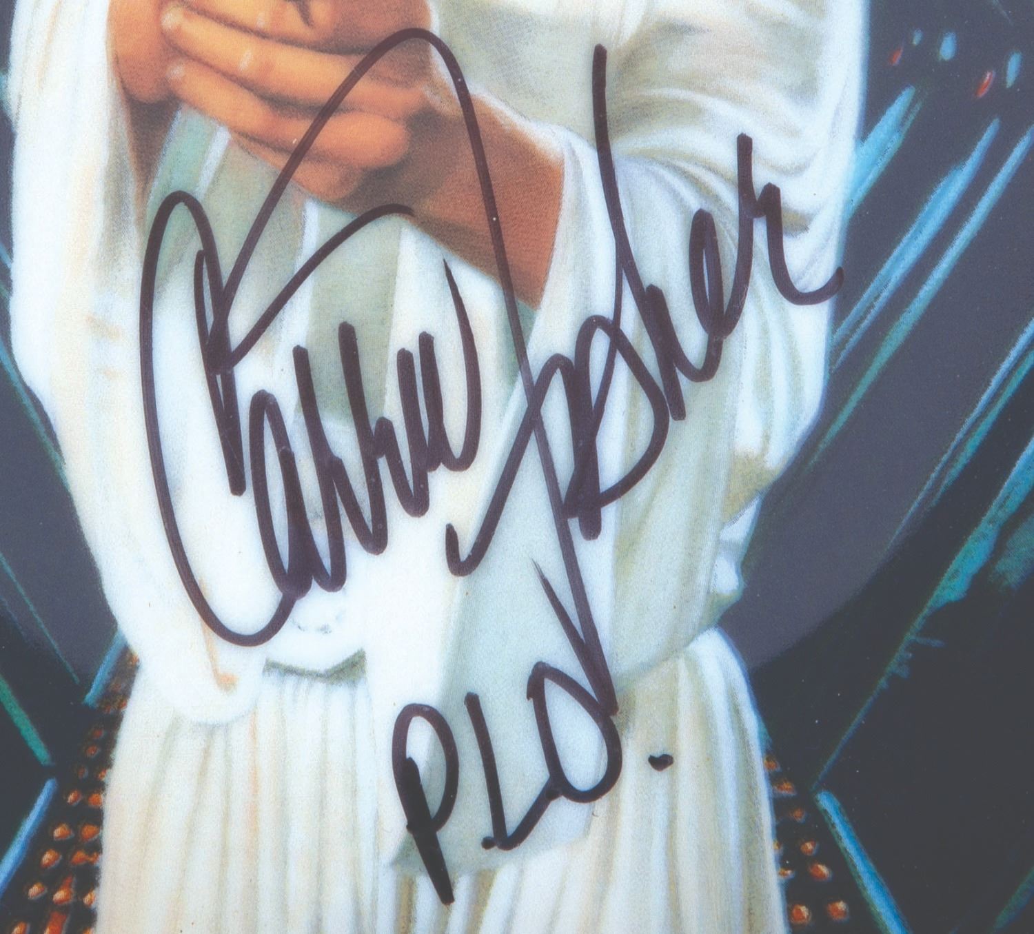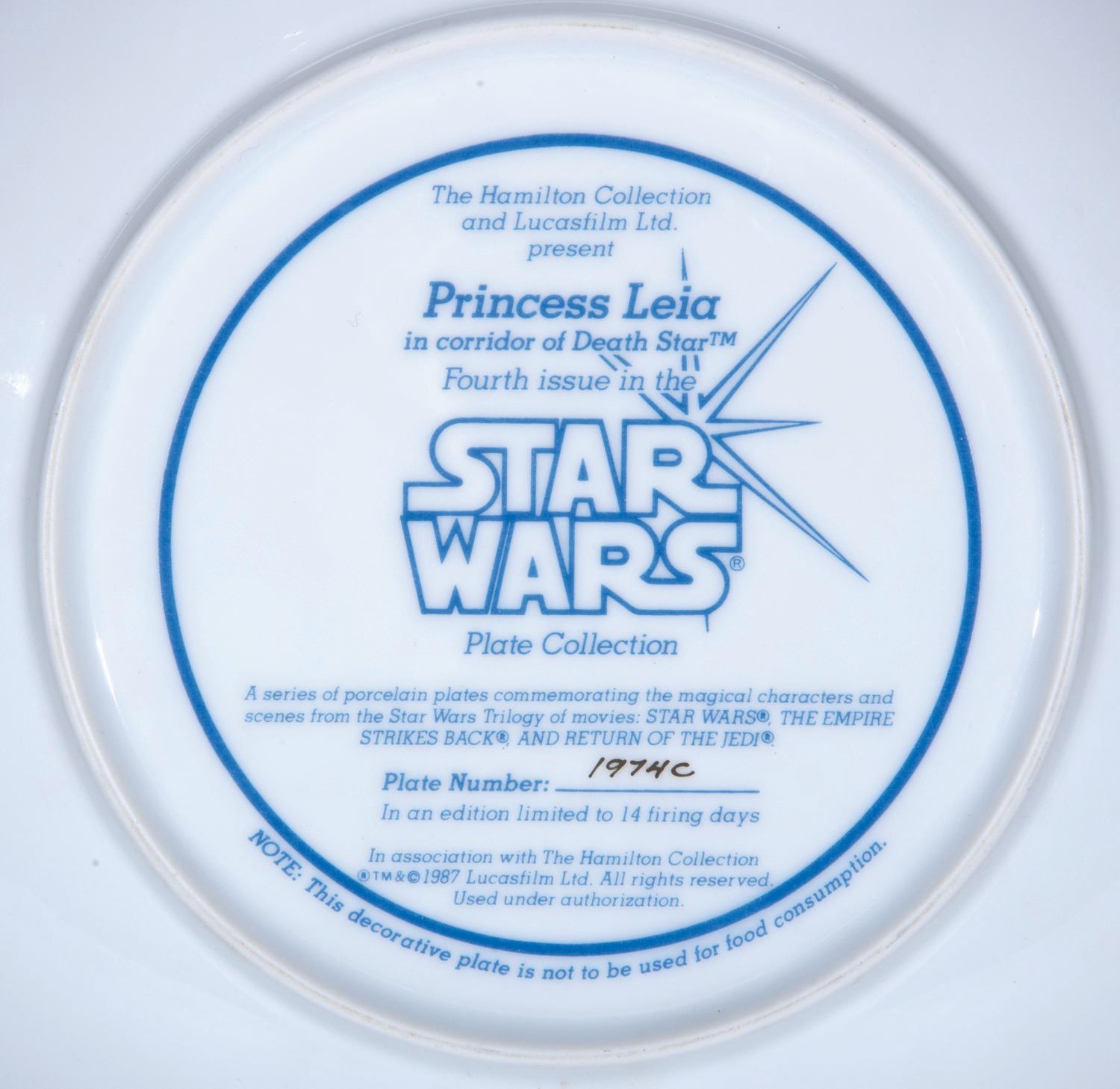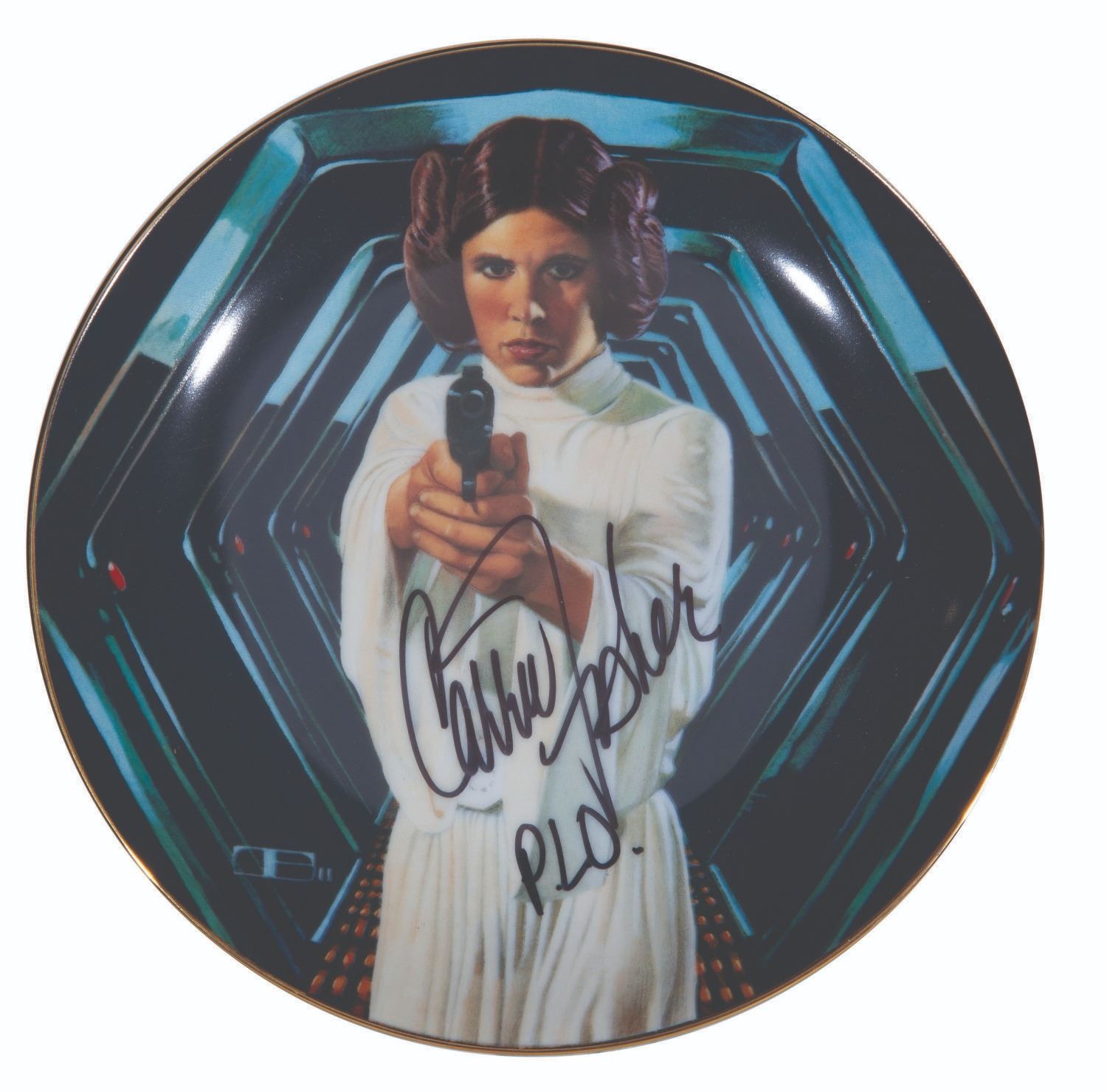 (Lucasfilm/Hamilton Collection, 1987) A commemorative collectible plate of Princess Leia, signed by actress Carrie Fisher."Princess Leia in Corridor of Death Star" is identified on the back as the 4th in the Star Wars Plate Collection. Fisher signed the plate boldly and added the initials P.L.O. for Princess Leia Organa. Measuring 8.5" in diameter, the plate is in fine condition.