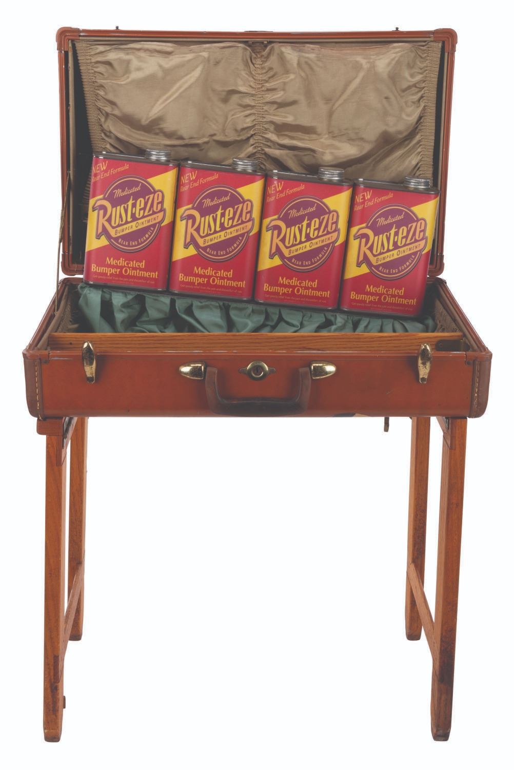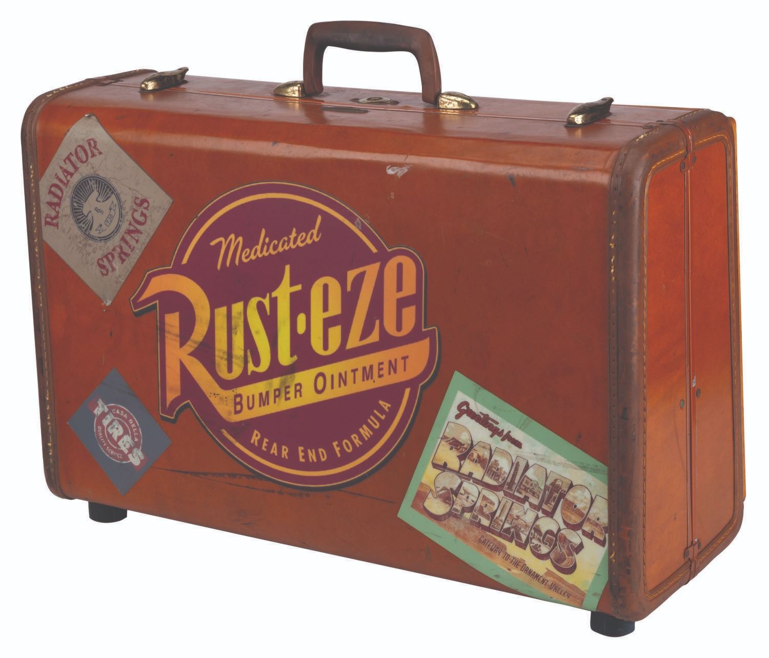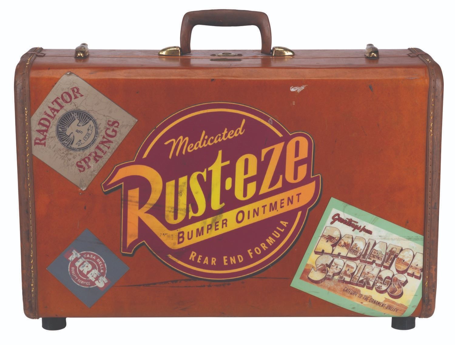 (Disney's California Adventure, 2012) A "Rust-Eze Bumper Ointment" traveling salesman case prop from Cars Land in Disney's California Adventure. The case is decorated with stickers from Radiator Springs and Casa Della Tires and contains four cans of Rust-Eze as seen in the popular Pixar "Cars" films. Measuring 21.25" x 13.75" x 35" high, the display prop is in very good condition with typical and intentional wear.