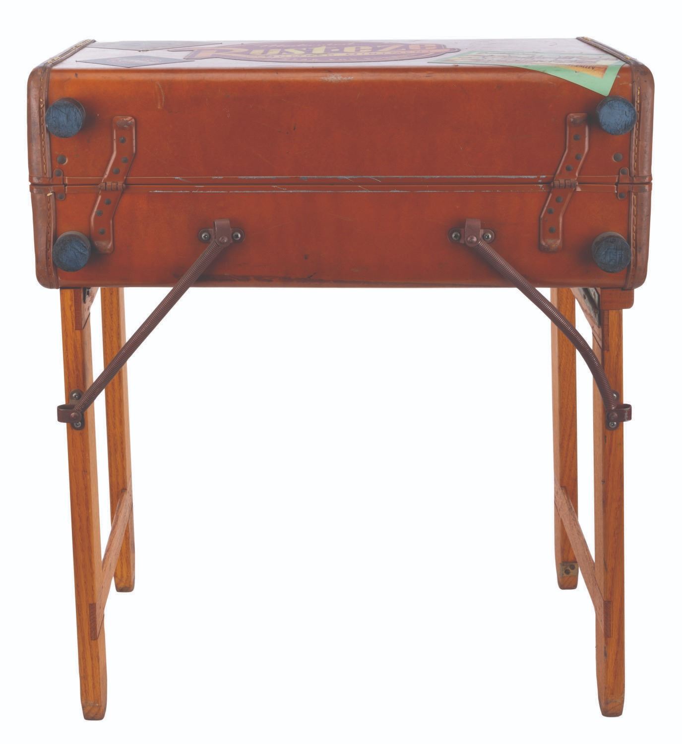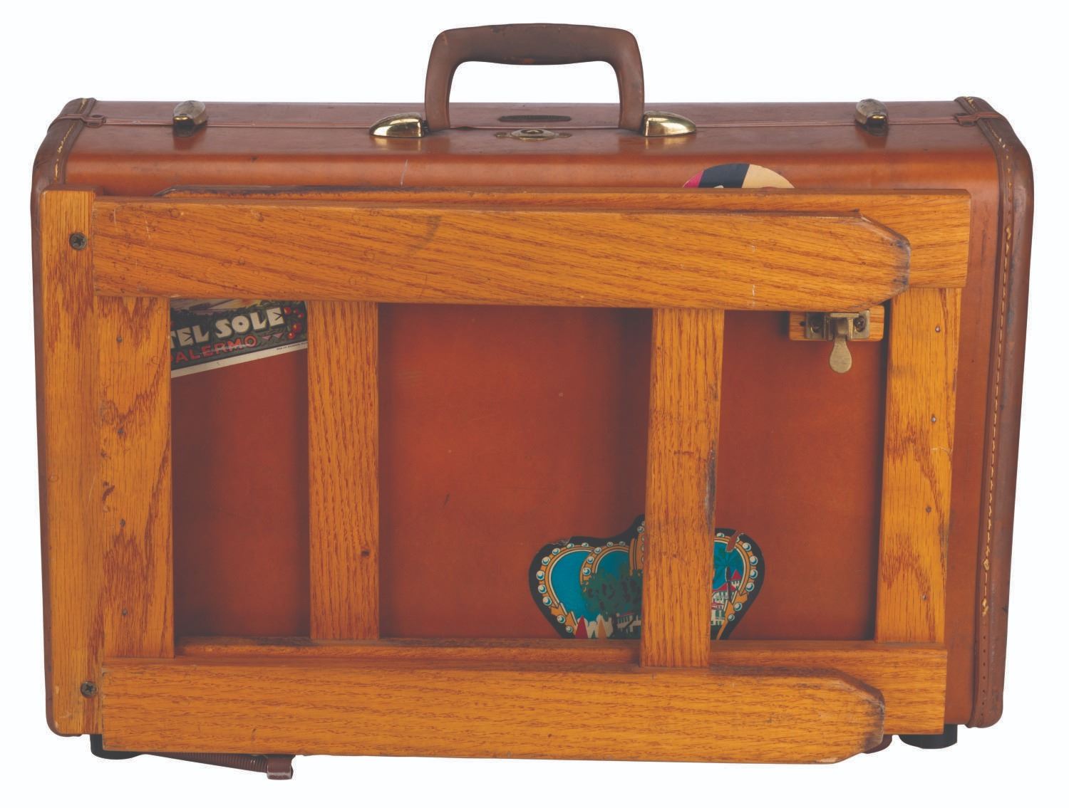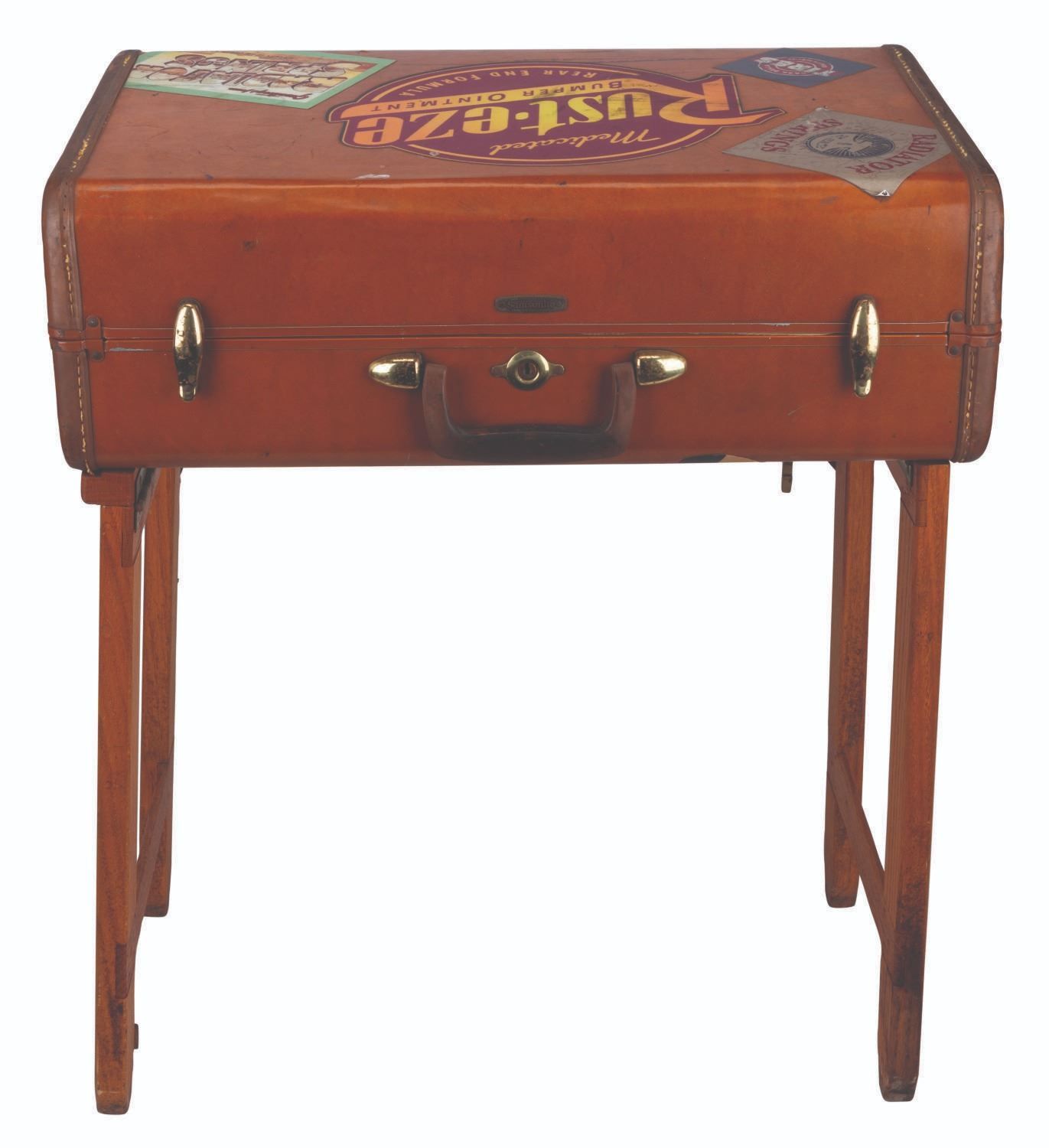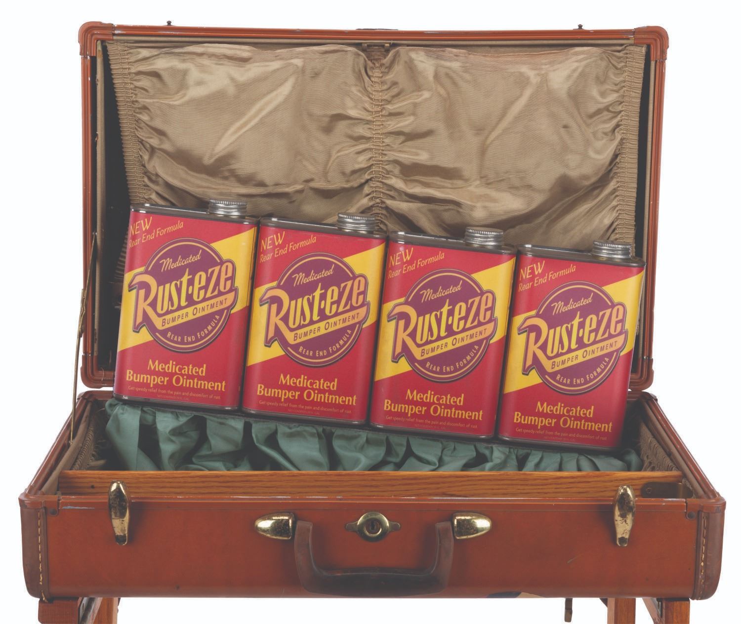 (Disney's California Adventure, 2012) A "Rust-Eze Bumper Ointment" traveling salesman case prop from Cars Land in Disney's California Adventure. The case is decorated with stickers from Radiator Springs and Casa Della Tires and contains four cans of Rust-Eze as seen in the popular Pixar "Cars" films. Measuring 21.25" x 13.75" x 35" high, the display prop is in very good condition with typical and intentional wear.