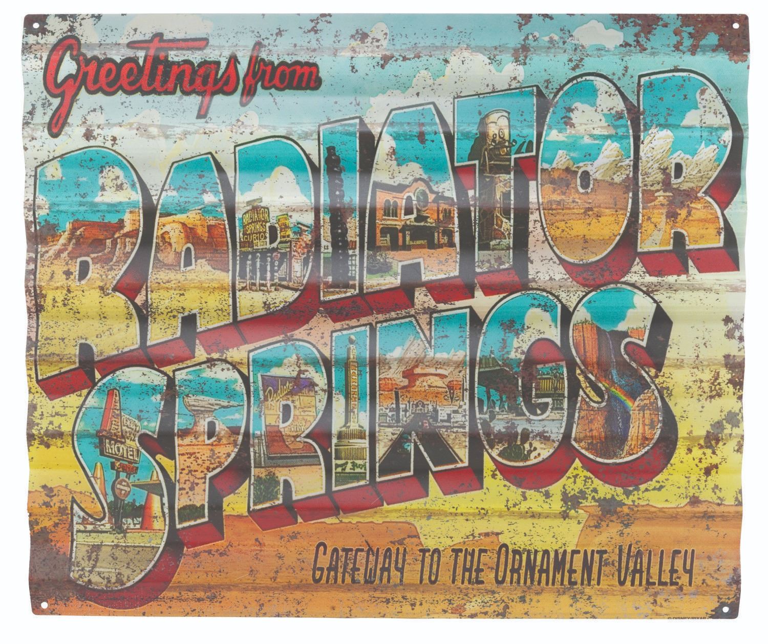 (Disney California Adventure, 2010s) A souvenir metal sign for Cars Land depicting a greeting from Radiator Springs. Measuring 30" x 35", the corrugated metal sign displays in very fine condition with scuffs.