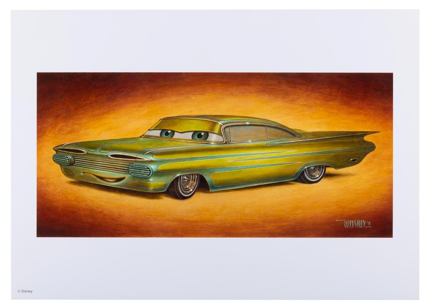 (Disney California Adventure, 2012) A print of Ramon by artist Keith Weesner from the opening year of Cars Land in Disney California Adventure. Measuring 11" x 15.5" with an image size of 6.25" x 13.5", the print is in very good condition with a scratch and a small crease near the reproduction signature.