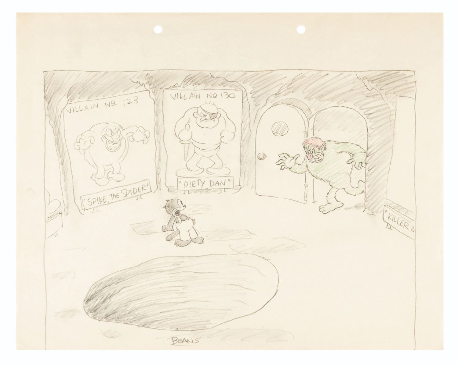 (Schlesinger, 1935) An original layout drawing featuring Beans from the Looney Tunes short “A Cartoonist's Nightmare.” Measuring 9.5” x 12” with an image size of 8” x 10.25”, the graphite and colored pencil drawing is in very good condition with light edge wear and creasing from production use and light discoloration from age.