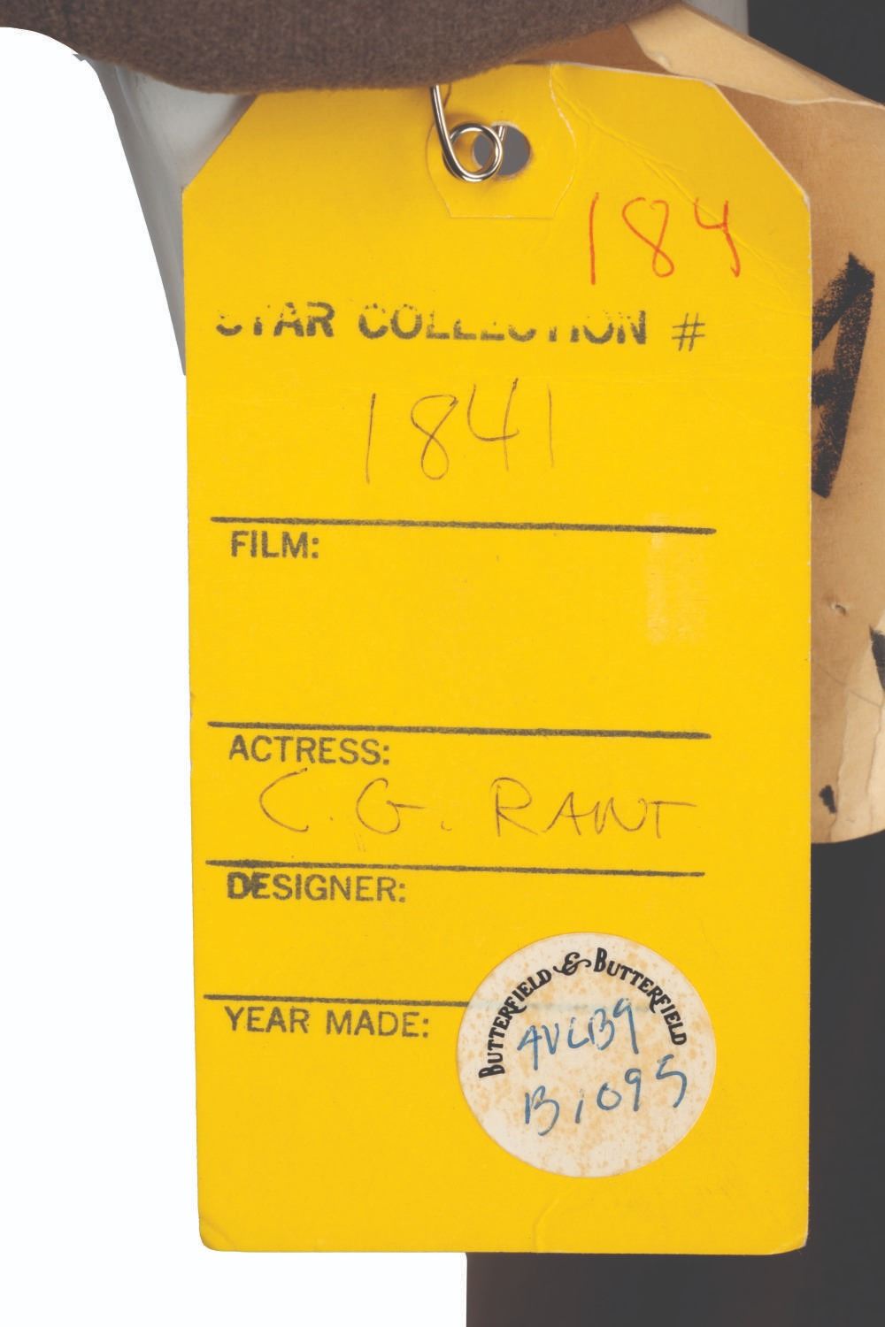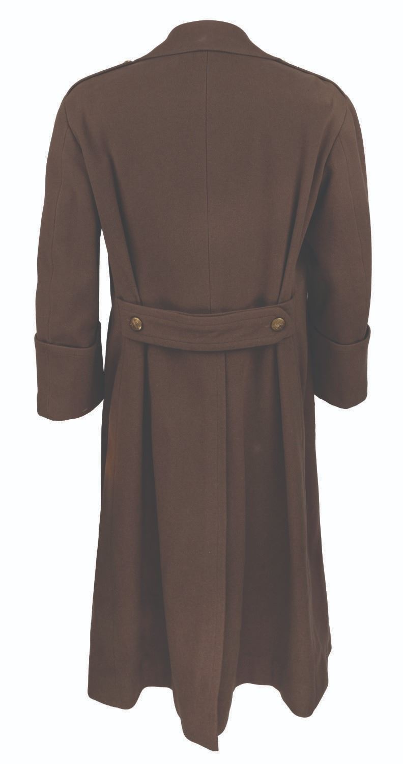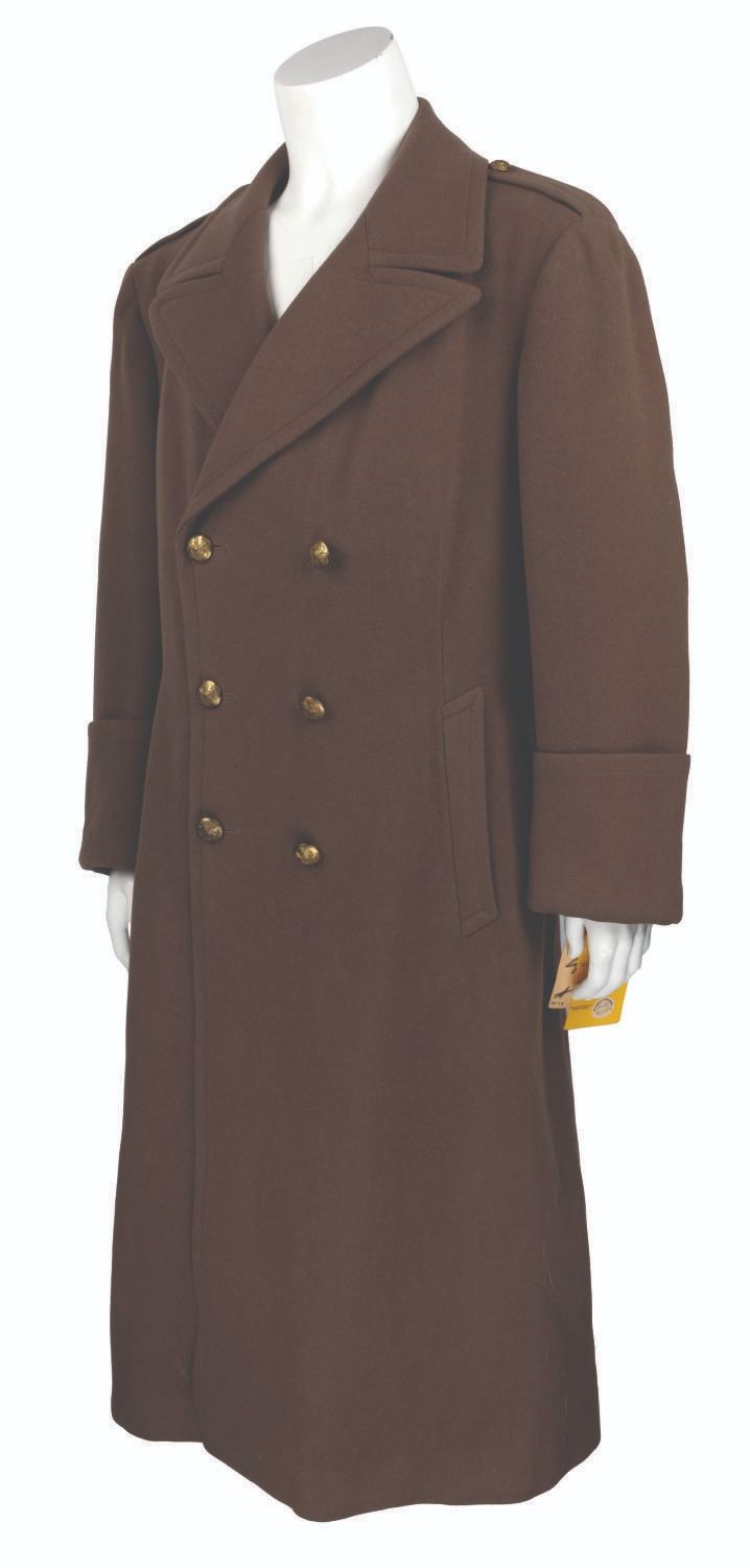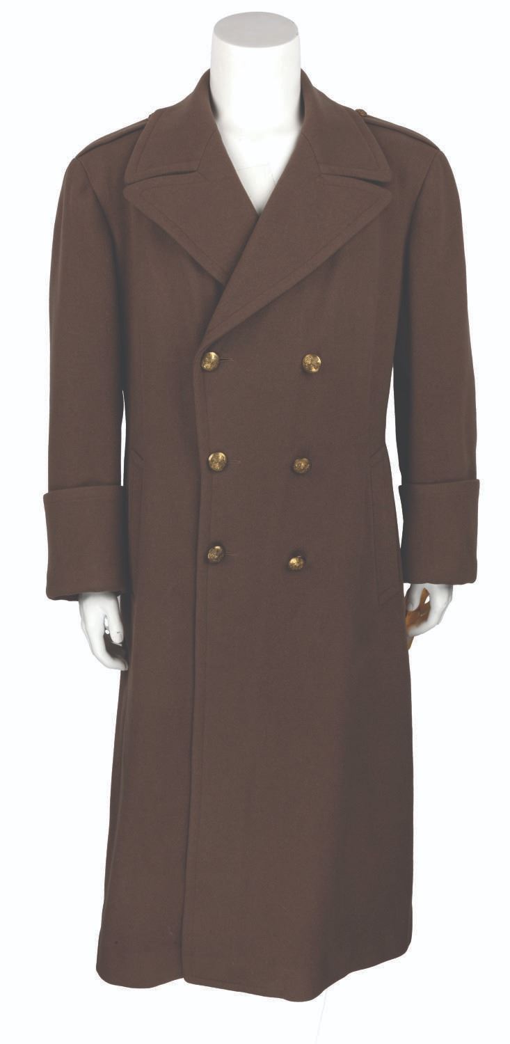 (Grant/20th Century Fox, 1948-49) A heavy trench coat worn or owned by actor Cary Grant. A label sewn inside the inner breast pocket indicates this coat was made for Grant in 1948 by P. Vauclair of Paris. A label added over that one for 20th Century Fox enters it into the Studio wardrobe inventory in April of 1949. Labeled "44", the 54" long heavy coat is in very good condition, with light wear from age