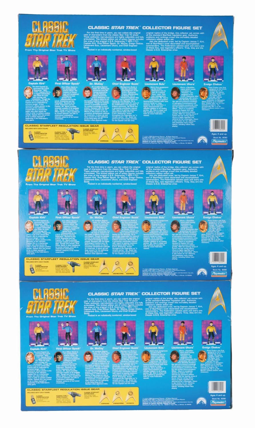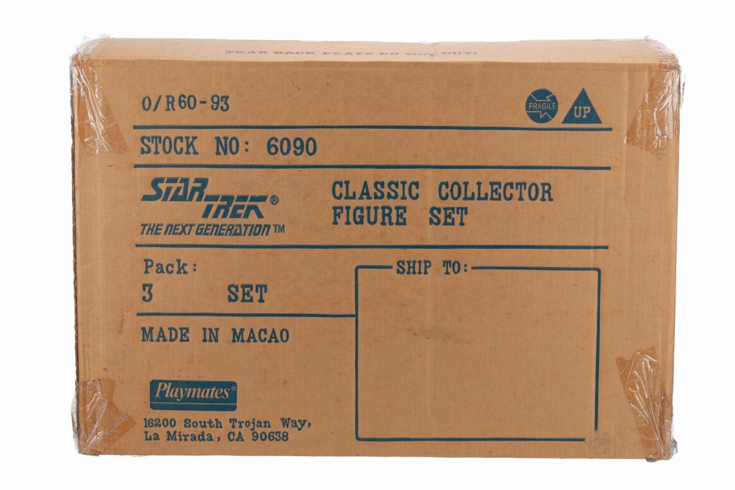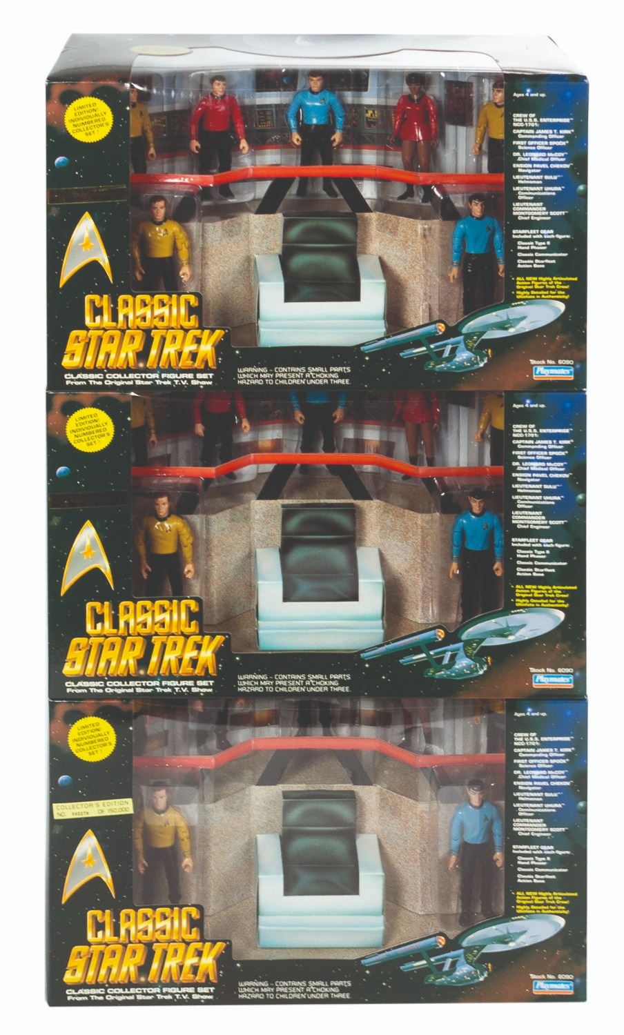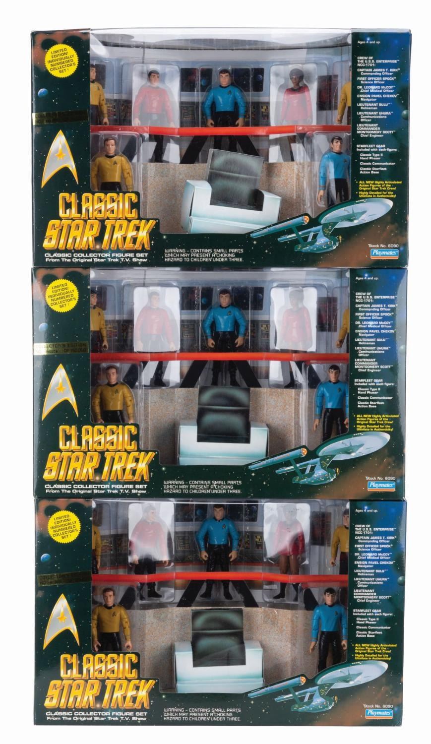 (Playmates, 1993) A complete factory cardboard case of three limited edition Star Trek Classic Collection figure sets. Only removed from their brown factory box for photography and condition inspection, each set contains 7 figures based on The Original Series, displayed in their windowed box recreation of the bridge. Each set is numbered, with this case containing sets 002277- 002279 of 150,000, and each measures 10.5" x 17" and 8.5" deep. The condition is very fine, with minor box wear to the sets, including a small tear at the edge of box 002279, attributed to the manufacturing process.