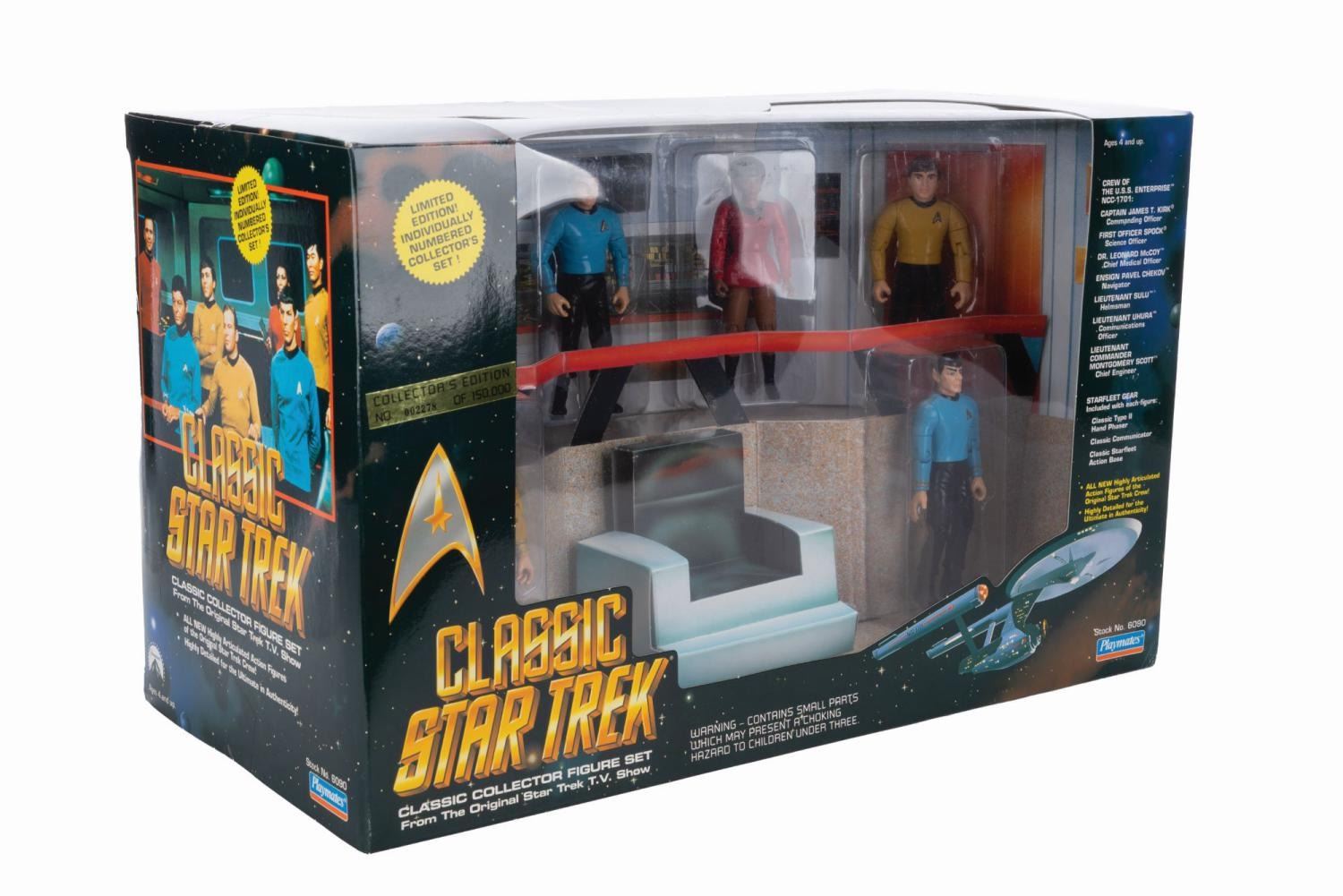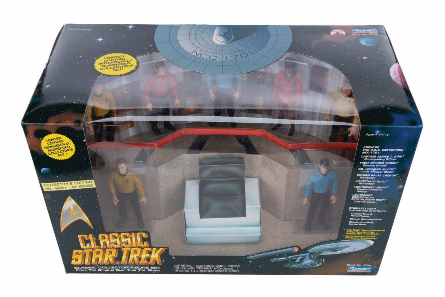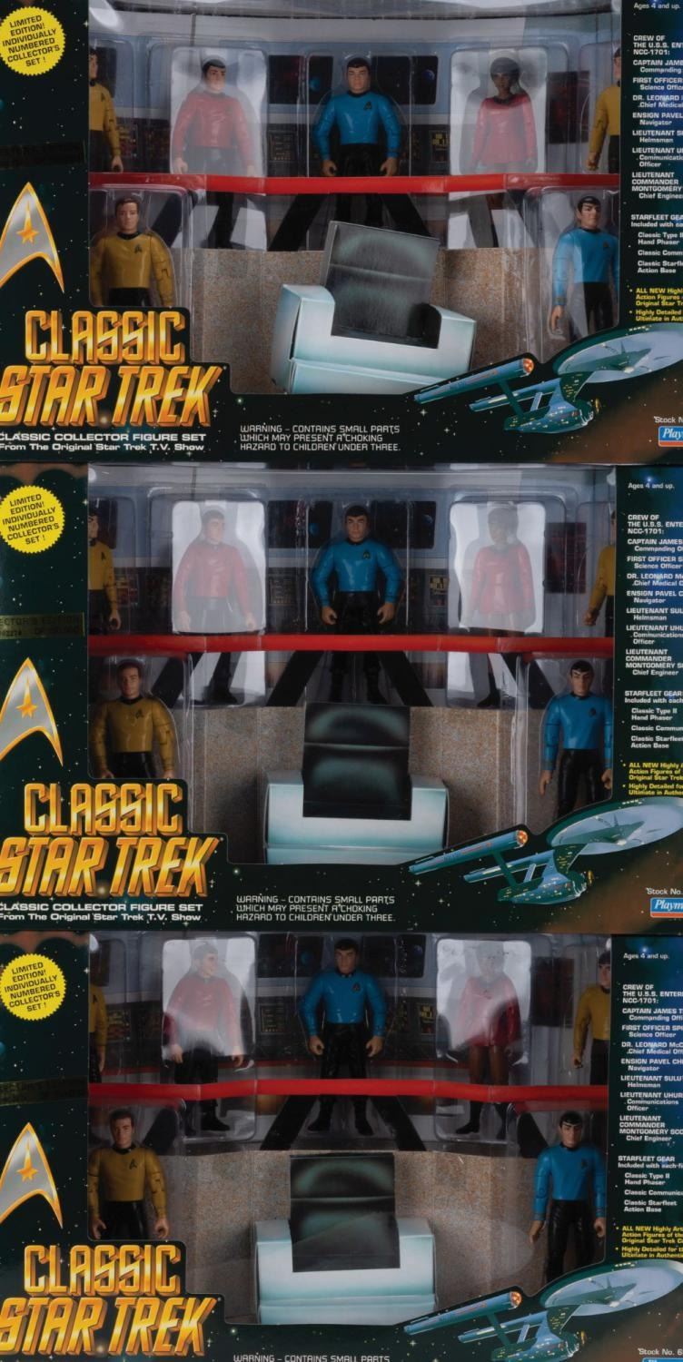 (Playmates, 1993) A complete factory cardboard case of three limited edition Star Trek Classic Collection figure sets. Only removed from their brown factory box for photography and condition inspection, each set contains 7 figures based on The Original Series, displayed in their windowed box recreation of the bridge. Each set is numbered, with this case containing sets 002277- 002279 of 150,000, and each measures 10.5" x 17" and 8.5" deep. The condition is very fine, with minor box wear to the sets, including a small tear at the edge of box 002279, attributed to the manufacturing process.