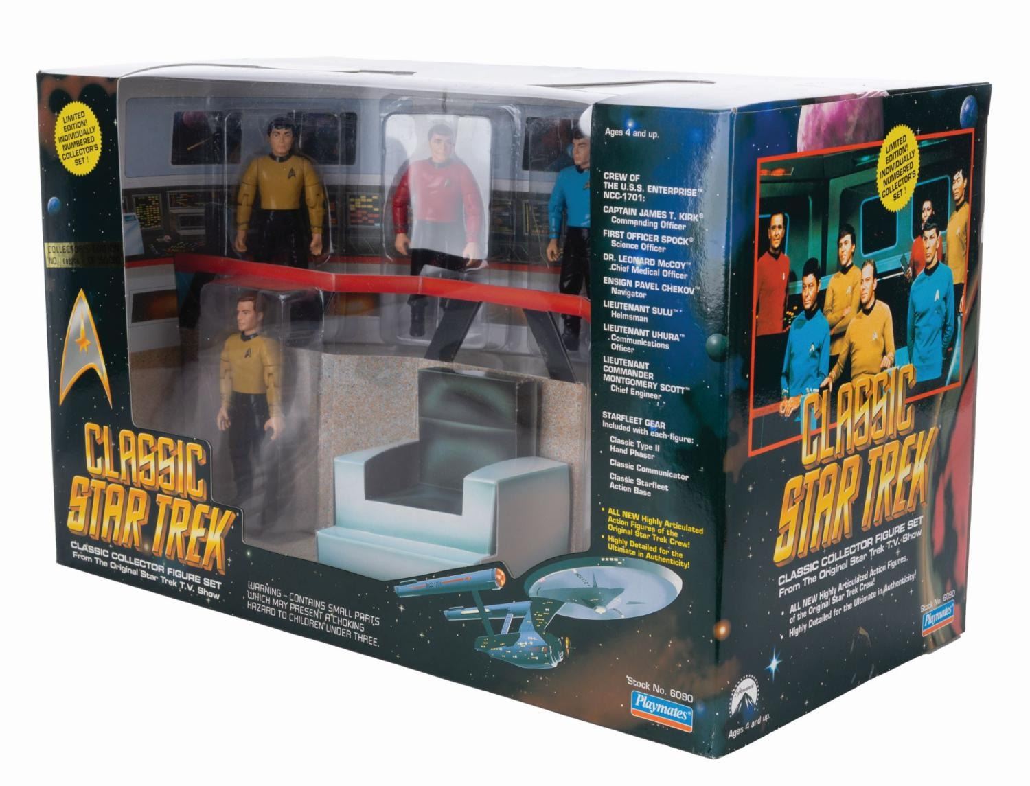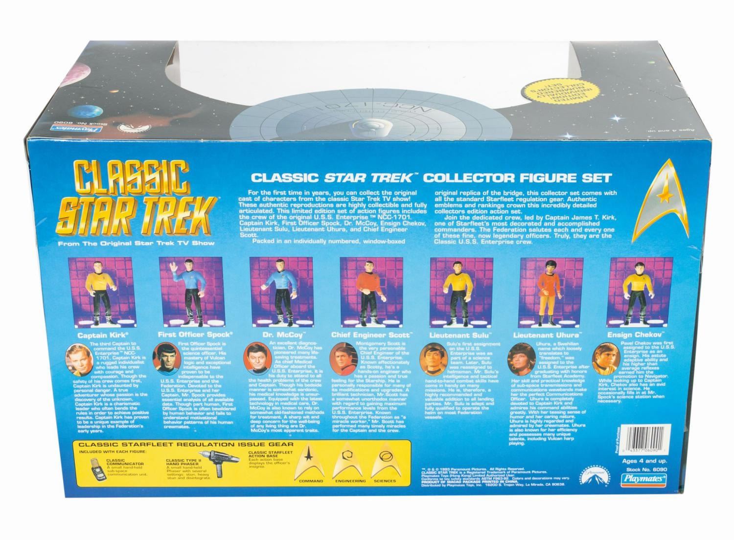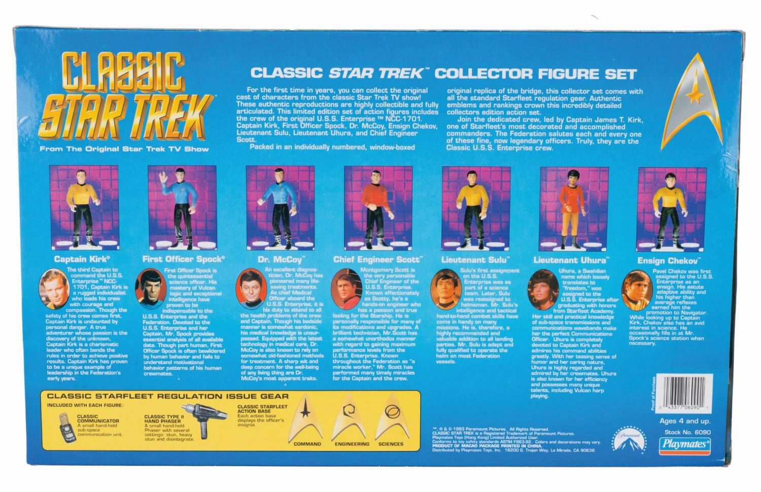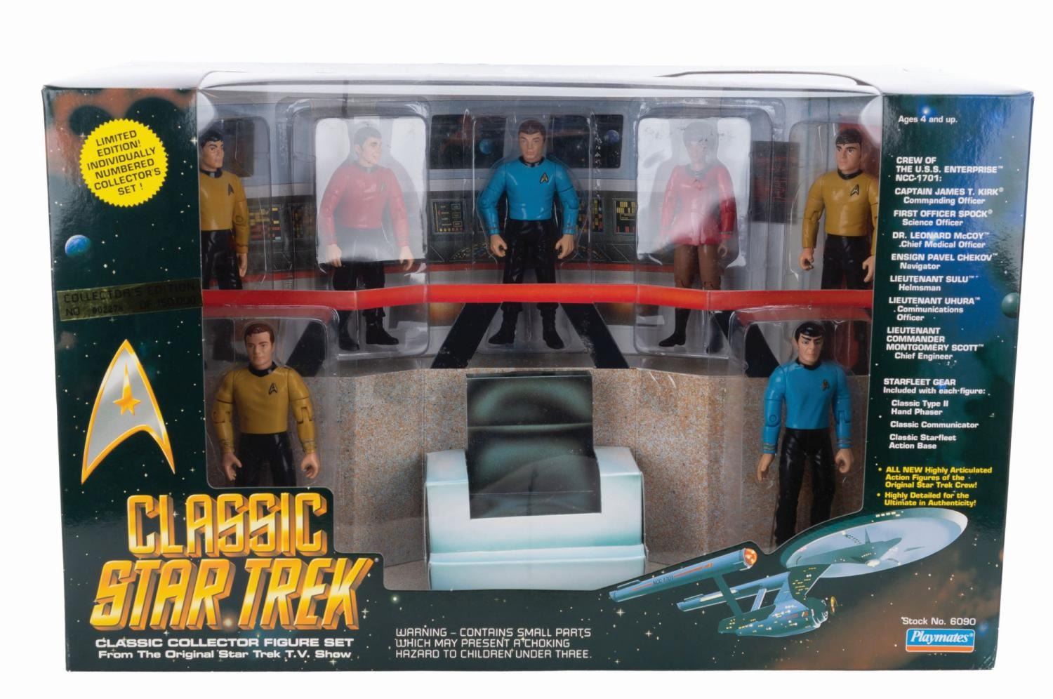 (Playmates, 1993) A complete factory cardboard case of three limited edition Star Trek Classic Collection figure sets. Only removed from their brown factory box for photography and condition inspection, each set contains 7 figures based on The Original Series, displayed in their windowed box recreation of the bridge. Each set is numbered, with this case containing sets 002277- 002279 of 150,000, and each measures 10.5" x 17" and 8.5" deep. The condition is very fine, with minor box wear to the sets, including a small tear at the edge of box 002279, attributed to the manufacturing process.
