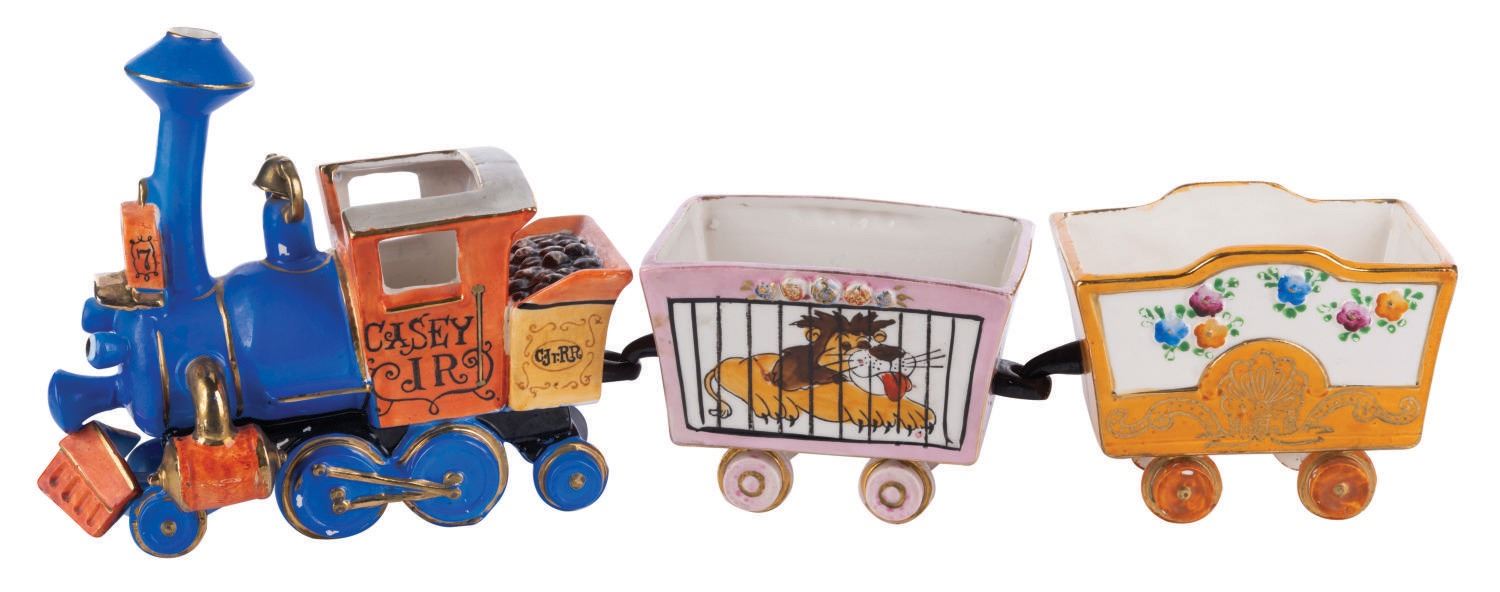 (Disney, 1950s) A rare Casey Junior Ceramic Planter set. The (3) piece lot features an engine, tender, and animal wagon which can be linked in tandem, each with floral accents to their motif. Each piece is in very good condition, with mild discoloration, scuffs, wear, few chips to painted areas, and original Walt Disney Productions label in cab.