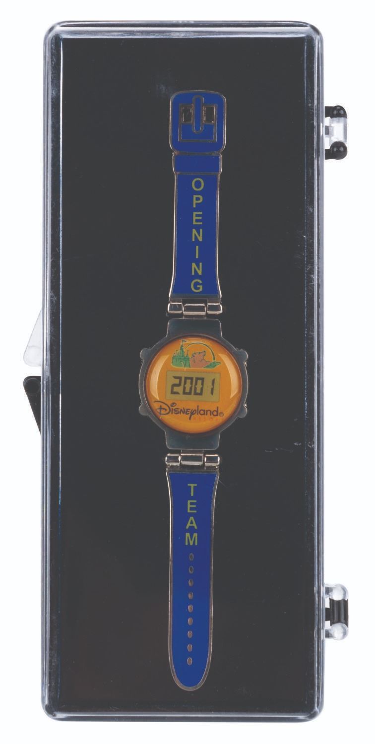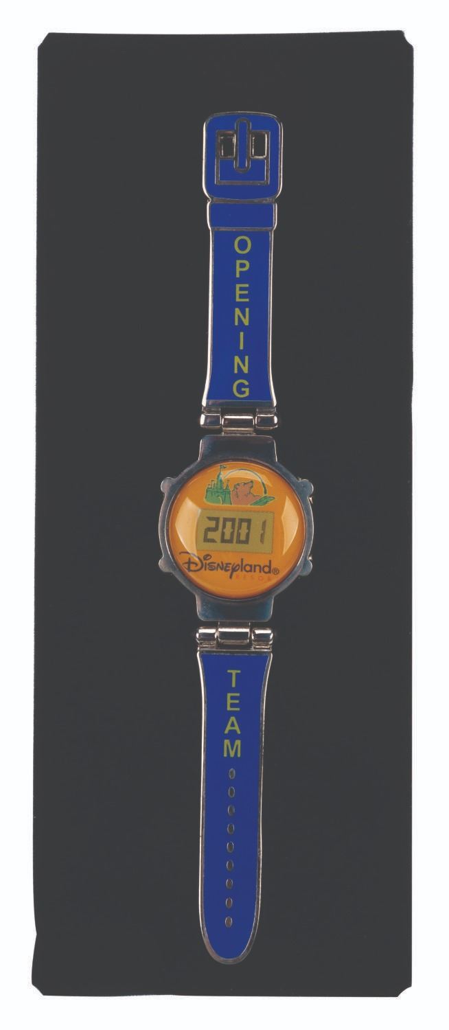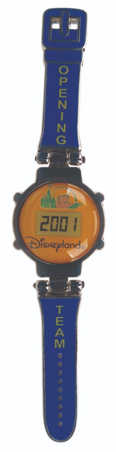 (Disneyland, 2002) A Cast-exclusive pin based on the very rare wristwatch given to Cast Members before the 2001 opening of Disney's California Adventure and Downtown Disney in 2001. Each Cast Member-exclusive wristwatch was preset to count down the days until the grand opening. Part of a limited edition of 5000, this pin marks the first anniversary of the opening, with "Opening Team" on the "band," and Disneyland Resort and 2001 on the "face." Measuring 4" x .75", the pin is in fine condition.