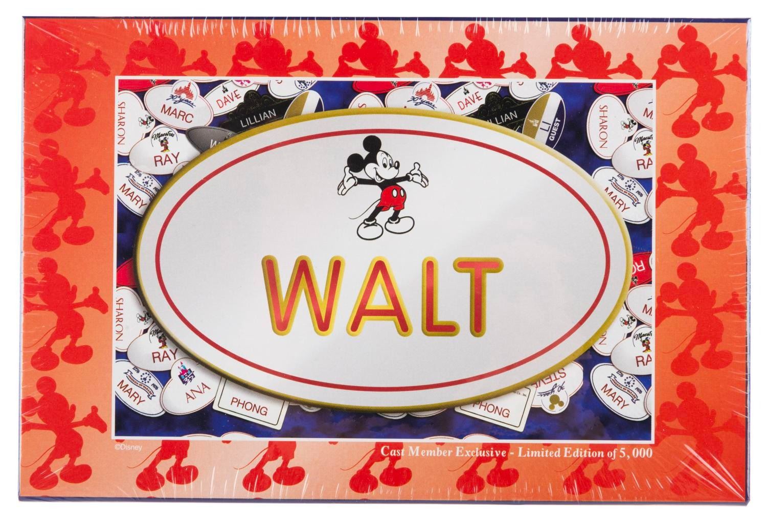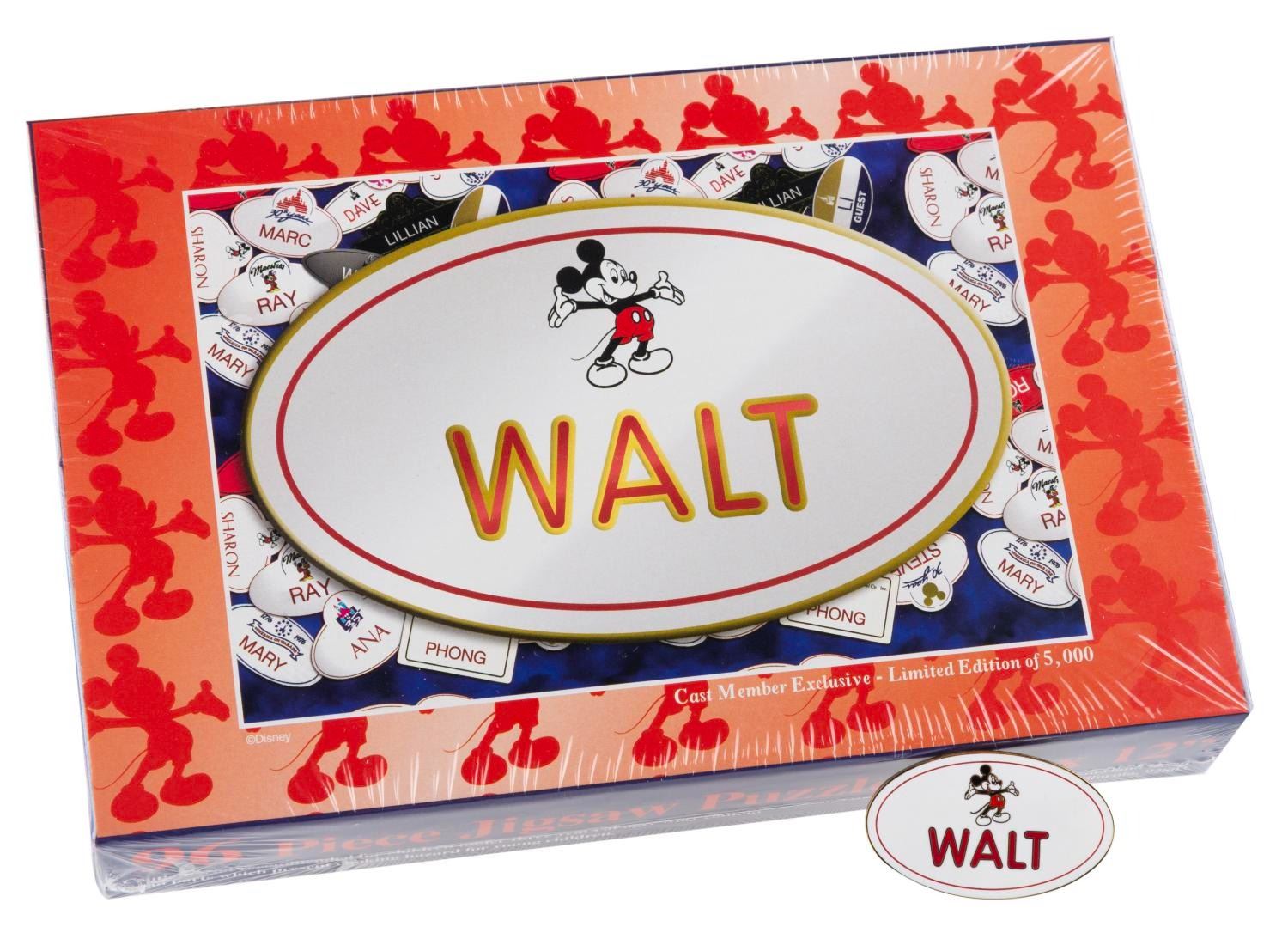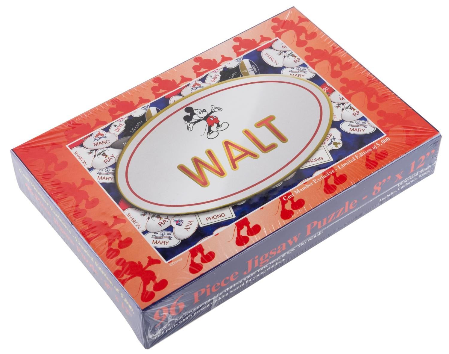 (Disney, 2001) A Disneyland Resort limited edition 5000 "Walt " name badge pin and puzzle, only available to Cast Members at the Disneyland T.E.A.M. Center with purchase of a puzzle. Measuring 1.75 " x 1 ", the pin is in fine condition. The 5.5 " x 8 " x 1.5 " puzzle is sealed in as-new condition.