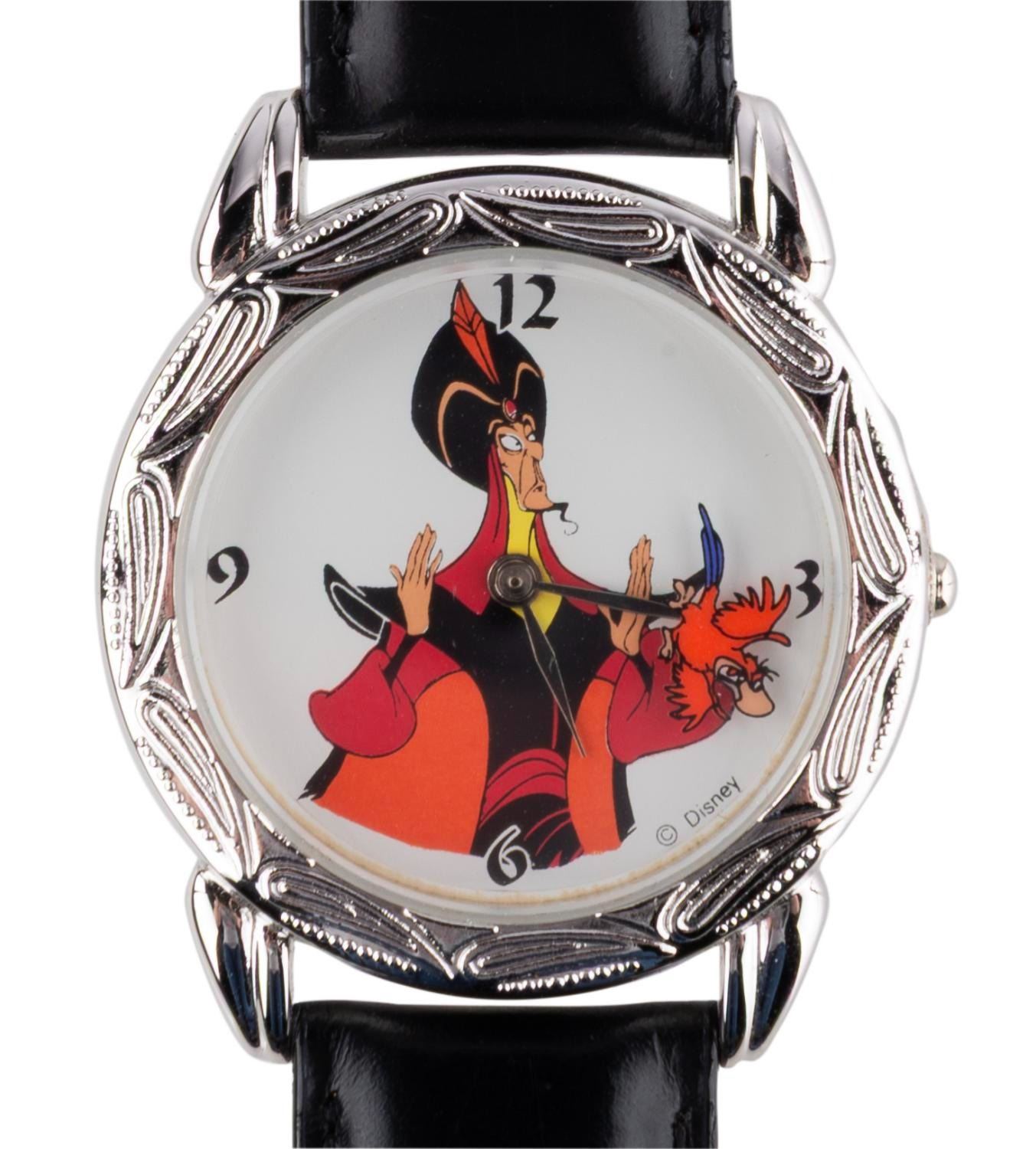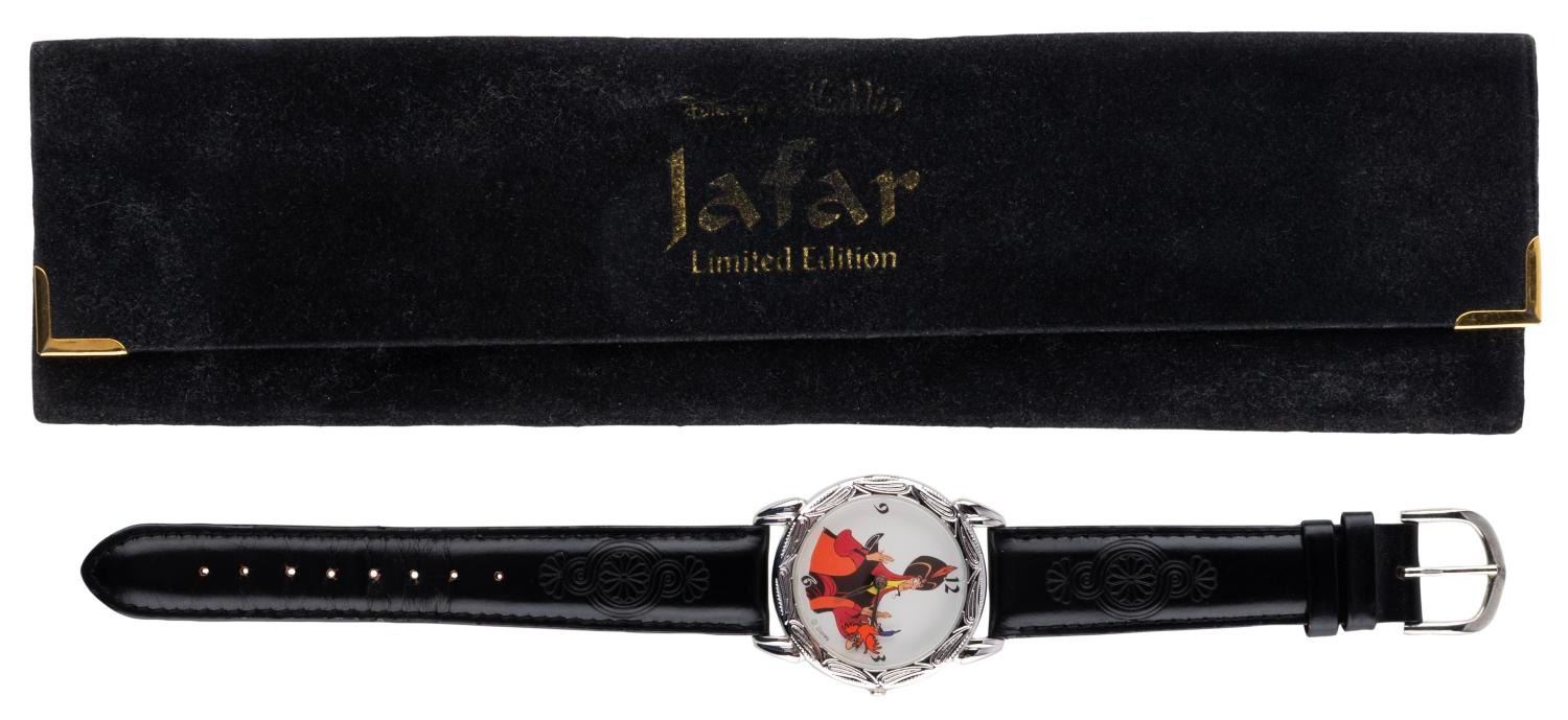 (Disneyland, 1992) An "Aladdin" wristwatch featuring Jafar, with the original velvet case. Numbered 772/1075, the watch was sold exclusively at the Disneyland Cast Member Store Company D. Measuring 1.25" in diameter on a 9.25" band, the watch is in good condition with light wear, requiring a battery and possibly service to function.