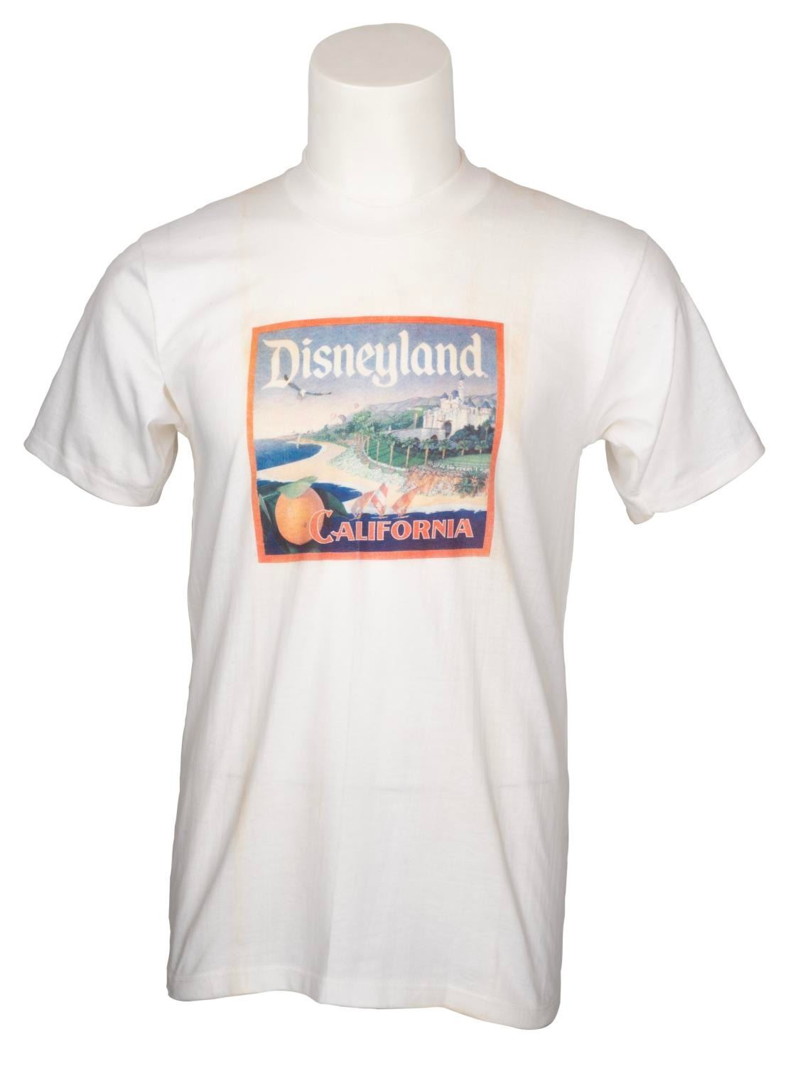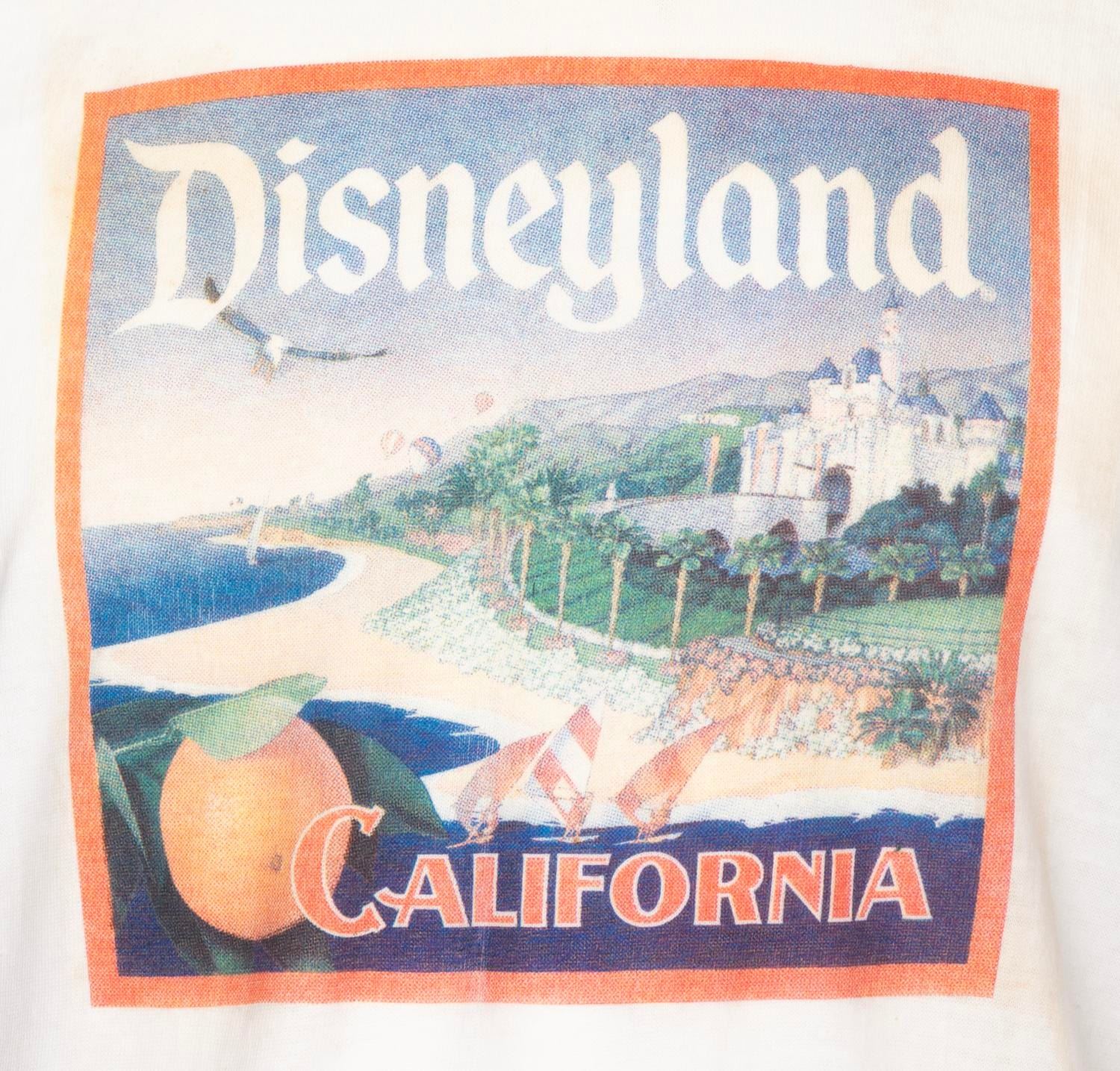 (Disneyland, 1988) A Cast Member Disneyland California t-shirt. With a tag from the Cast Member Company D store, the size medium shirt is in good condition, with wear light fading from use, discoloration, and spots.