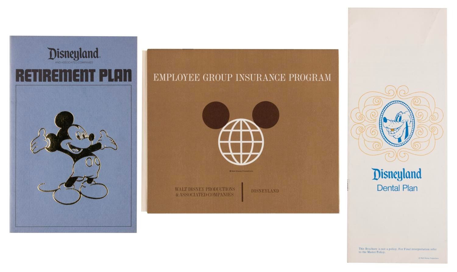 (Disney, 1960s-80s) A collection of Cast Member benefits information, including a Disneyland Dental Plan pamphlet, an Employee Group Insurance Program, and a Disneyland and Associated Companies Retirement Plan booklet. Measuring from 5.5" x 8.5" to 4.25" x 11", the items are in very good condition with handling wear, creasing, soiling, and a soft fold on the top right of the Dental brochure.