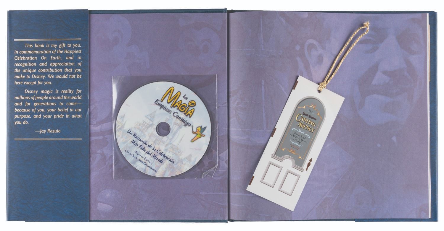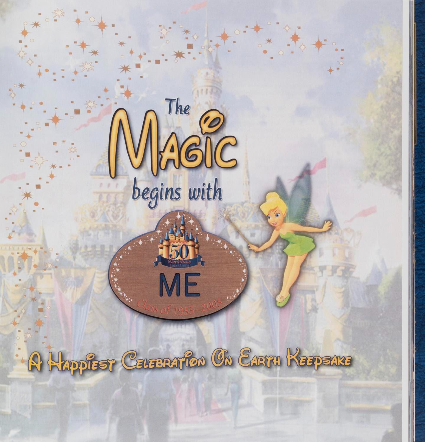 (Disneyland, 2005) A “The Magic Begins with Me” book celebrating 50 years of Disneyland Cast Members and featuring a foreword by VP Jay Rasulo. This lot includes a commemorative bookmark given to Cast Members as part of the Happiest Celebration on Earth, with a message from Walt Disney World Resort President Al Weiss on the reverse. Measuring 10.25” x 10.5”, the hardcover book is in very good condition with light scratches and wear on the cover.