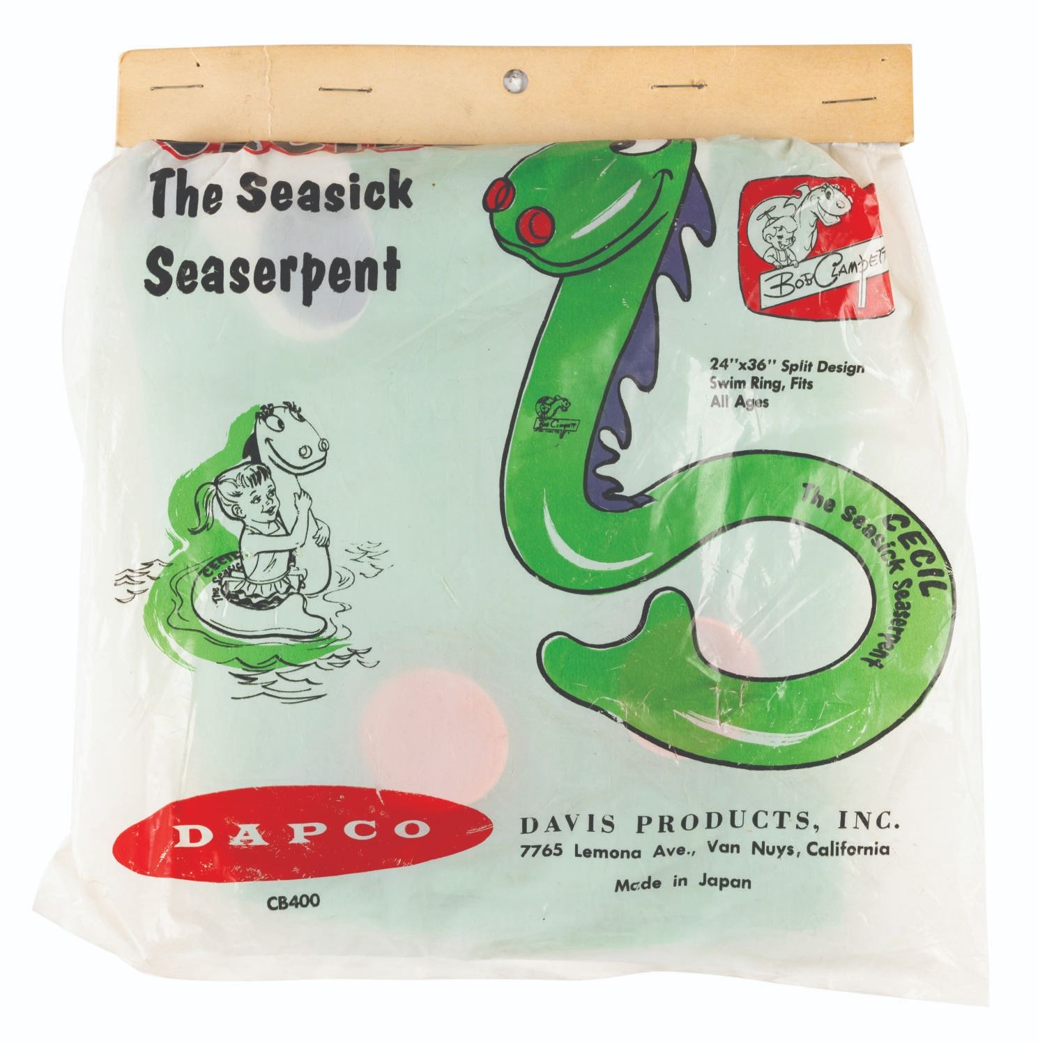 (Dapco, 1950s-60s) A production sample Cecil the Seasick Seaserpent Swim Ring by Dapco, sealed in the original packaging. The package describes the toy as 24" x 36”, and includes a hand-written manufacturer’s sample label inside The 9” x 8.5” sealed bag. The bag is in fair condition with wear from handling and age.