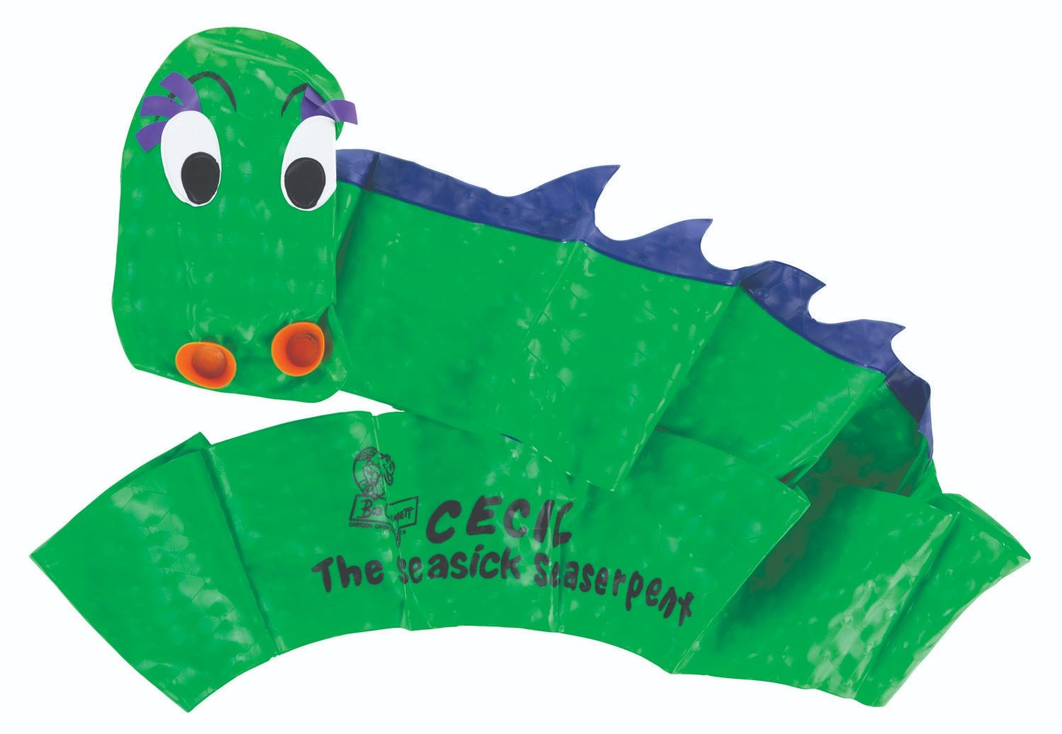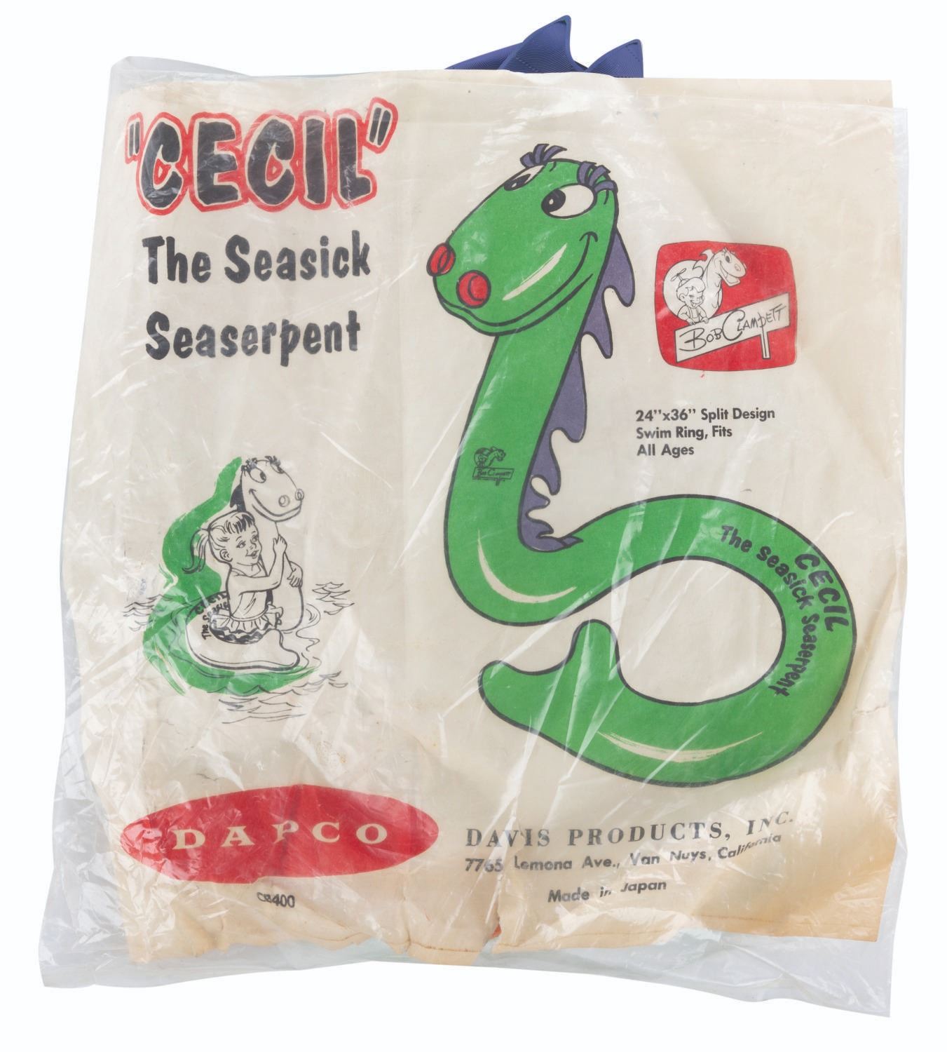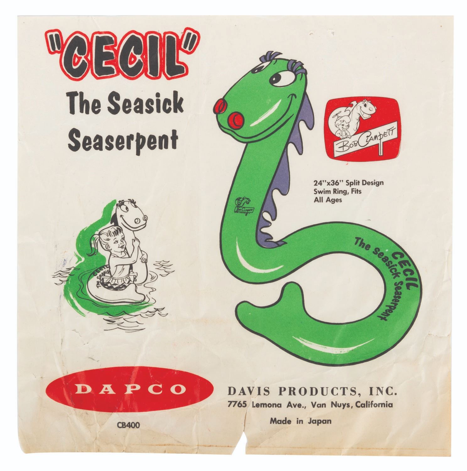 (Dapco, 1950s-60s) A Cecil the Seasick Seaserpent Swim Ring by Dapco, with the original packaging. The package describes the toy as 24" x 36”. The toy displays in fine condition but has not been tested for inflation. The 9" x 9" bag is in fair condition with wear from handling and age.