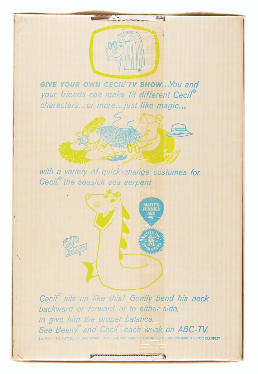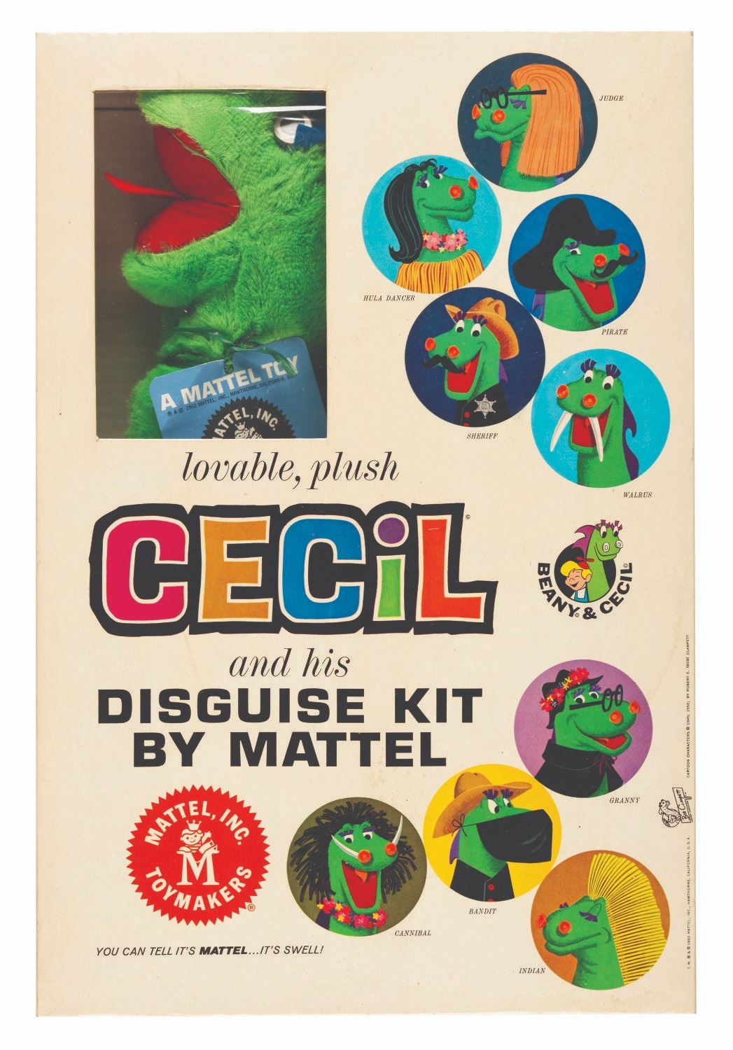 (Mattel, 1962) An unopened Lovable, Plush Cecil and his Disguise Kit by Mattel. Inside the kit are 18 disguises for the Cecil plush, including accessories for a hula dancer, cowboy, Super Cecil, and Dishonest John. Measuring 11.5” x 3.25” x 17”, the sealed contents are in fine as-new condition, while the box exhibits light wear.