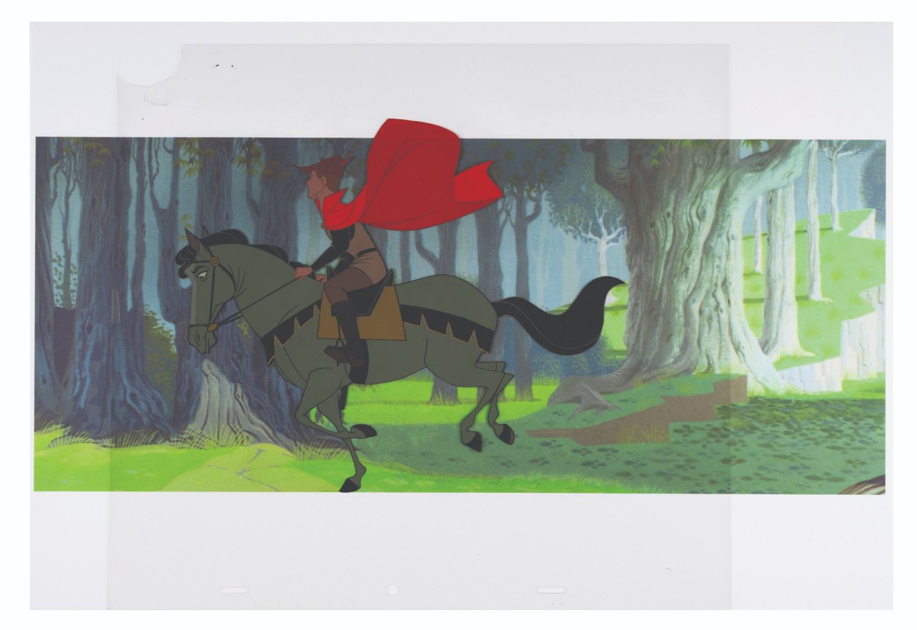 (Disney, 1959) An original production cel of Prince Phillip and Samson from Walt Disney's"Sleeping Beauty." The characters have a total image size of 10"x8.5" on a slightly trimmed 13.5"x12.5" cel. The cel has been paired with a color copy background for presentation. The cel is in very good condition with all paint intact.
