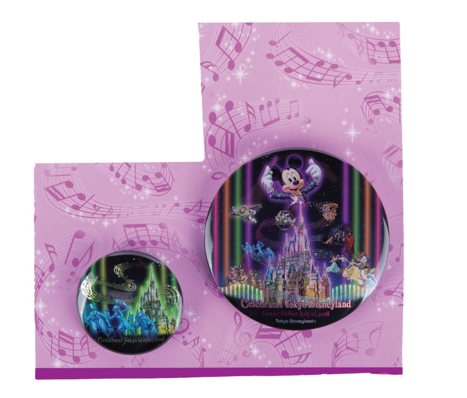 (Tokyo Disneyland, 2018) A pair of "Celebrate! Tokyo Disneyland" buttons with aluminum accents commemorating the 35th anniversary of the Park. The pieces are in fine unused condition.