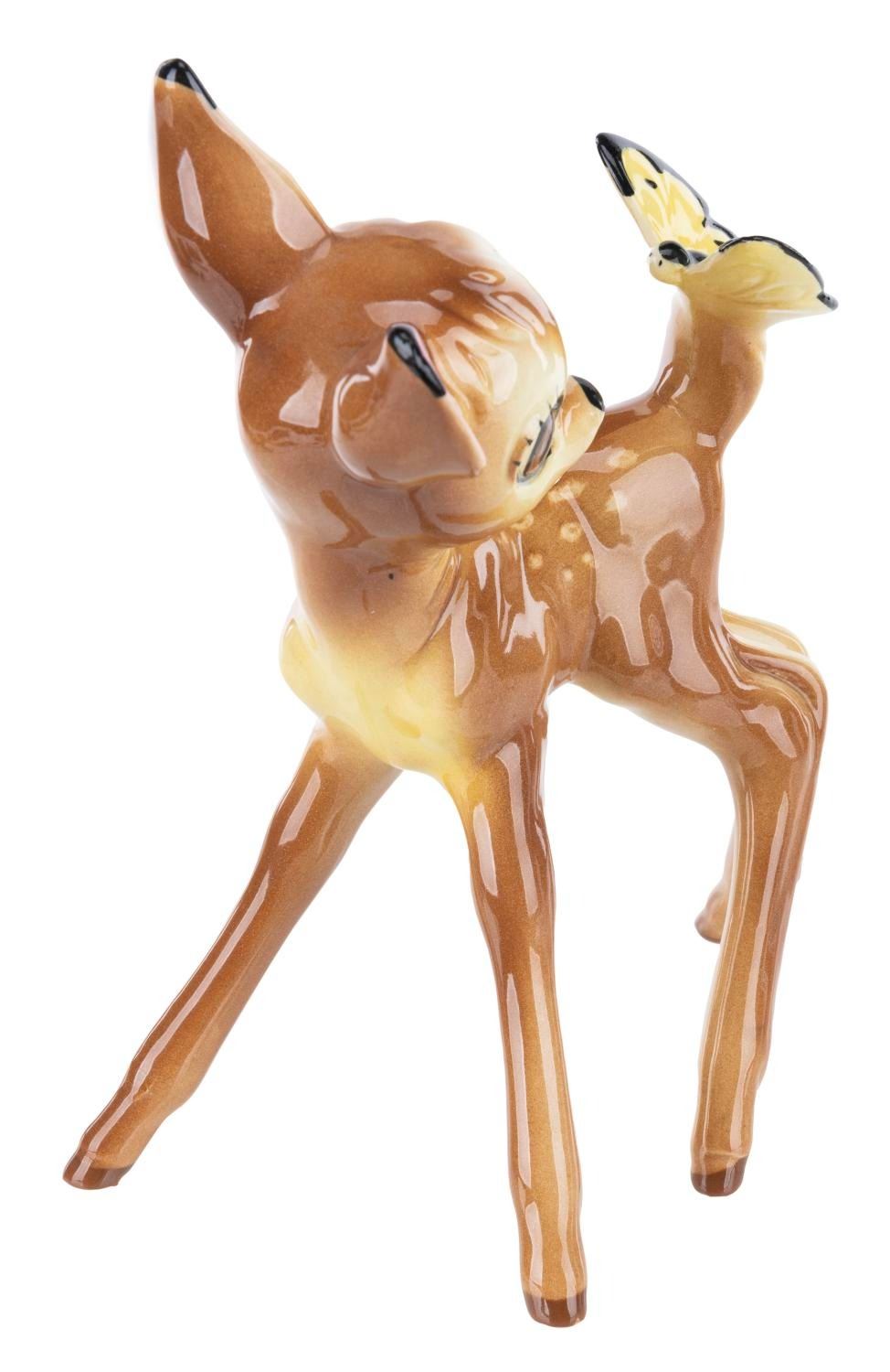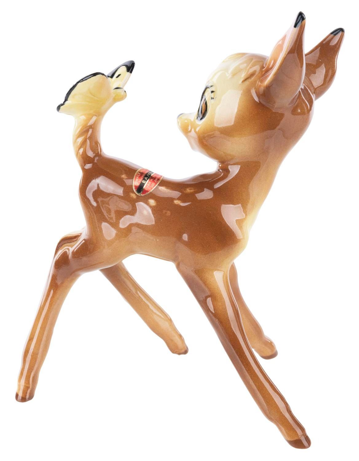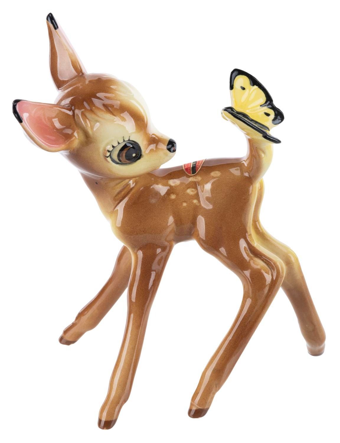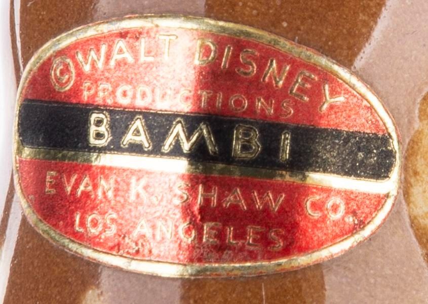 (Shaw Pottery, 1940s) A painted glazed ceramic figurine of Bambi and a butterfly by Evan K. Shaw. The figure retains a “Walt Disney Productions Bambi Evan K. Shaw Los Angeles” sticker on the back. Two versions of the Bambi and butterfly figures were produced, with this yellow butterfly considered much rarer than the blue butterfly variant. Measuring 6" x 8.5” tall, the figure is in very good condition with very light crazing from age.