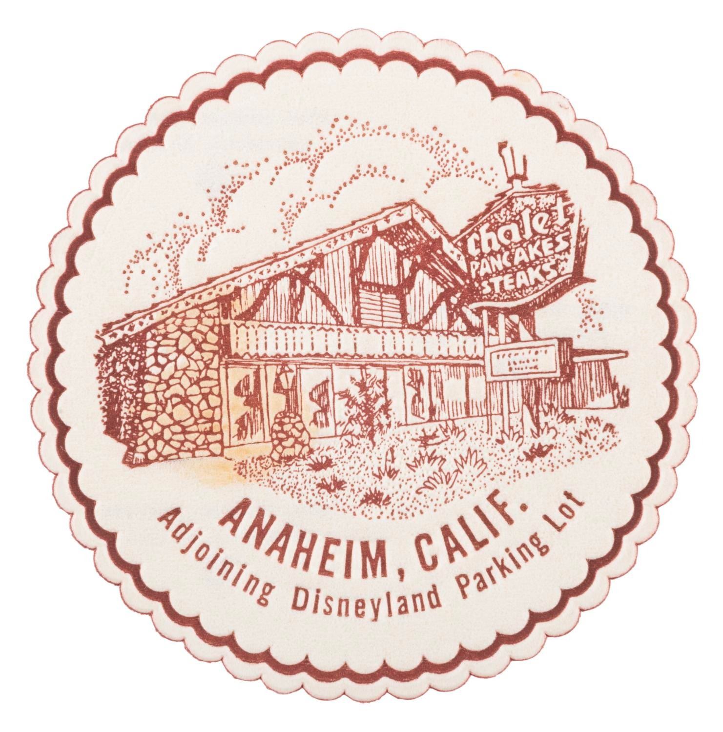 (Chalet Pancakes, 1950s) A paper coaster from Chalet Pancake and Steak House, located near the Disneyland parking lot. Measuring 3.5” in diameter, the coaster displays in very good condition with a stain.