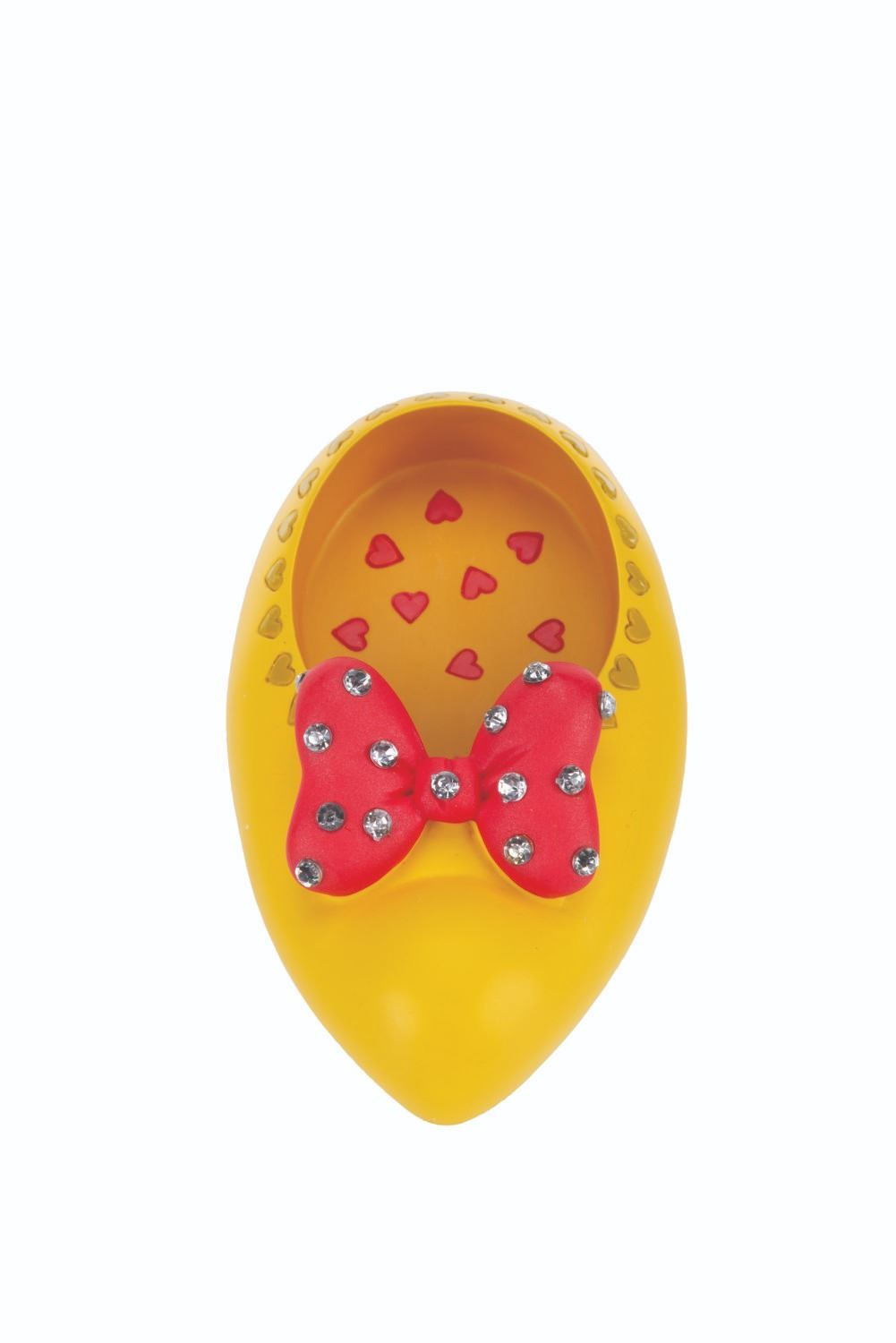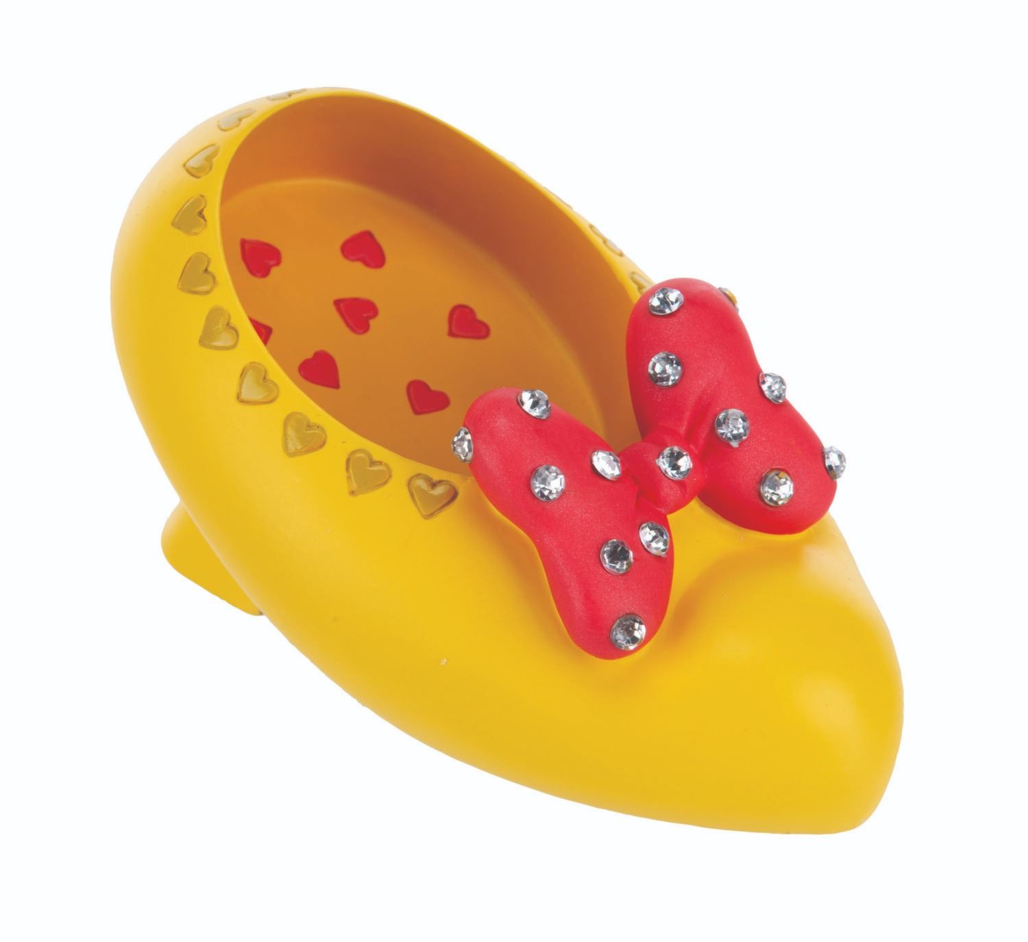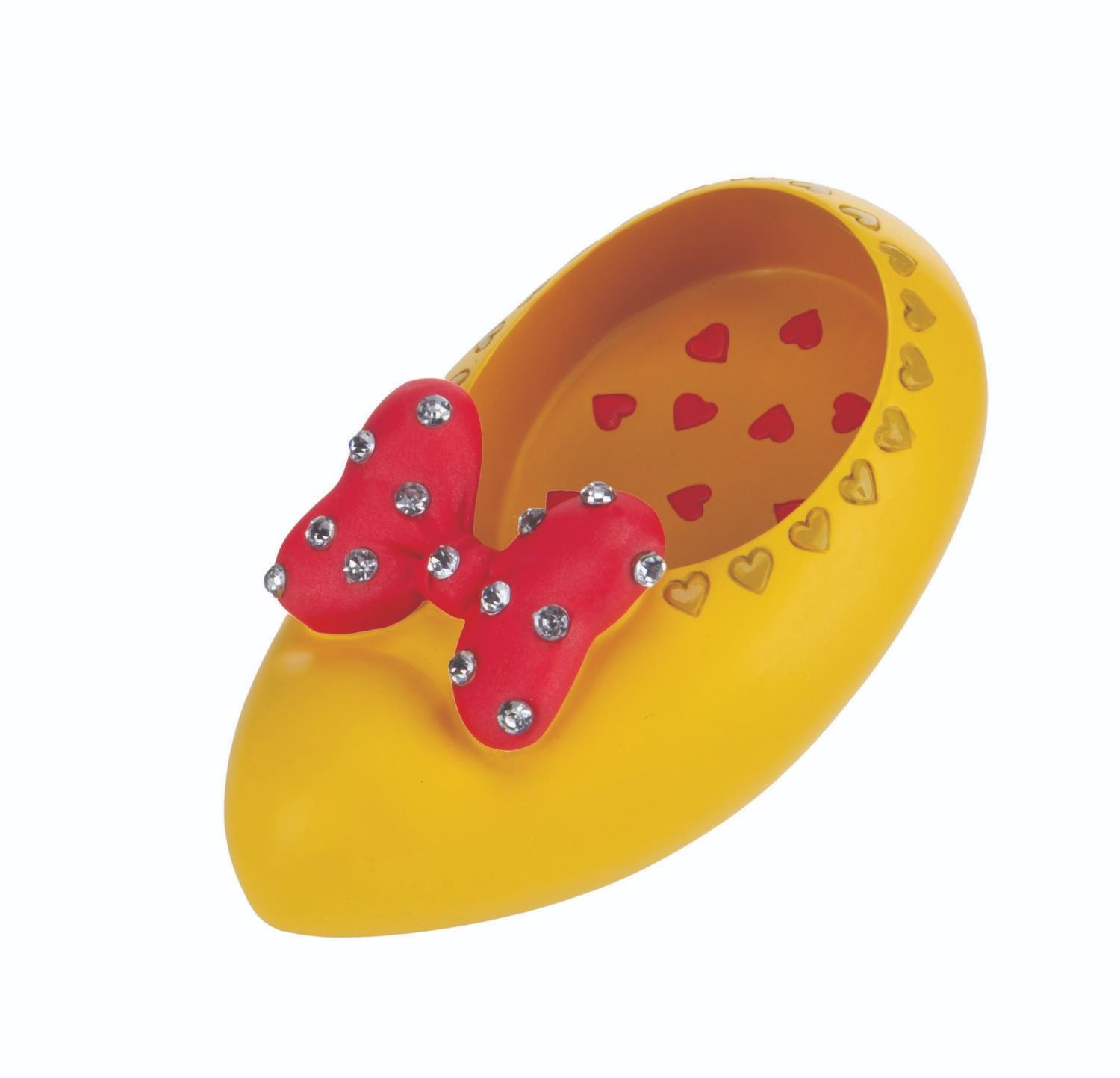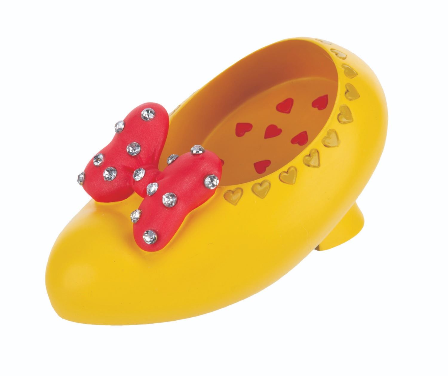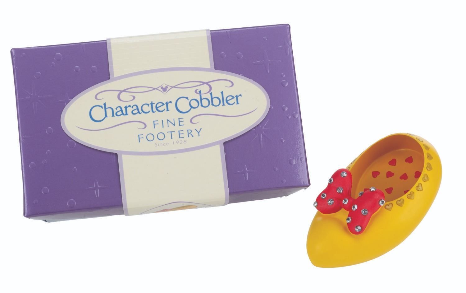 (Character Cobbler, 1990s-2000s) A shoe figurine titled "Heel to the Cheese," inspired by Minnie Mouse’s fabulous footwear. Measuring 2" x 2.25" x 4" tall, the shoe comes with its original box and displays in good condition with heavy color shift from age and light wear.