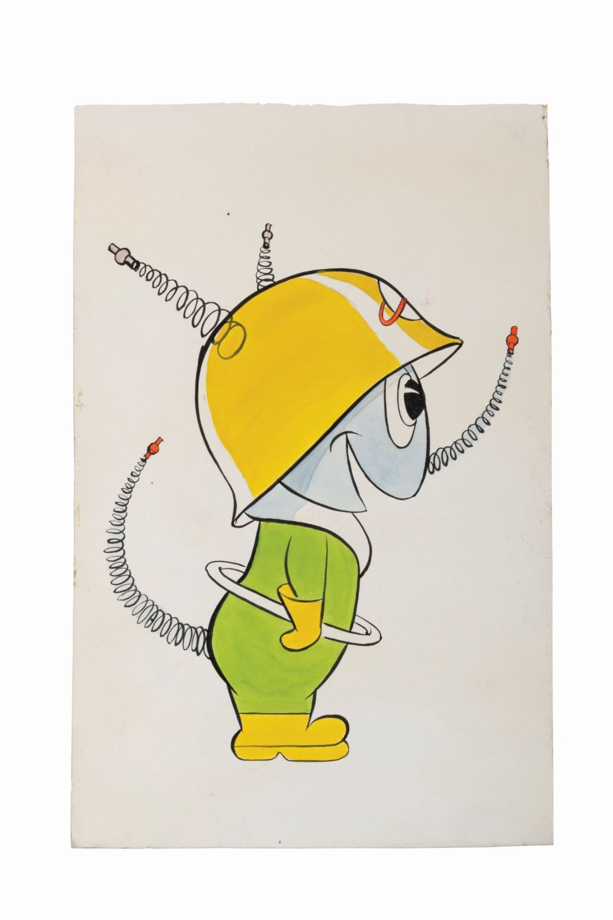 (Clampett, 1959) A character concept drawing for Bob Clampett’s unproduced series “Beeper and his Guided Muscle.” Accomplished in gouache, watercolor, and ink, and measuring 10.75” x 7”, the drawing is in good condition with edge wear, light adhesive residue stains along the edges, and light discoloration from age.
