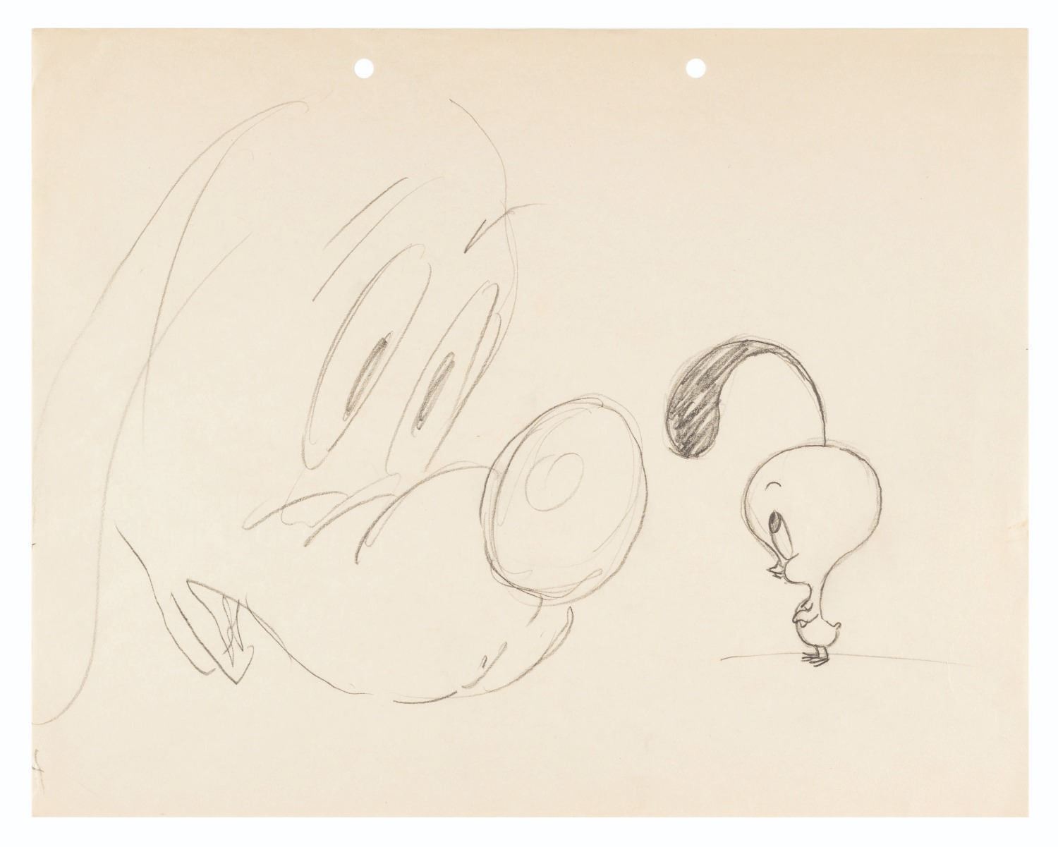(Schlesinger, 1937) An early development drawing for Quentin Quail, a precursor to Bob Clampett’s Tweety Bird. Measuring 9.5” x 12”, the graphite drawing is in very good condition with light edge wear and creasing from production use and light discoloration from age.