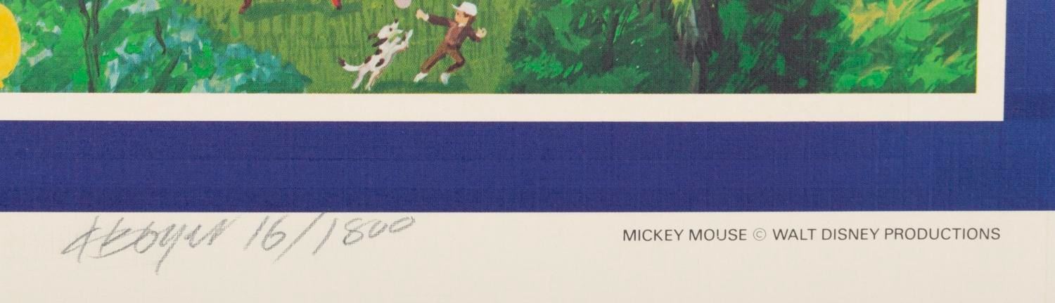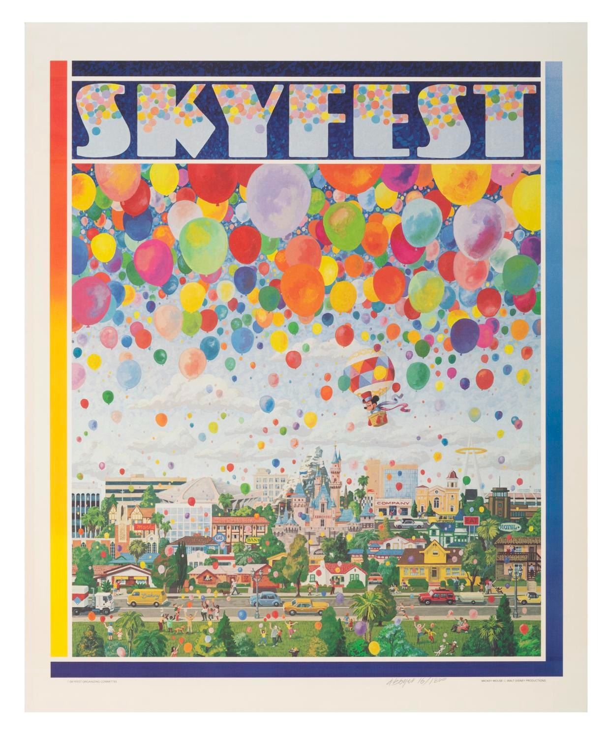 (Disneyland, 1985) A Skyfest lithograph designed and hand-signed in graphite by Charles Boyer. The Skyfest celebration honored the 30th anniversary of Disneyland with a million balloons released into the air. Numbered 16 out of 1800, the poster measures 22" x 27.25" and is in very good condition with light edge wear at the top and a creased left corner in the border.
