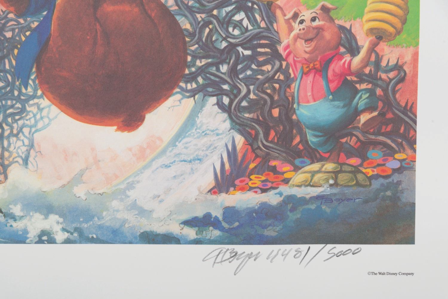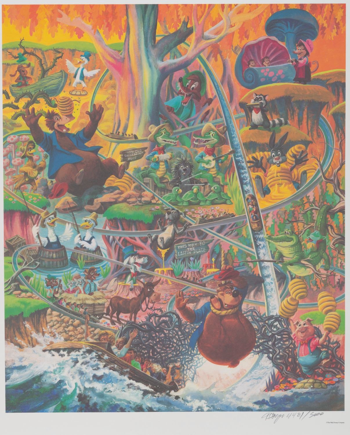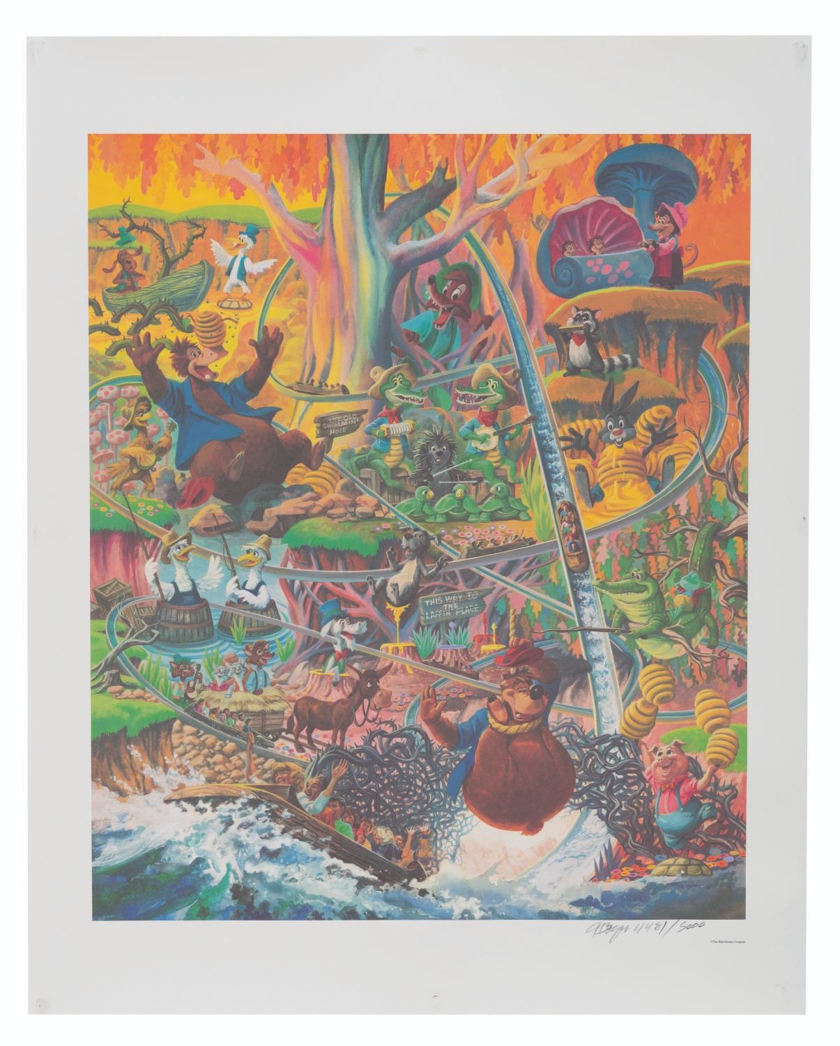 (Disneyland, 1989) A limited edition signed lithograph by Charles Boyer, commemorating the opening of Splash Mountain at Disneyland. Titled "The Laffin' Place," the piece is signed by Boyer at the bottom right corner and numbered 4,481/5,000. With an image size of 20" x 24" and measuring 24" x 30" overall, the lithograph is in fine condition.