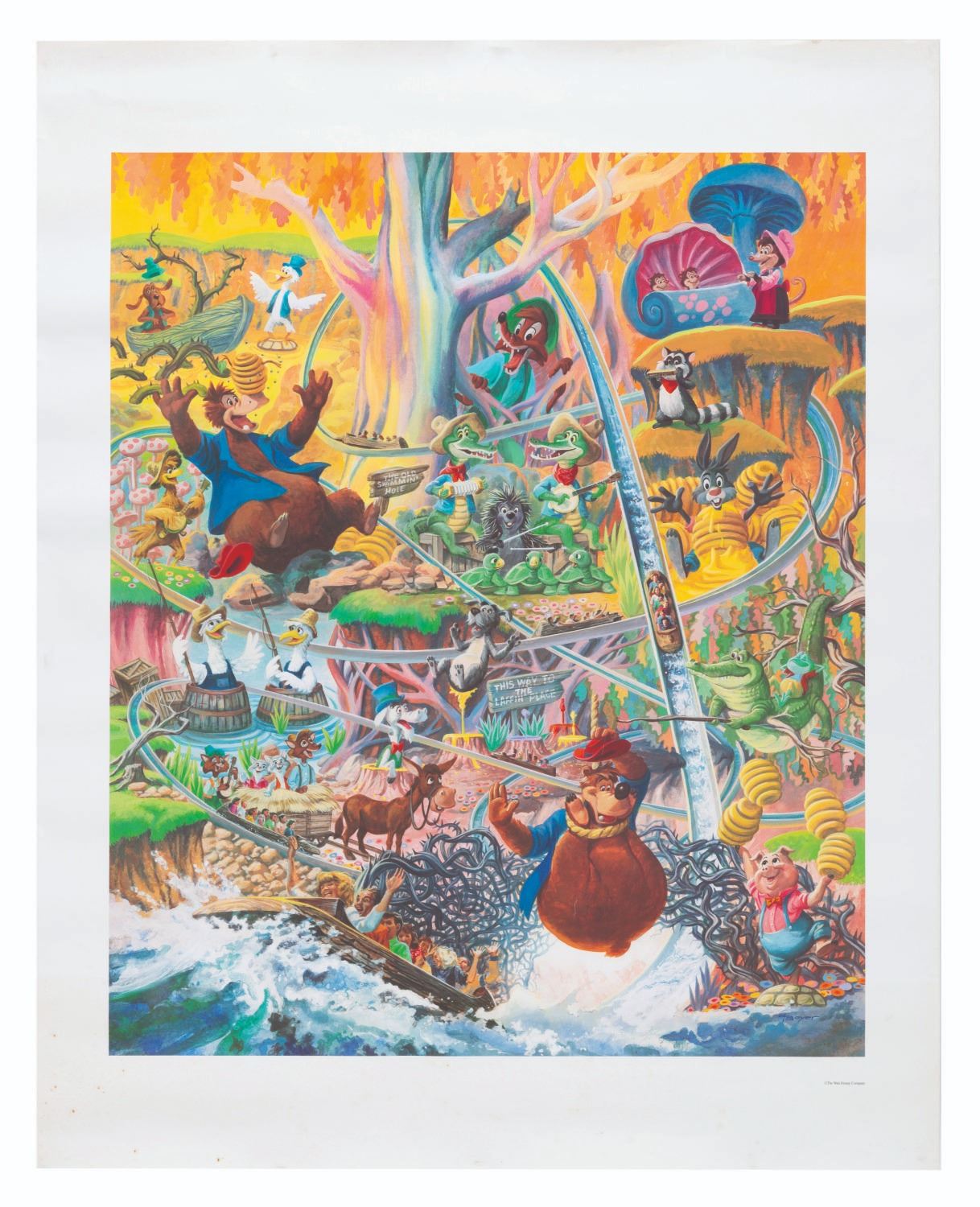 (Disneyland, 1989) A print of Splash Mountain Grand Opening artwork by Charles Boyer and titled"The Laffin' Place." This is an unnumbered, unsigned release of the art. With an image size of 20" x 24" and measuring 24" x 30" overall, the poster is in fair condition with light creases, edge wear, discoloration in the border, and heavy spotting at the bottom, which does not affect the image.