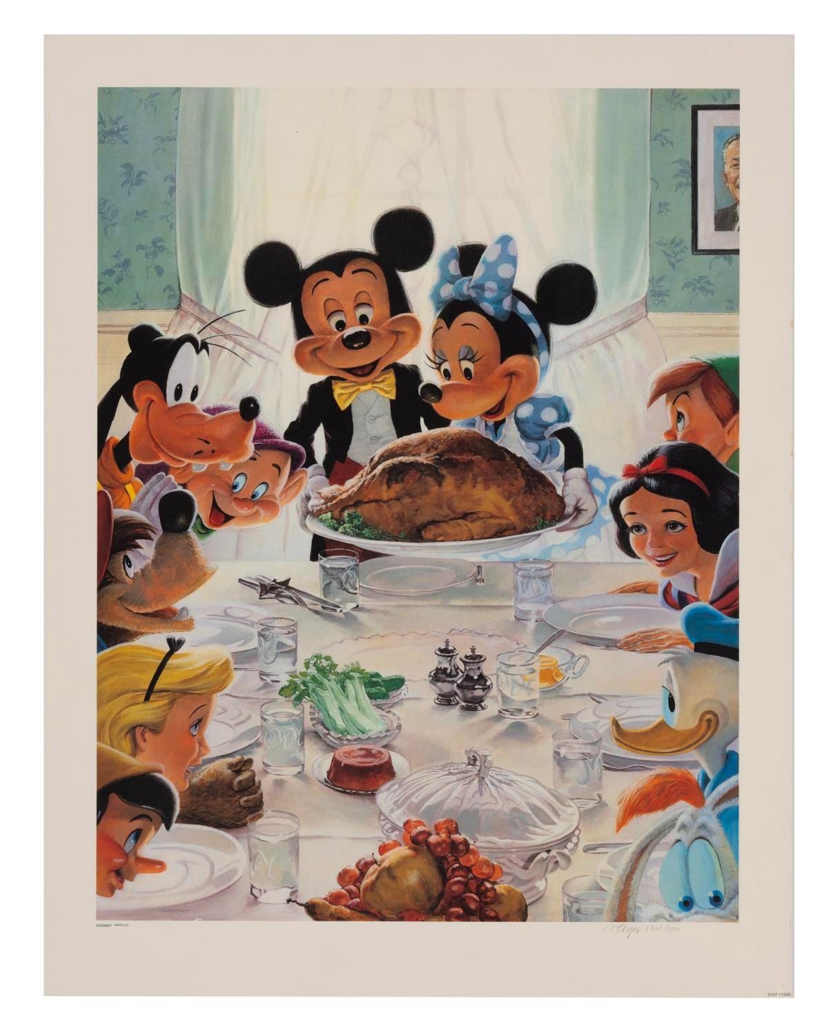 (Disney Parks, 1991) A lithograph designed and hand-signed in graphite by Charles Boyer titled "Family Dinner," and inspired by the artwork of Norman Rockwell. Numbered 184 out of an edition of 1000 the print measures 24.5" x 31.75", and is in good condition with light edge wear, and a couple of smudged fingerprints.