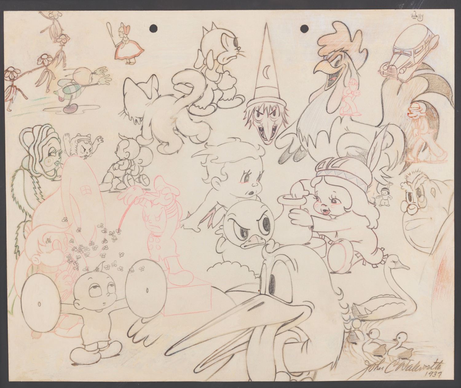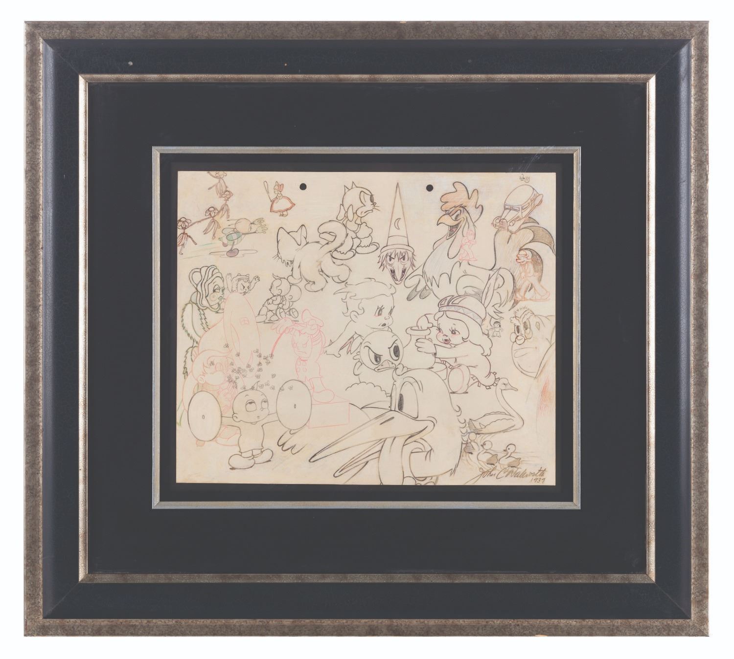 (Mintz, 1937) A Charles Mintz Studio publicity drawing by John C. Walworth of the studio’s many characters including Scrappy and Krazy Kat. Walworth signed and dated the drawing in graphite at the bottom right. Measuring 10” x 12”, the graphite and color pencil drawing is in fine condition in a 19.5” x 21.5” matted frame, in good condition with chips to the edges and corners, and streaks to the plexiglass.