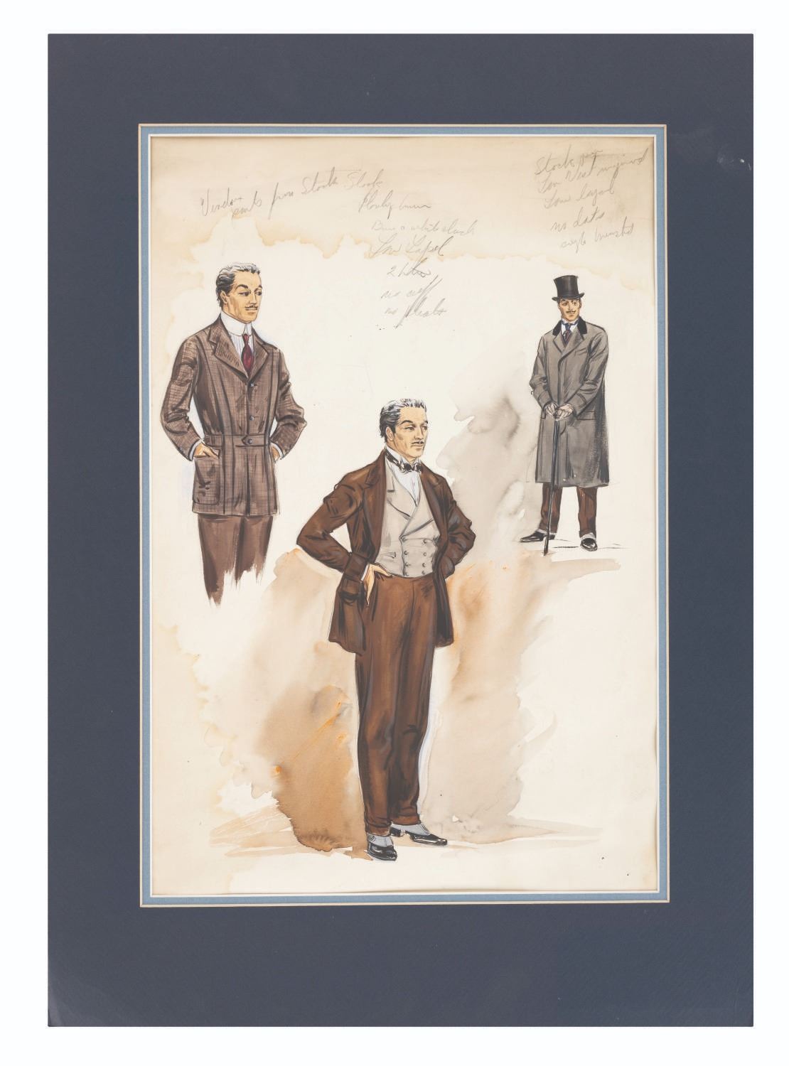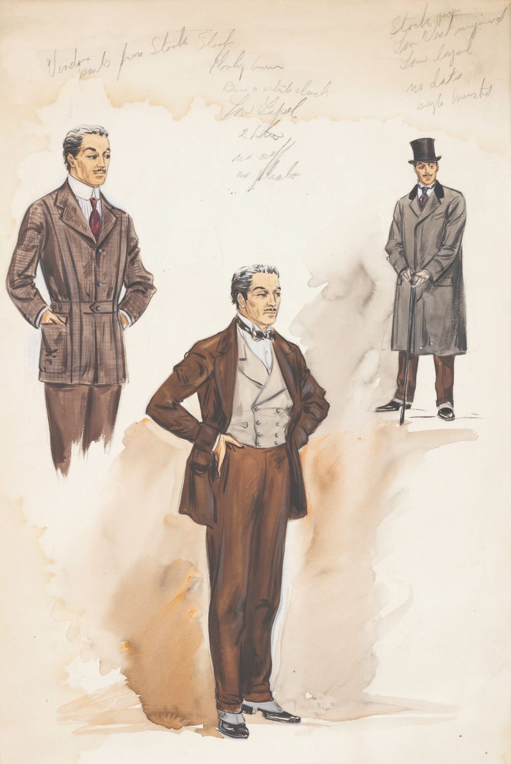 (United Artists, 1947) A costume design for Charlie Chaplin as Henri Verdox in the black comedy film Monsieur Verdoux. This unusual turn for Chaplin's career, which he produced and directed, casts him as a bigamist profit-seeking wife-murderer. The art gives (3) views of the character in variations on a standard outfit. Drew Tetrick, who is credited for wardrobe on the film, signed his name to the back of the piece. Measuring 14.25"x23", the concept is executed in gouache and ink, with pencil notes at the top, and in very good condition, with waviness to the paper from intentional shading.