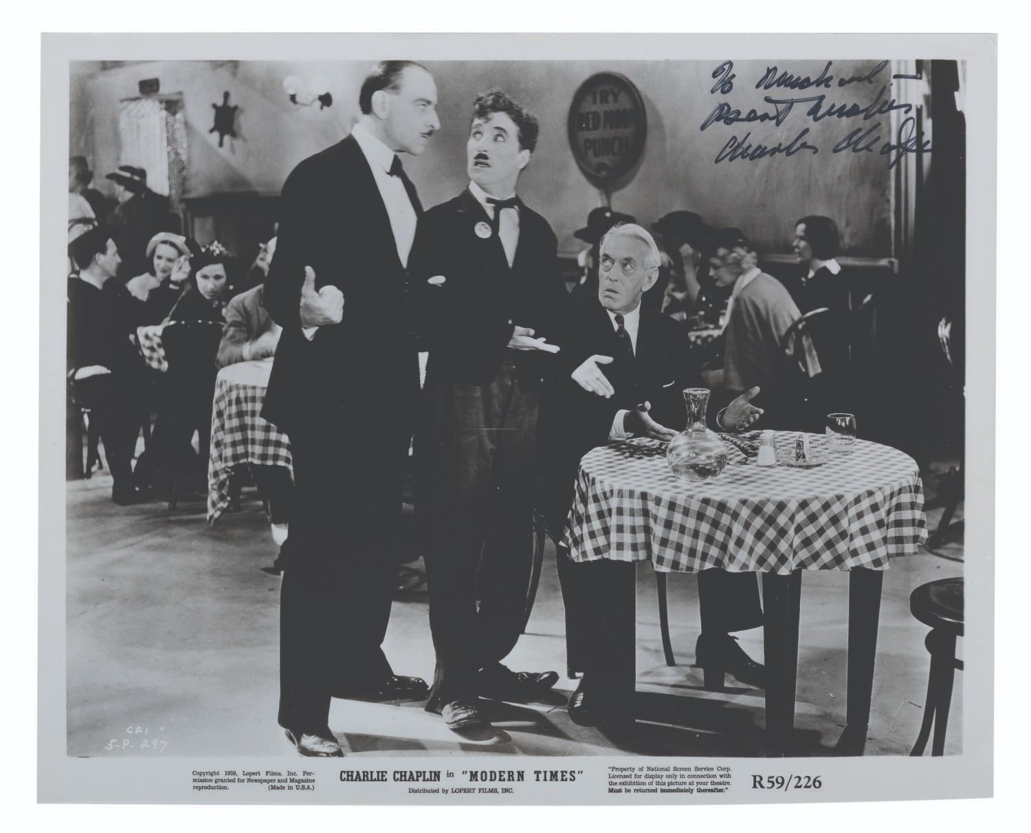 (United Artists, 1959) A photo for the classic comedy Modern Times, signed by the film's legendary star Charlie Chaplin. Chaplin wrote, directed, produced, and starred in this film, the last time he performed his iconic Little Tramp character. Chaplin signed this publicity photo for a 1959 rerelease of the film with dedication. The signature comes with a certificate of authentication by PSA/DNA. Measuring 8"x10", the photo with autograph is in very good condition, with slight wear, including very slight creasing mainly to the top border.
