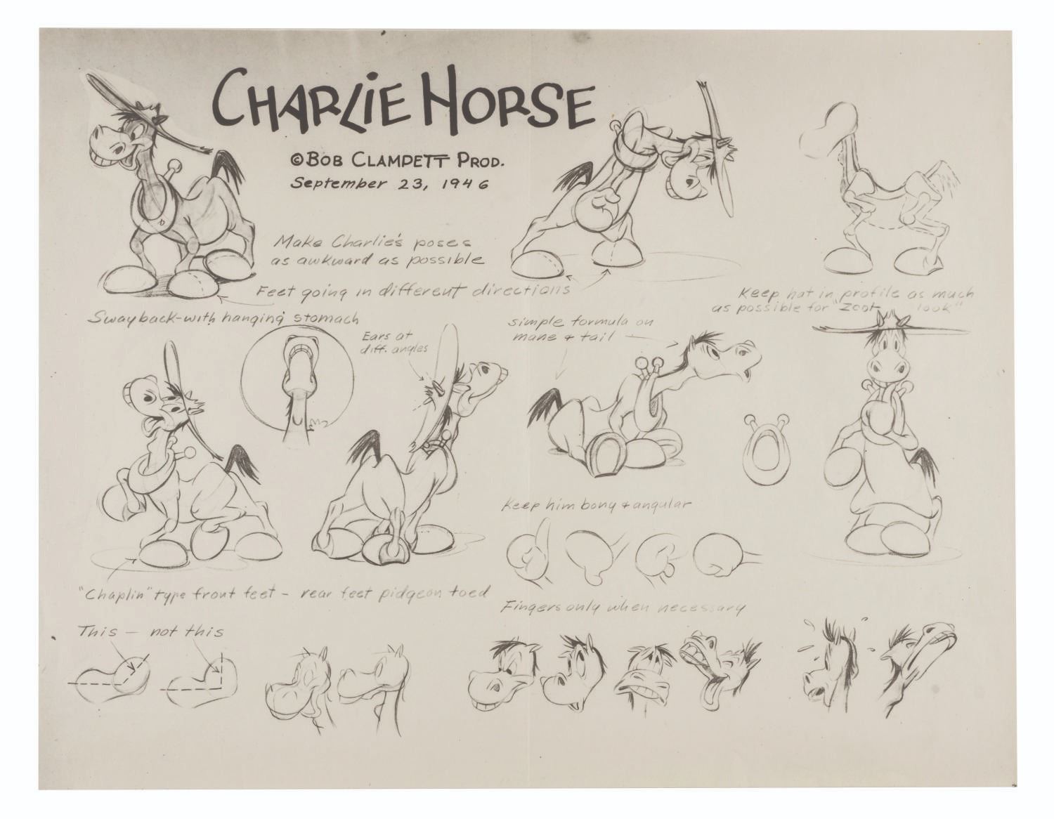 (Clampett, 1946) A character model sheet of Bob Clampett’s Charlie Horse, star of “It’s a Grand Old Nag.” Model sheets such as this were distributed to animators and crew working on the film to ensure character design continuity. Measuring 11” x 14”, the model sheet is in good condition with light wear, creases, and a full vertical fold down the center from production use.