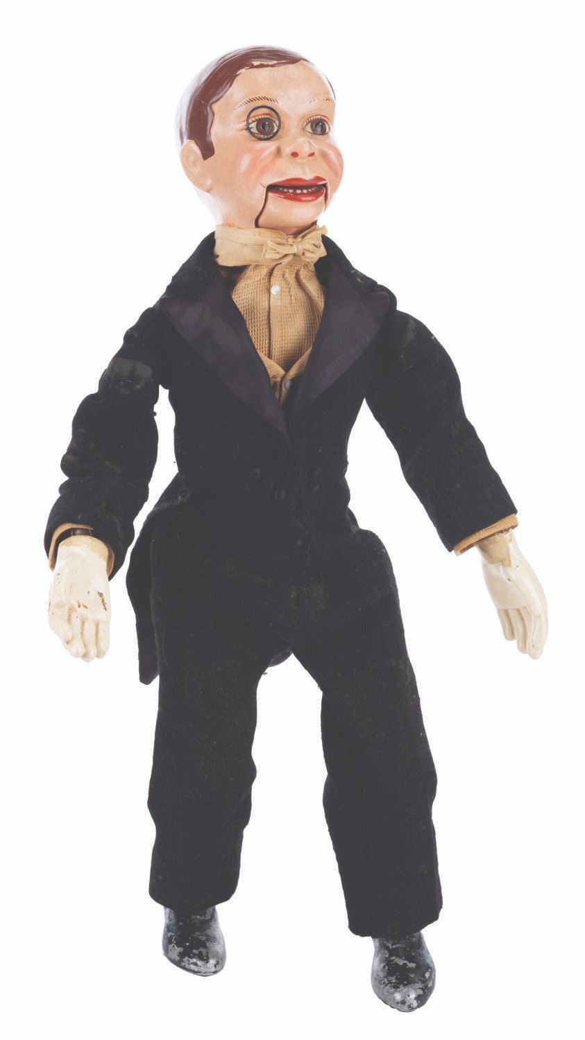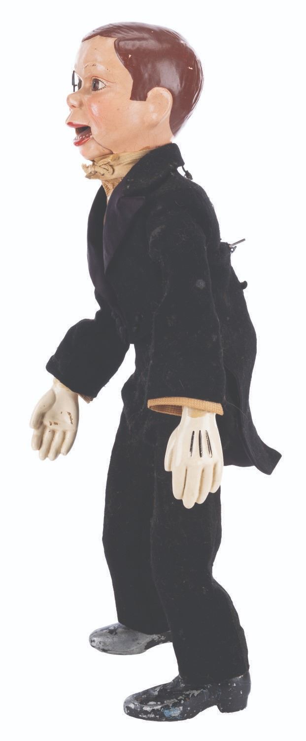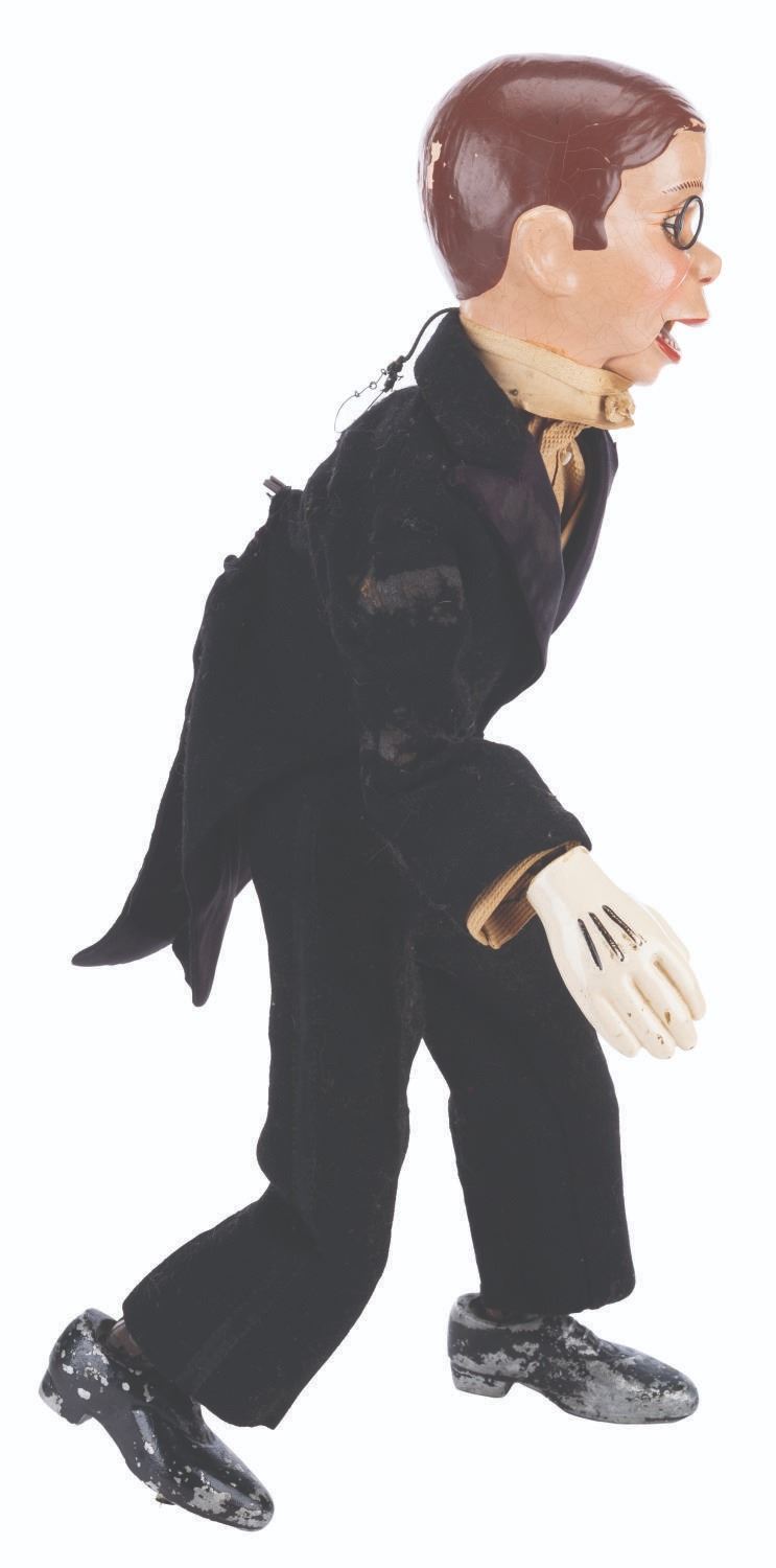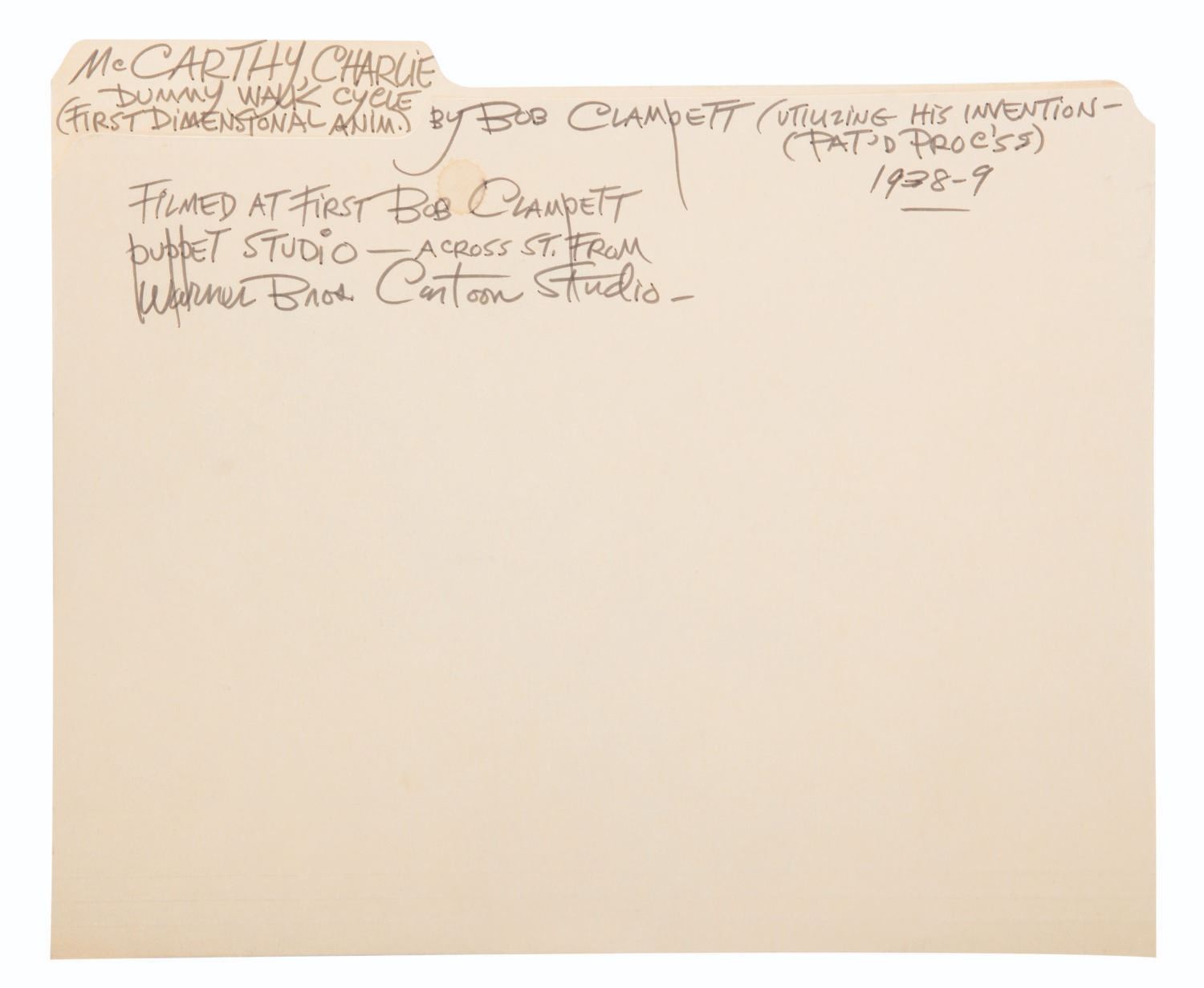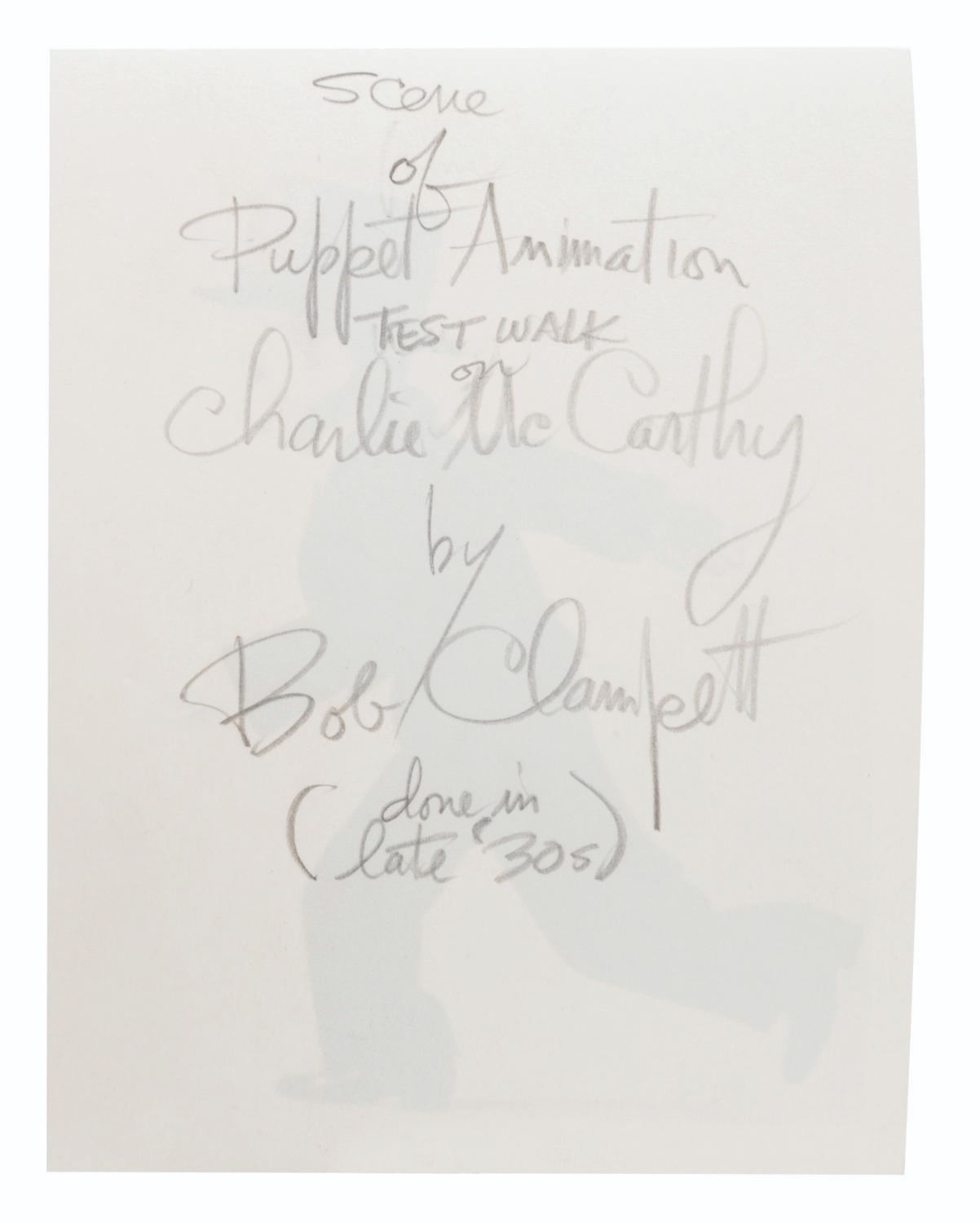 (Clampett, 1930s-60s) A one-of-a-kind stop-motion puppet of Charlie McCarthy, paired with a walk cycle photo. The puppet with a metal interior armature and composition head, was used by Bob Clampett for a walk cycle test at his first studio in the late 1930s, with the accompanying photo capturing a moment from the test. Measuring 5.5” x 6.5” x 19” tall, the armature puppet is in good poseable condition with stains, paint loss, wear, oxidation to the metal from age, and heavy crazing to the head. The 3.5” x 4.5” photo is in good condition with scratches and inscription marks from the reverse visible on the front.