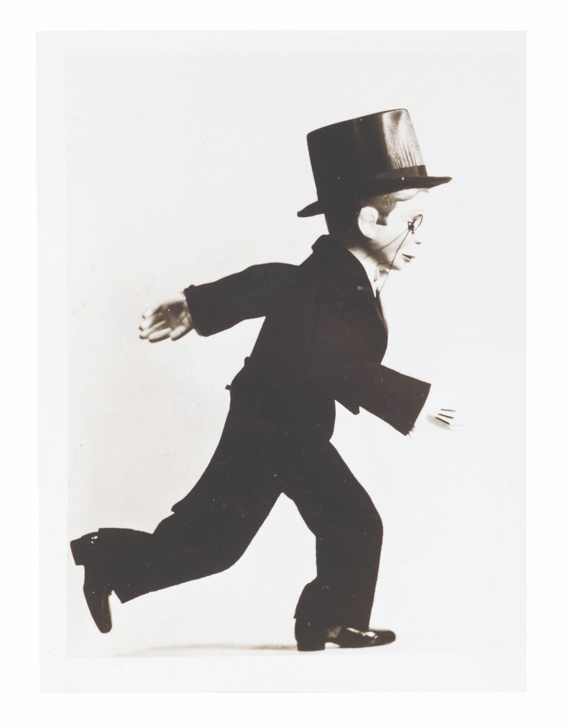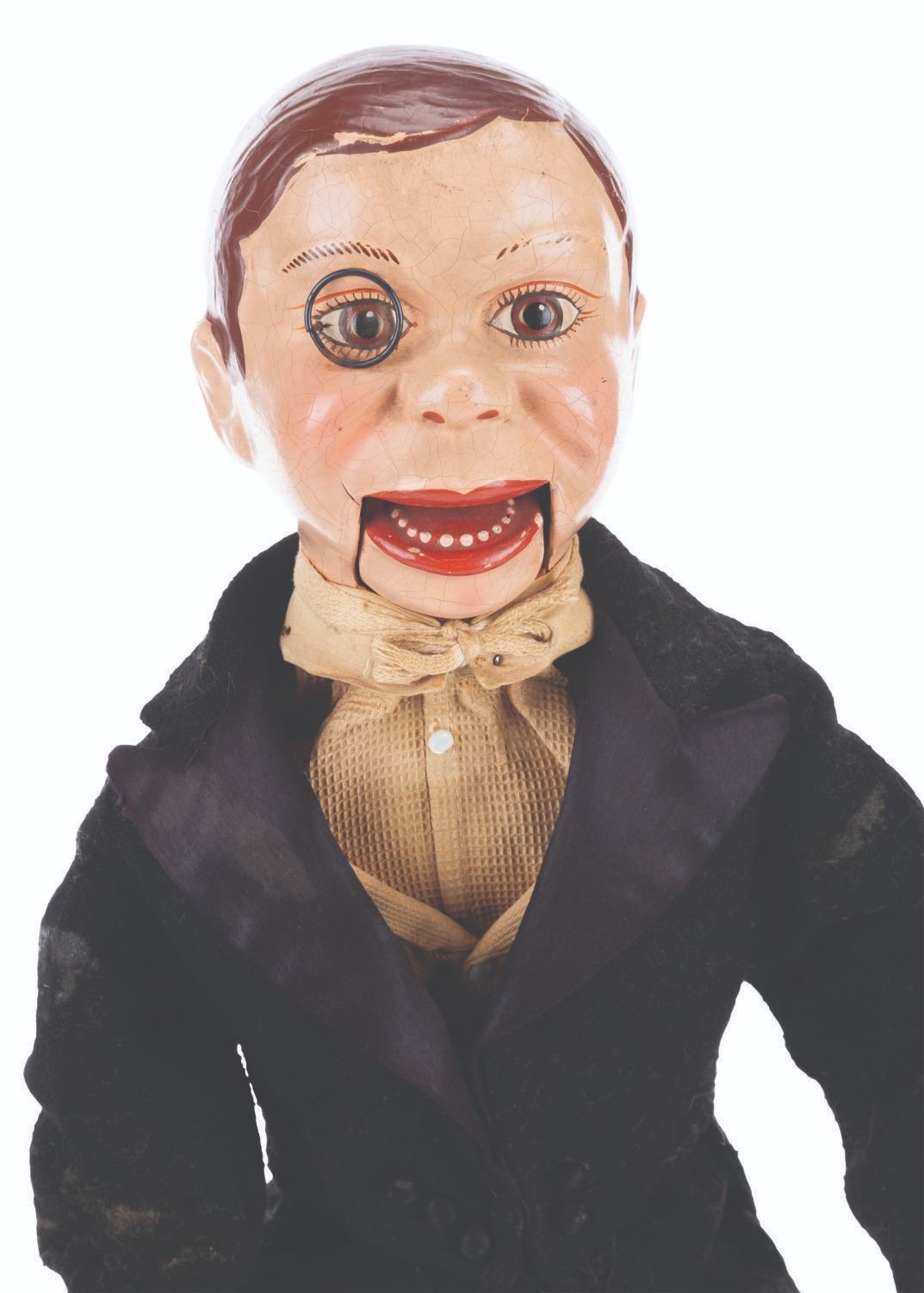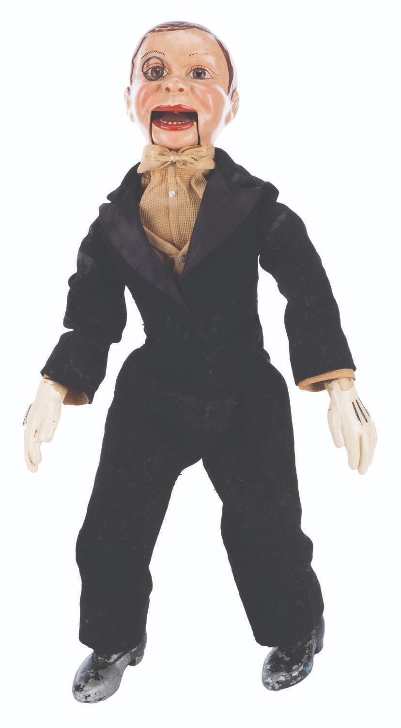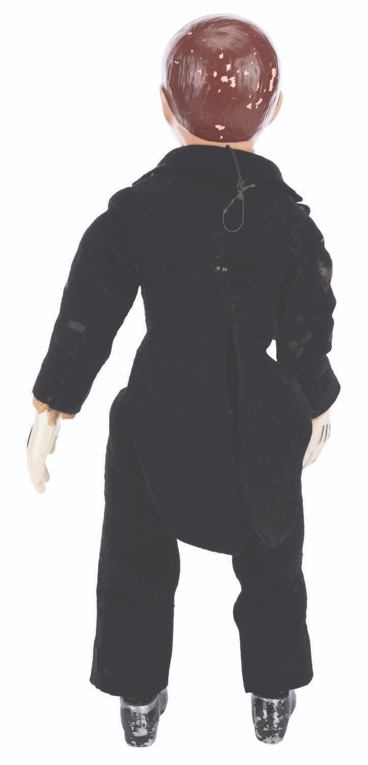 (Clampett, 1930s-60s) A one-of-a-kind stop-motion puppet of Charlie McCarthy, paired with a walk cycle photo. The puppet with a metal interior armature and composition head, was used by Bob Clampett for a walk cycle test at his first studio in the late 1930s, with the accompanying photo capturing a moment from the test. Measuring 5.5” x 6.5” x 19” tall, the armature puppet is in good poseable condition with stains, paint loss, wear, oxidation to the metal from age, and heavy crazing to the head. The 3.5” x 4.5” photo is in good condition with scratches and inscription marks from the reverse visible on the front.