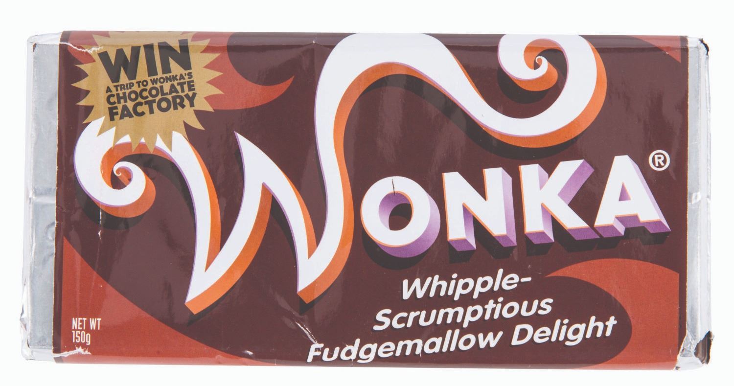 (Warner Bros., 2005) A Wonka Whipple-Scrumptious Fudgemallow Delight candy bar prop from Tim Burton's Charlie and the Chocolate Factory. Measuring 7.5"x3.5"x.5", this mixed media prop is in good production-used condition with creases, tears, and wear to the wrapper and foil elements.