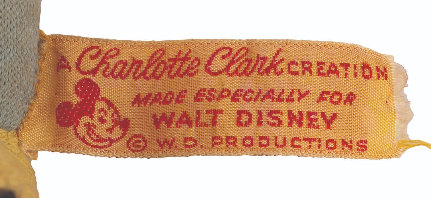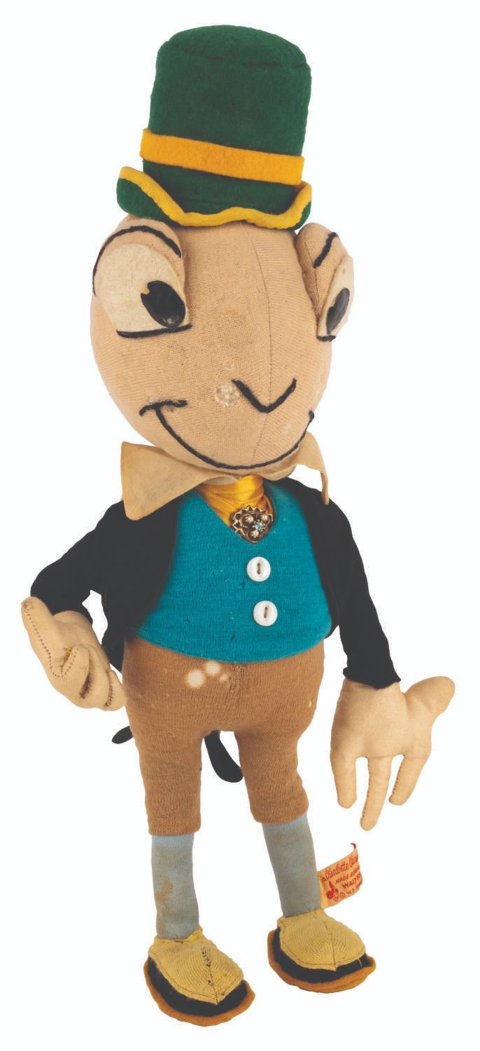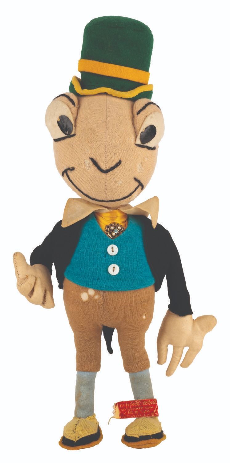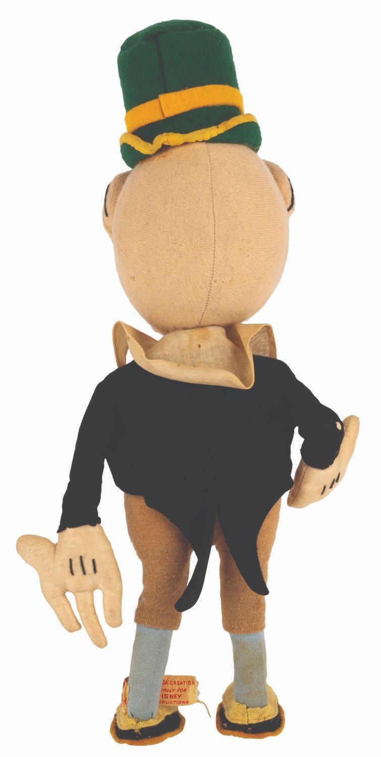 (Charlotte Clark, 1940s) A rare Jiminy Cricket Doll by Charlotte Clark. The 15" tall doll came from Clark's personal collection and was gifted to relatives in the 1940s. Jiminy is covered in several different types of fabric including a large green felt hat with yellow hat band. The eyes are separate large pieces upon which are mounted white felt cut-outs, each accented by black oilcloth. There are various stitching accents on the face as well as the back of each hand. There are 4 small holes on the back of his pants plus 4 or 5 on the front although most of these are hidden by his turquoise shirt. The holes range from 1/8” to .25”. There are additional holes on his face including .25” by his nose, .25” by his left cheek, a pair that are .25” below the mouth and 5 that are smaller and scattered. His black jacket has just 3 tiny holes, mostly on the reverse. Attached to his ankle is a “Charlotte Clark Creation” tag with text “Made Especially For Walt Disney ©W.D. Productions.” Overall, the doll presents in good condition, and is one of only two we have ever seen.