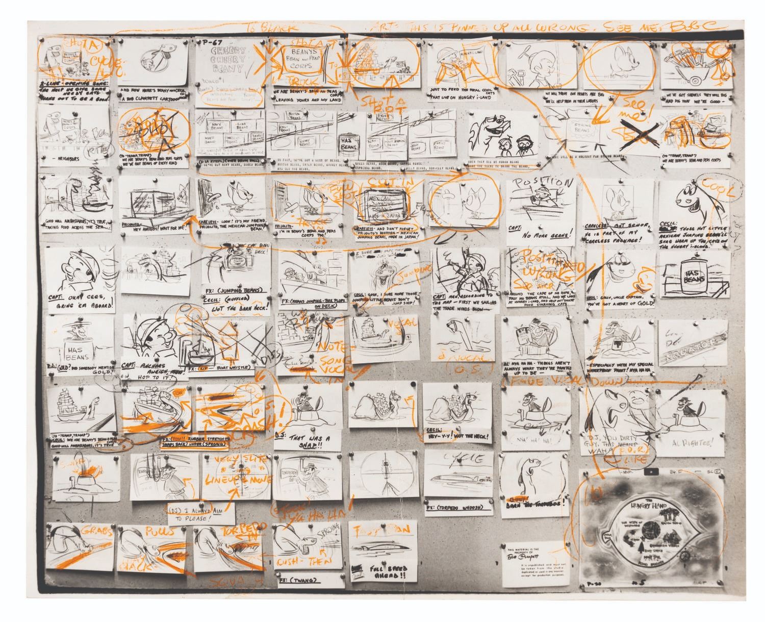 (Clampett, 1962) A photo print of an early storyboard for the “Beany and Cecil” episode, “Cheery Cheery Beany.” The print has hand-written notations in orange grease pencil by Bob Clampett and was used by animators as a reference during production. Measuring 16” x 20”, print displays in good condition with a vertical fold down the center, edge wear from production use, and light warping from age.