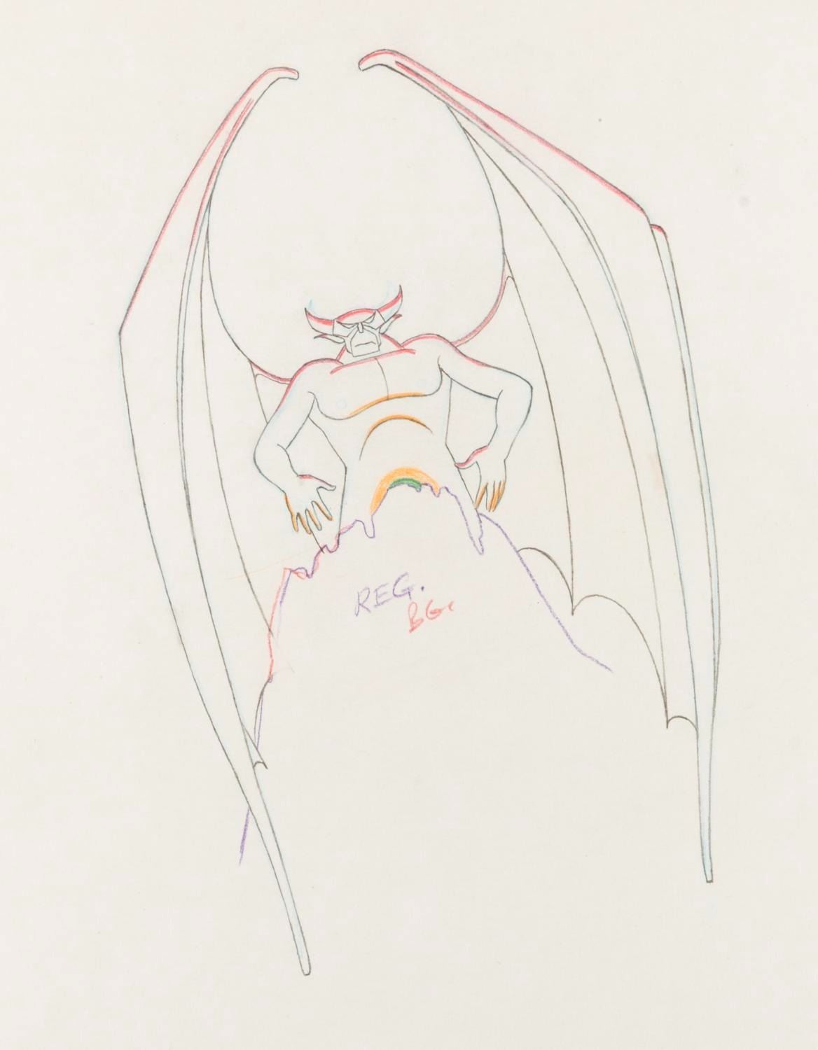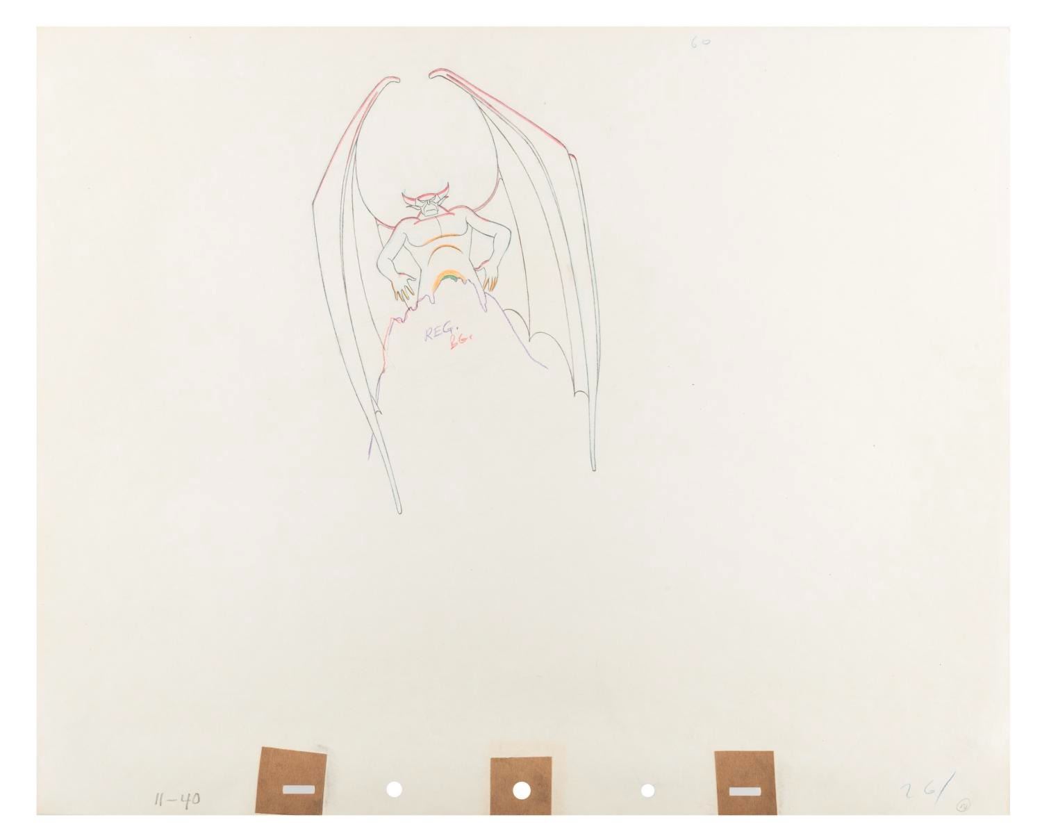 (Disney, 1940) An original production drawing in pencils of Chernabog from the Night on Bald Mountain sequence of “Fantasia.” With an image size of 4.5” x 7.25” on 12.5” x 15.5” animation paper, the drawing is in very good condition with light wear and color shift to the paper from production use and age.