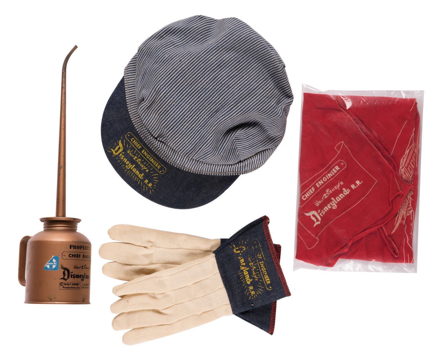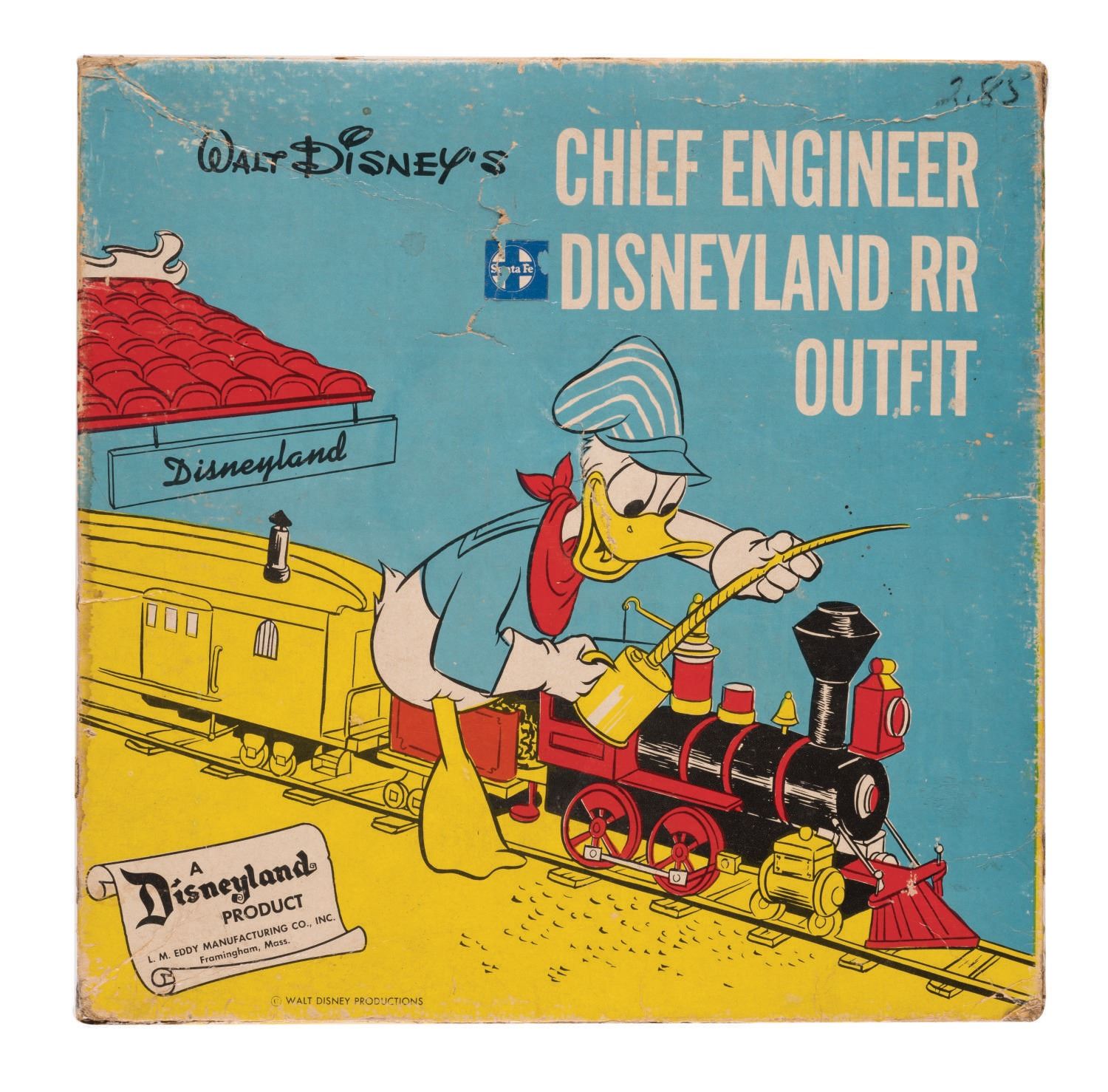 (Disneyland, 1956) A Chief Engineer Disneyland RR Outfit by L.M. Eddy, in the original box. The set includes an oil can, gloves, scarf, and hat, each with Disneyland Railroad logo. The box features an illustration of Donald Duck as seen in "Out of Scale", the cartoon inspired by Walt Disney's own love of miniature railroading. The pieces measure various sizes and are in very good condition overall, with scuffs and wear to the oil can. Measuring 10"x10" and 2.5", the box is in good condition with creases to surface, tears along some edges and corners, and typical wear throughout from age and handling.