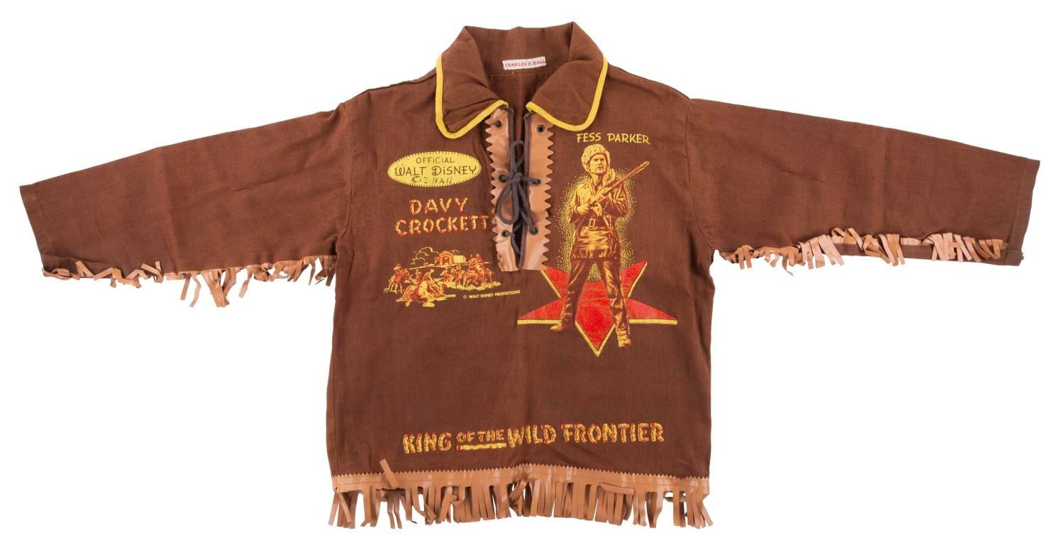 (Cooper-Iskin, 1950s) The shirt from an Official Walt Disney's Davy Crockett playsuit, with vinyl fringe and featuring Fess Parker's likeness. Measuring 18.5” long, the shirt displays in very good condition, with very light wear to the vinyl fringe, and a name written on the “Walt Disney” emblem on the front.