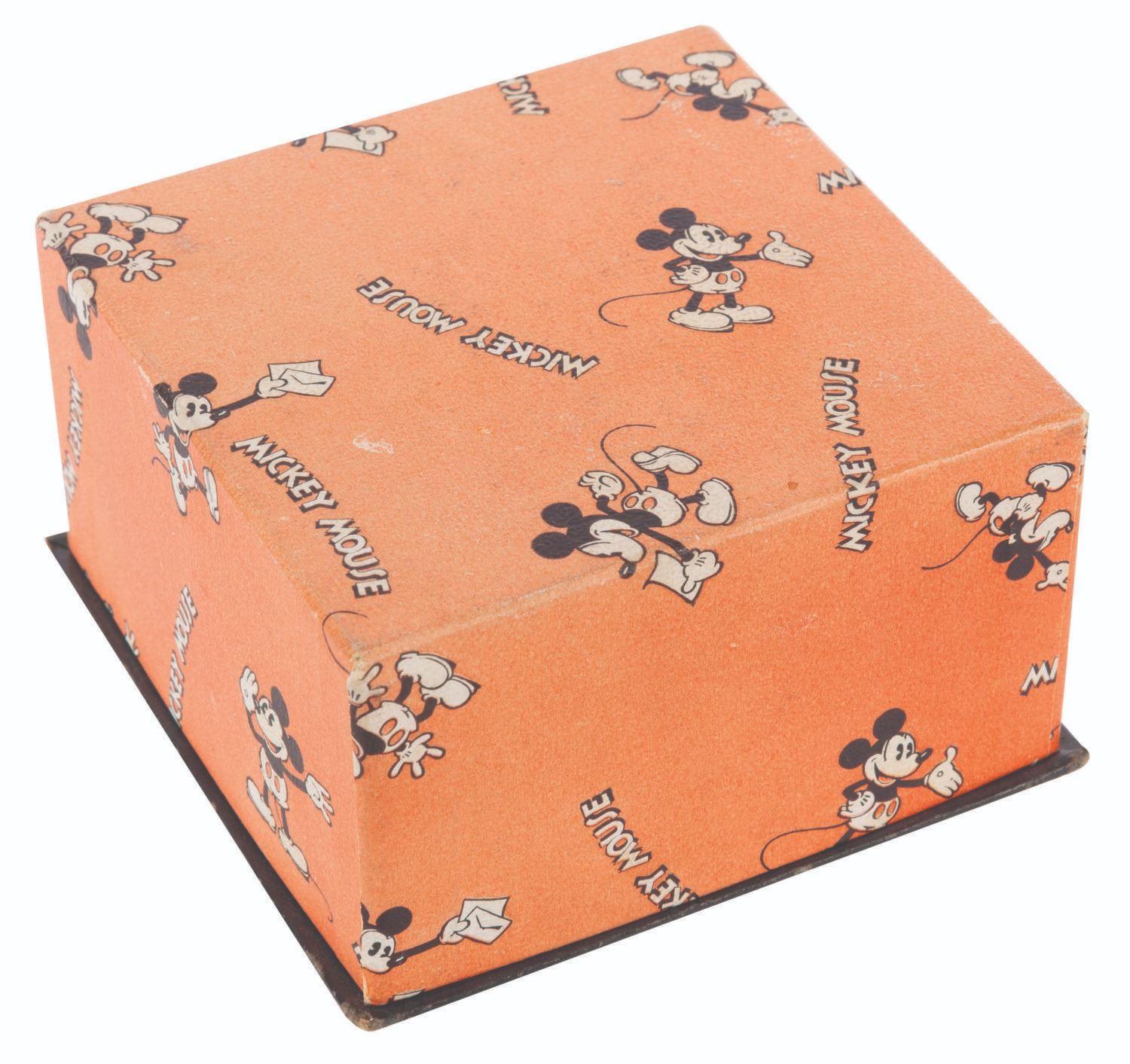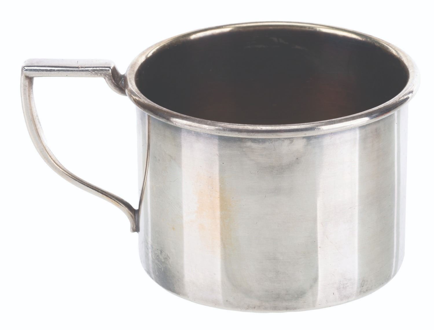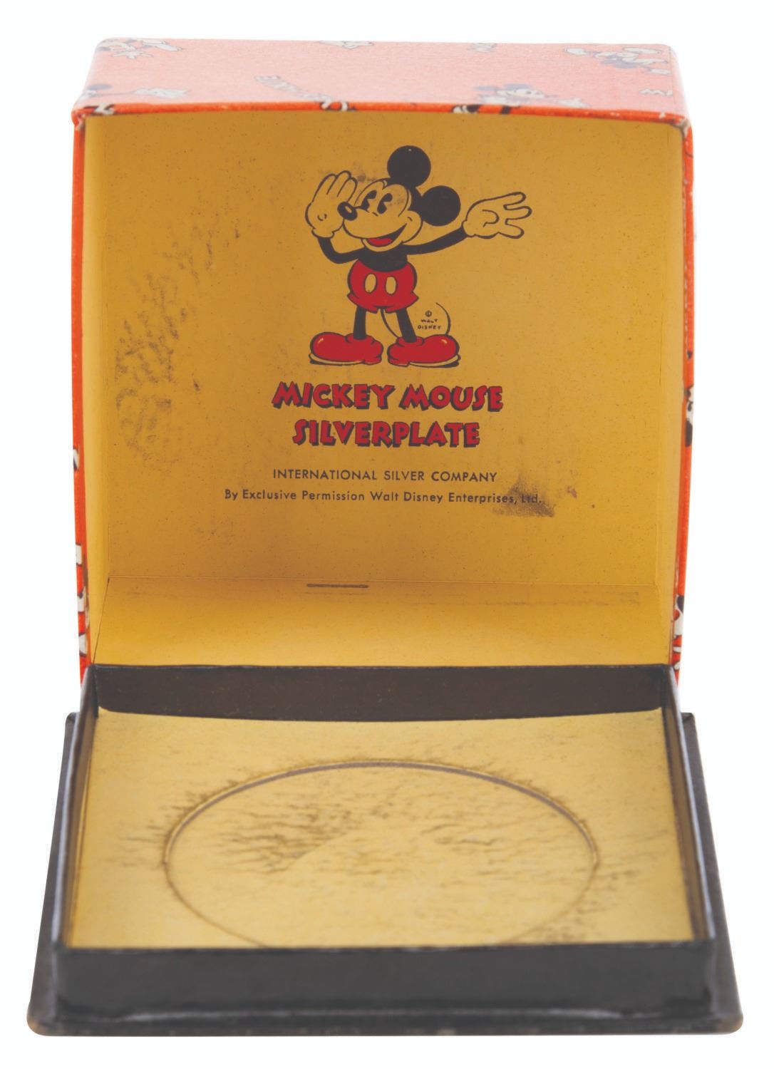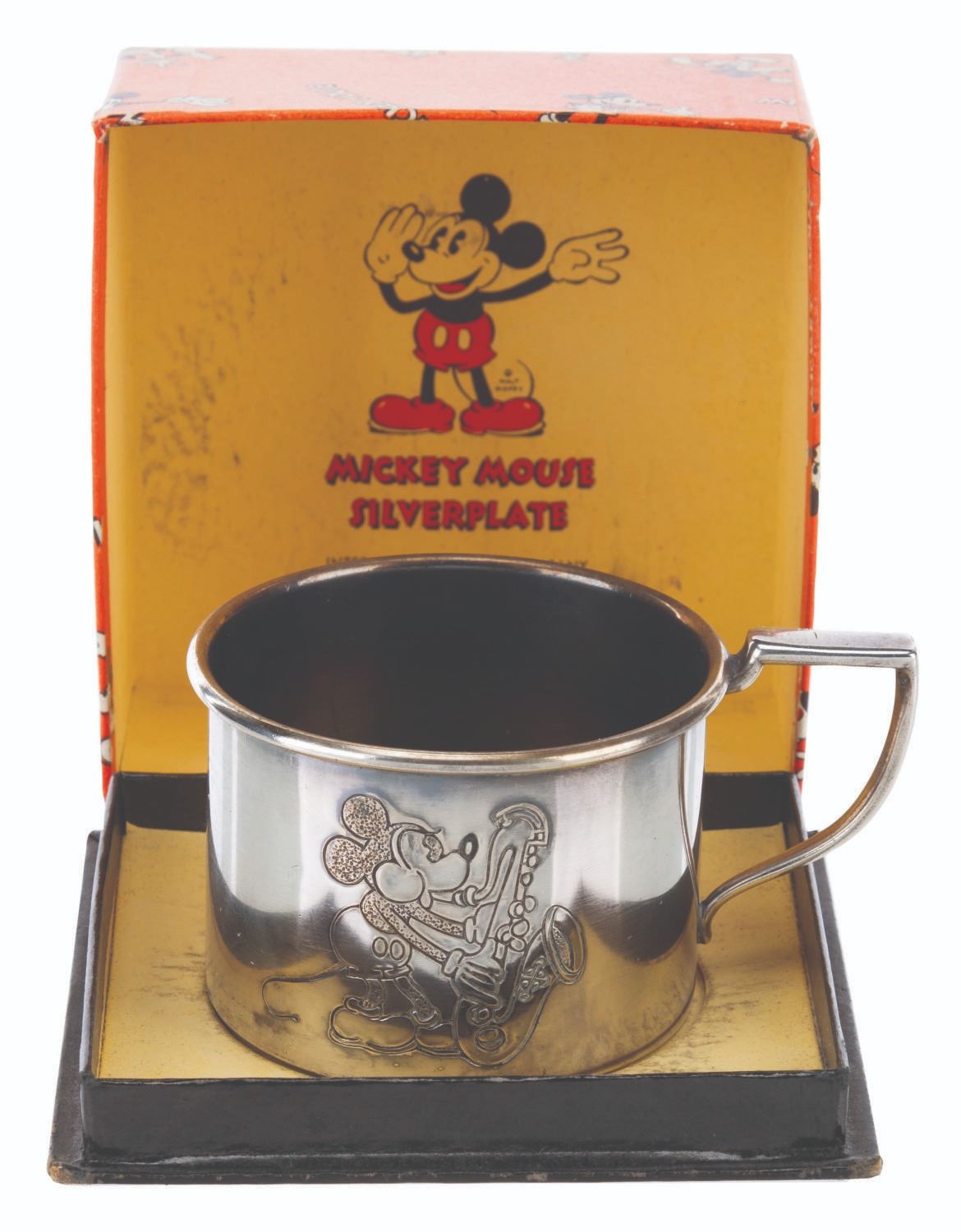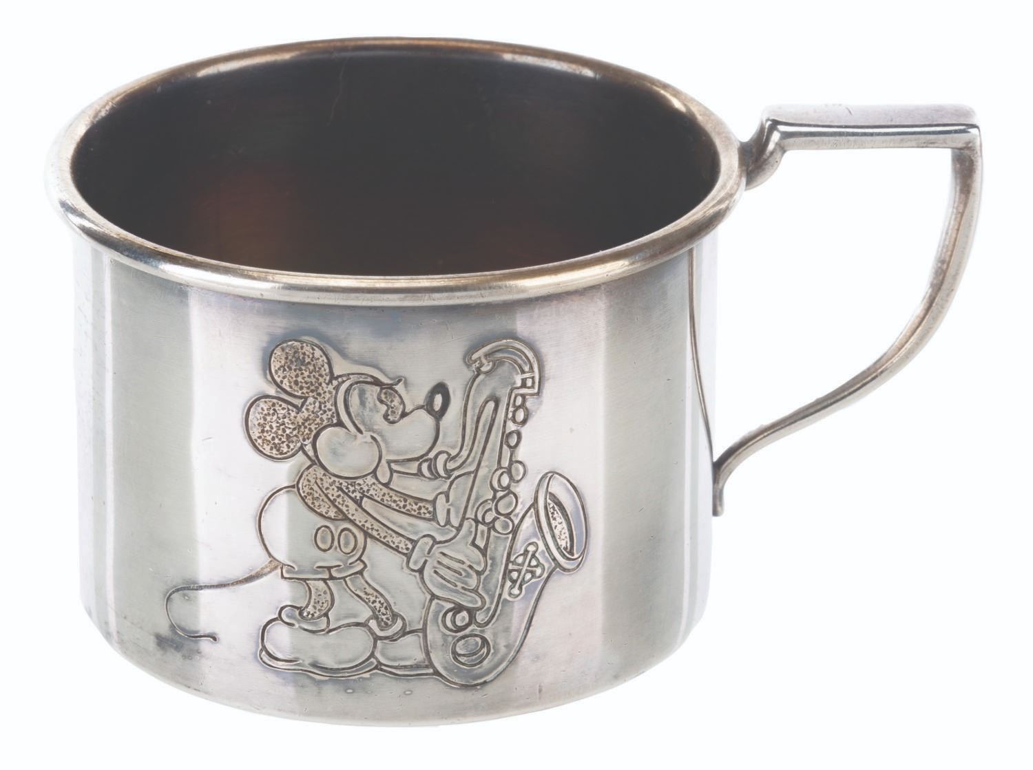 (International Silver Co., 1930s) A silver-plated cup featuring an engraving of an early Mickey Mouse with the original box. Measuring 2.5" x 3.5" x 1.75" in its 3.5" x 3.5" x 2" box, the cup is in very good condition with light tarnishing, oxidation, and a small dent on the underside. The box is in good condition with fading, edge wear, and soiling.