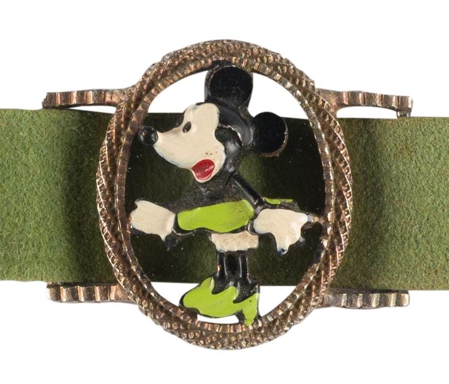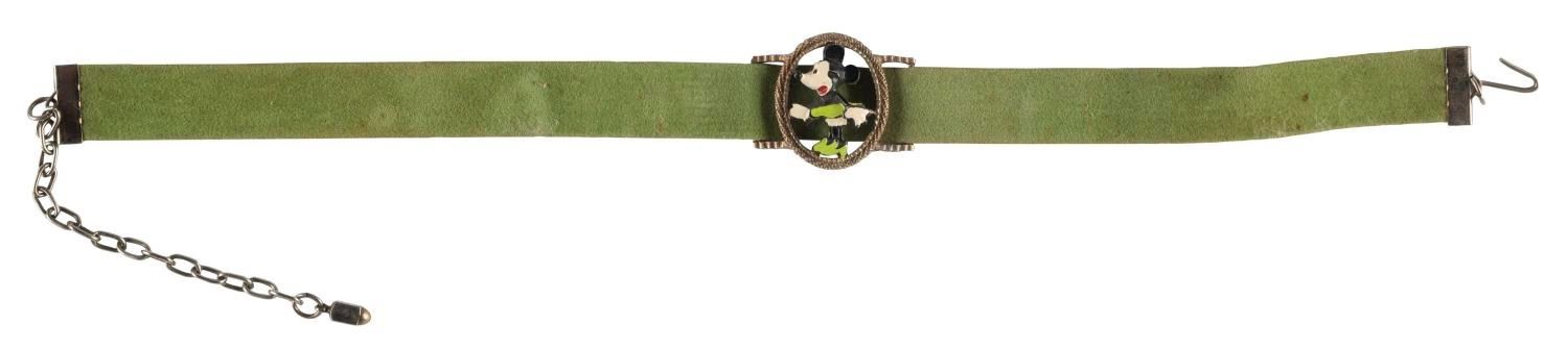 (1960s) A small choker-style necklace with an 11" fabric strap with a chain and a 1" plastic painted Minnie Mouse Brooch. The piece is in very good condition with light wear from use.
