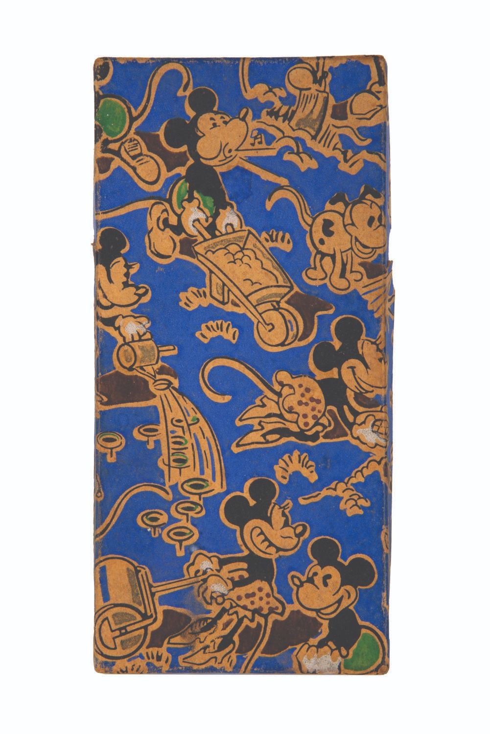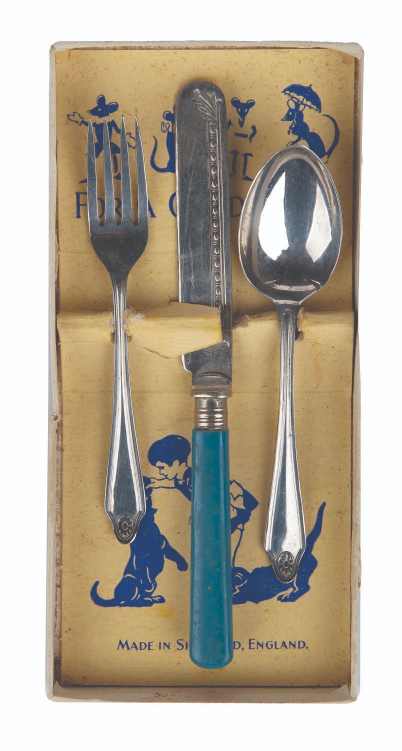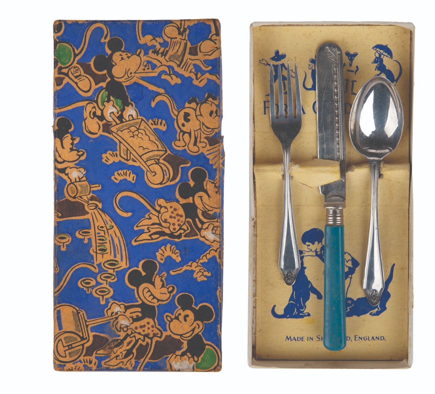 (Disney, 1930s) A set of nickel silverware "For a Good Child, " in a box featuring Mickey and Minnie Mouse. The fork, knife, and spoon are child-sized and made in Sheffield, England. The box measuring 3.5 " x 7.25 " x 0.75 " is in very good condition with edge and handling wear, and light soiling and wear to the interior card. The silver wear measuring from 4.75 " to 6.5 " long is in good condition with scratches and wear from use.